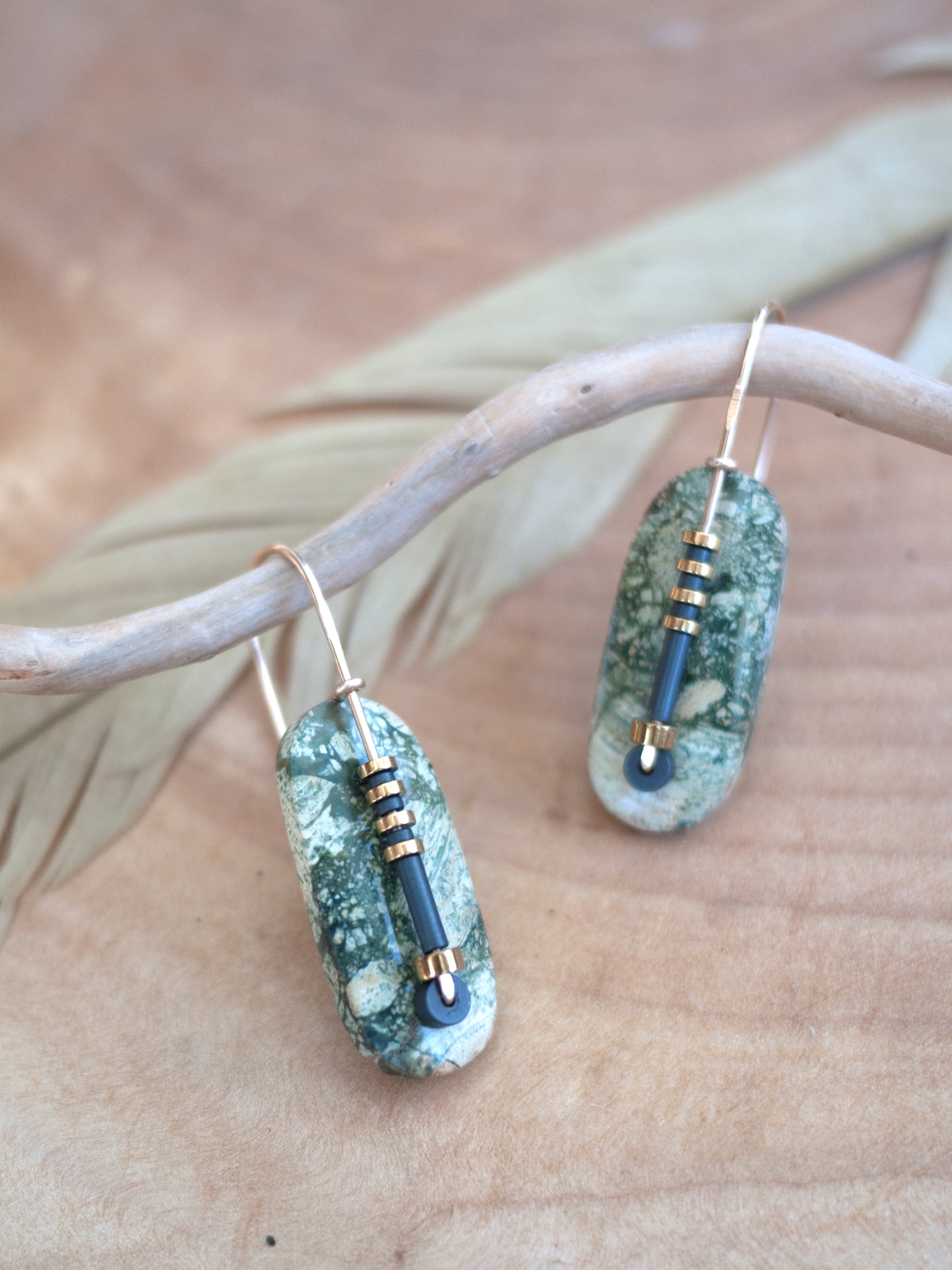 These beautiful brecciated jasper stones were hand cut for my designs in a collaboration with a lapidary artist from Indonesia. Yellow gold fill wire creates an arched ear wire. A line of hematite beads on the front of the stone add sculptural interest. The wire is adorned with gold and grey hematite beads. Earrings come with rubber backings.