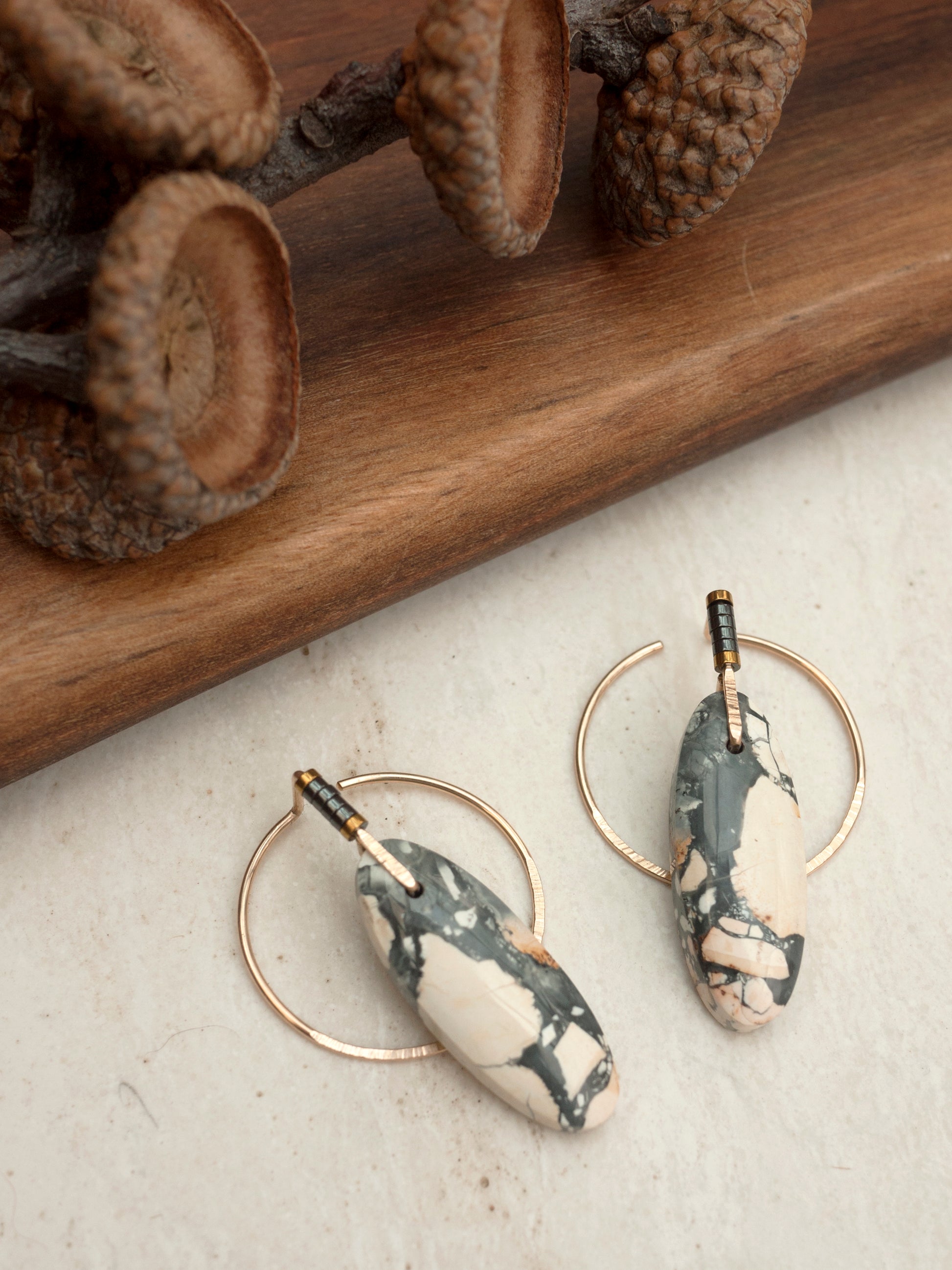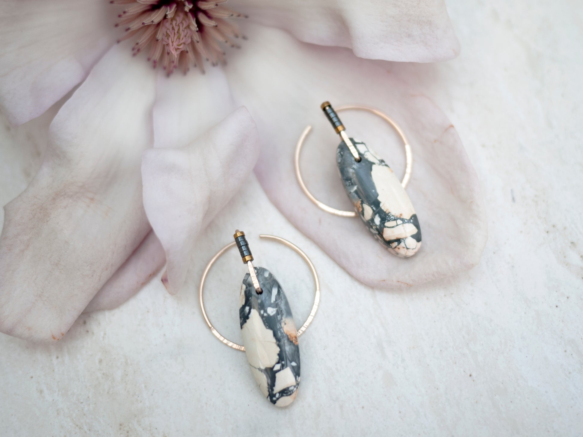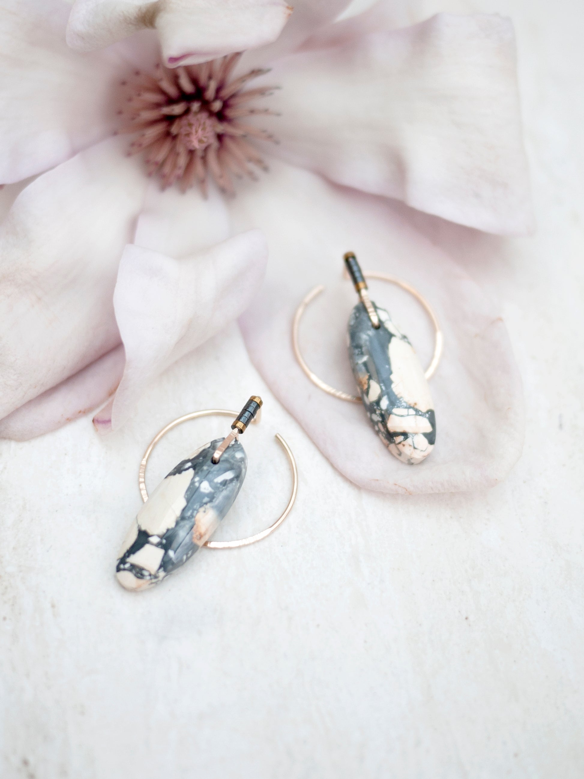 These beautiful maligano jasper stones were hand cut for my designs in a collaboration with a lapidary artist from Indonesia. The ear jacket is a circle shape, which can be threaded through the ear for a unique look. The gold fill wire is hammered for sparkle and adorned with hematite beads. Earrings come with rubber backings.