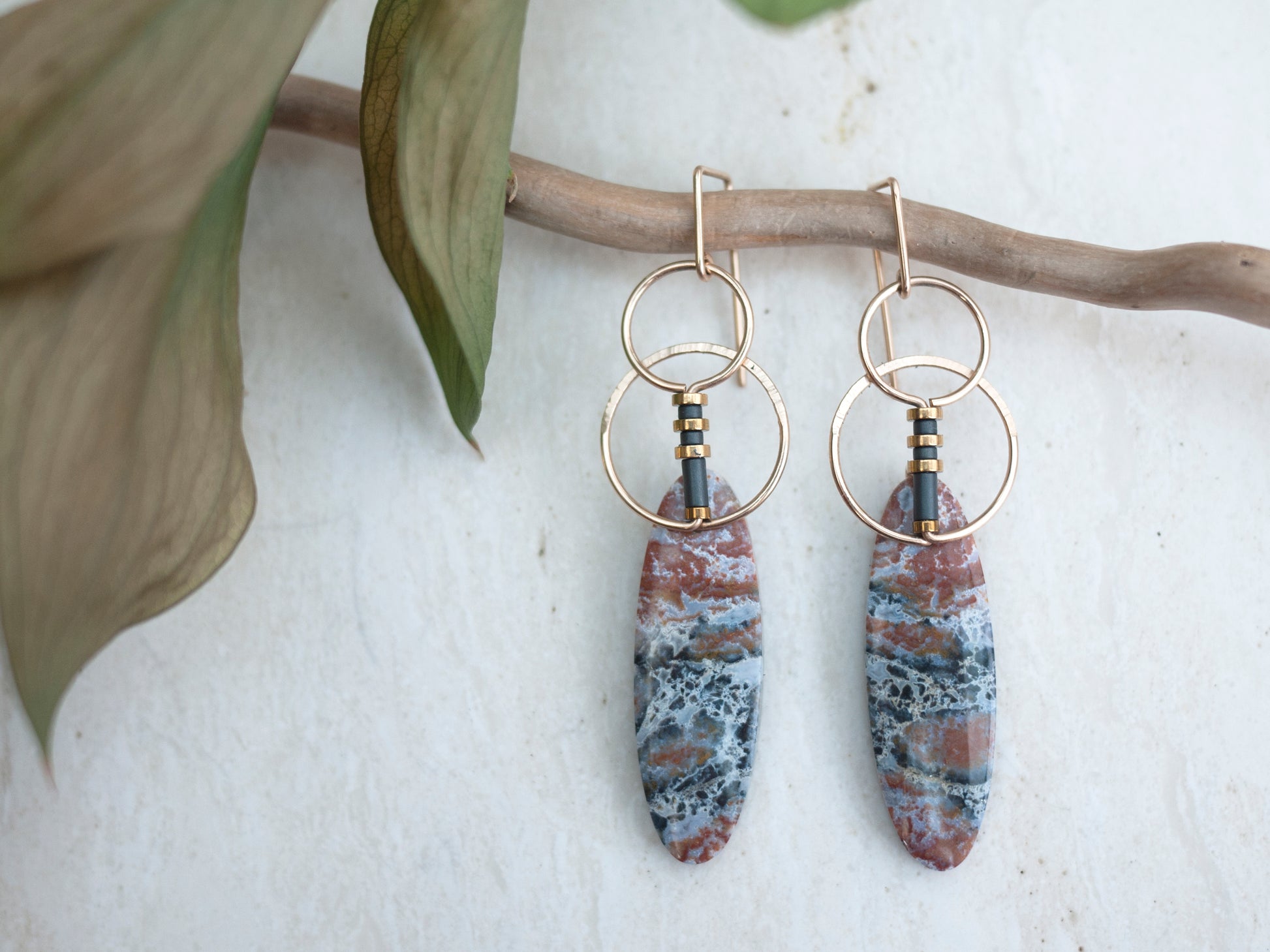 These beautiful river jasper stones were hand cut for my designs in a collaboration with a lapidary artist from Indonesia. Yellow gold fill wire creates a circle motif adorned with gold and grey hematite beads. These earrings have motion and swing from hand made french hooks made from the same gold fill wire. Comes with rubber backings