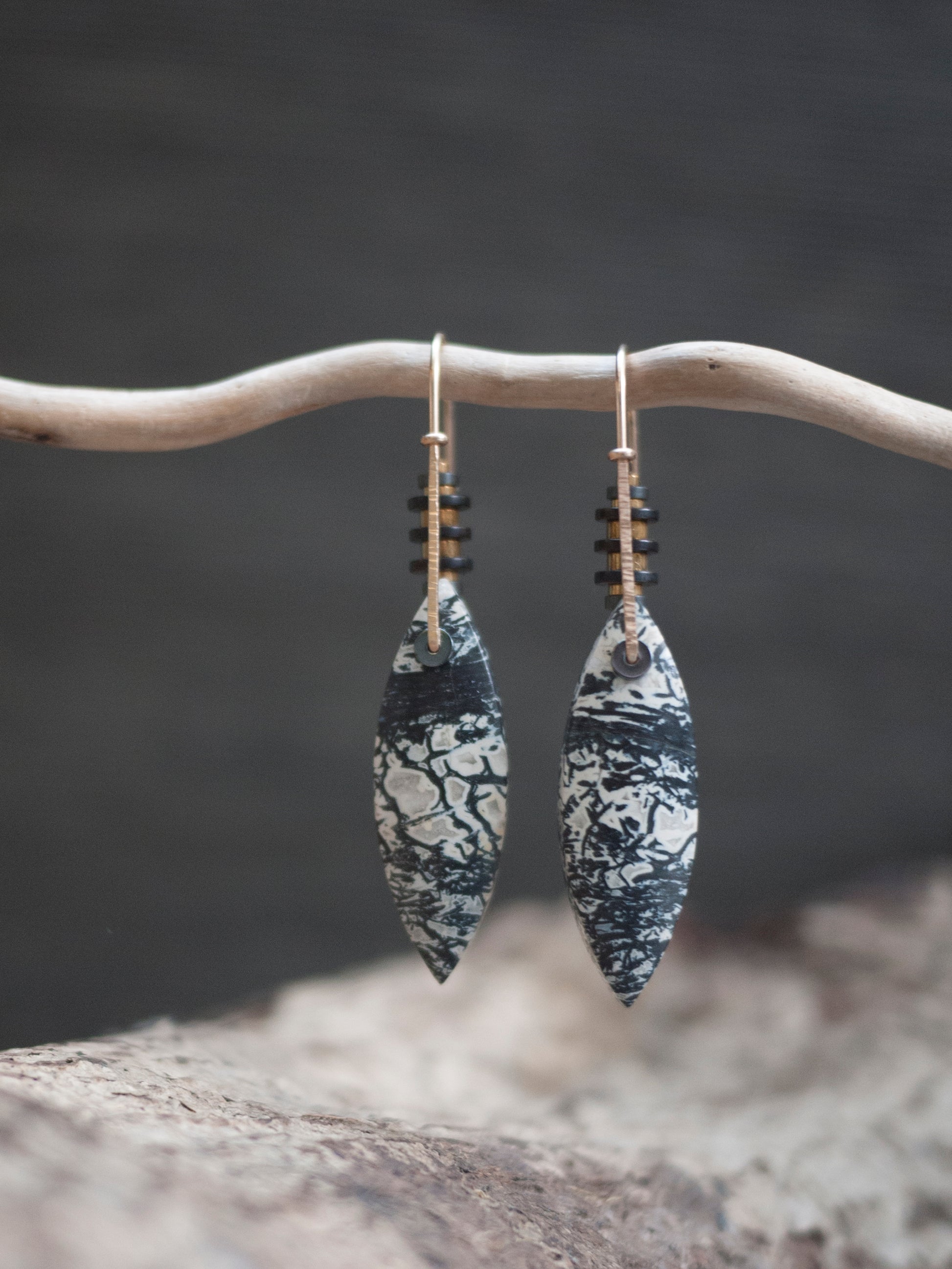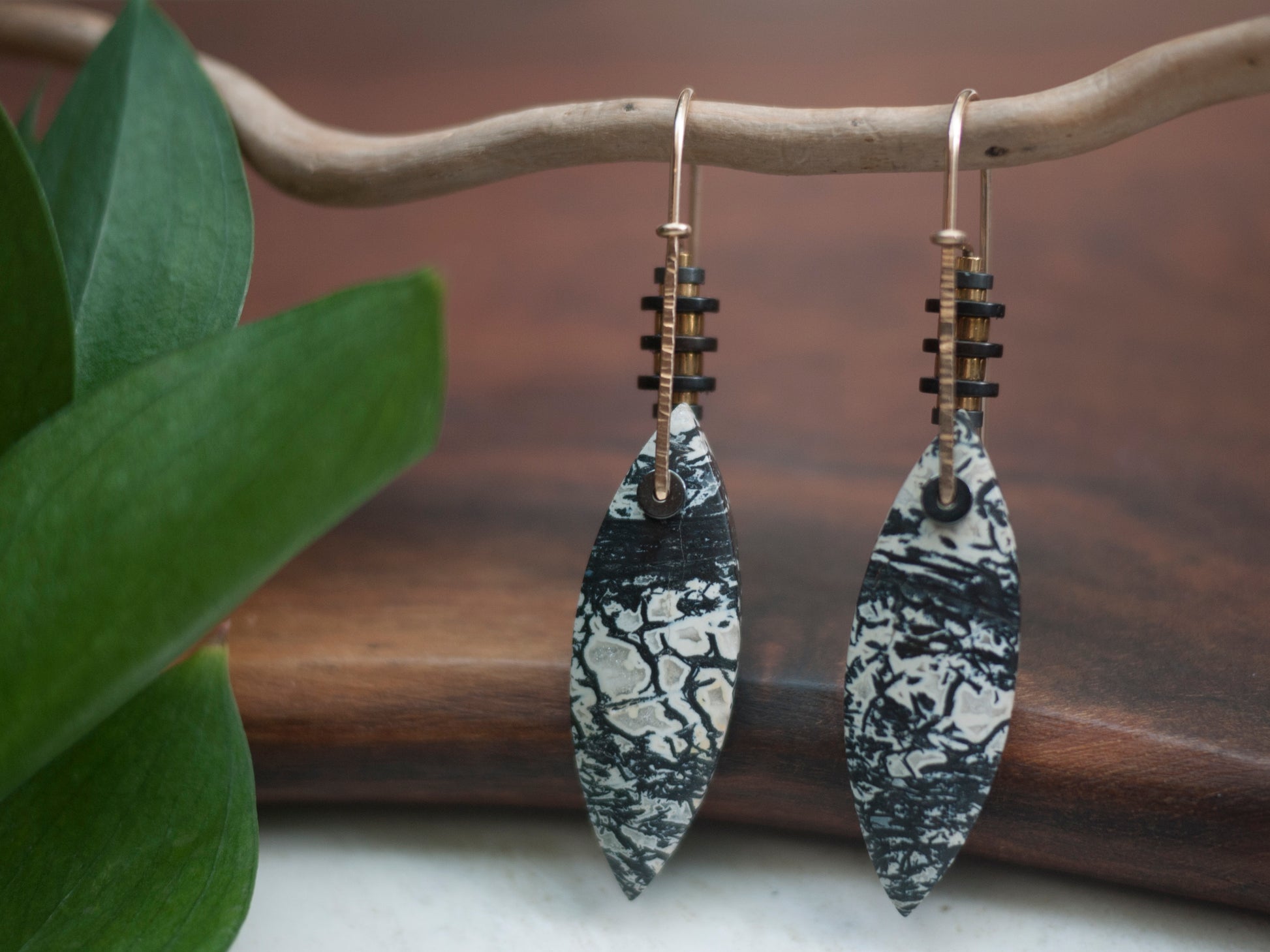 These striking petrified palm wood stones are classic black and white and would make the perfect accessory for any evening wear. They dangle from gold fill wire adorned with hematite beads. Portions of the wire are hammered for sparkle. Earrings come with rubber backings.