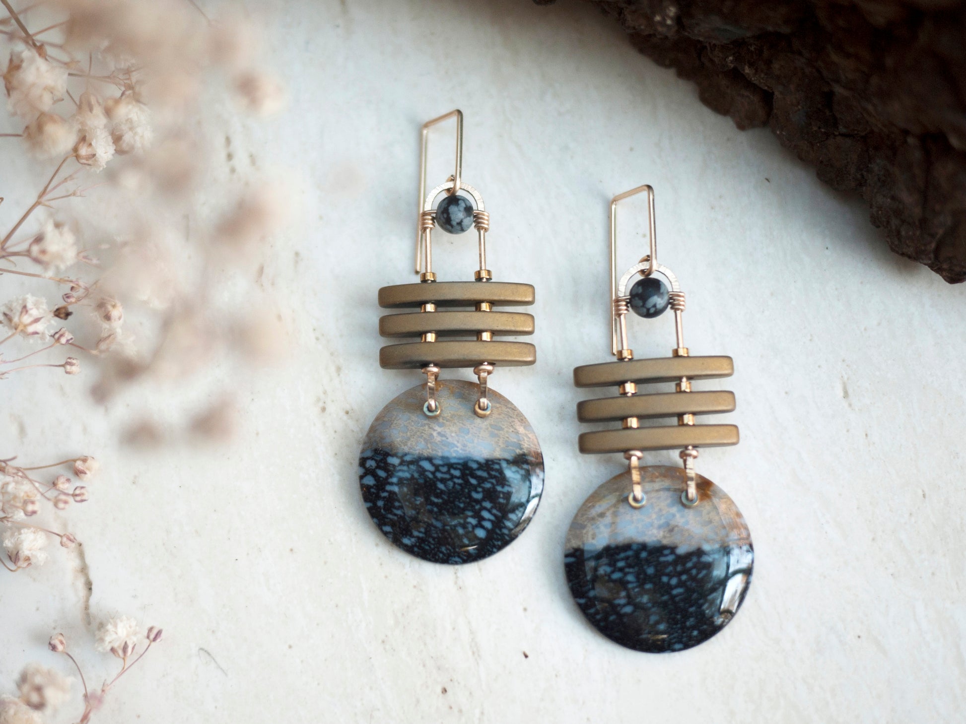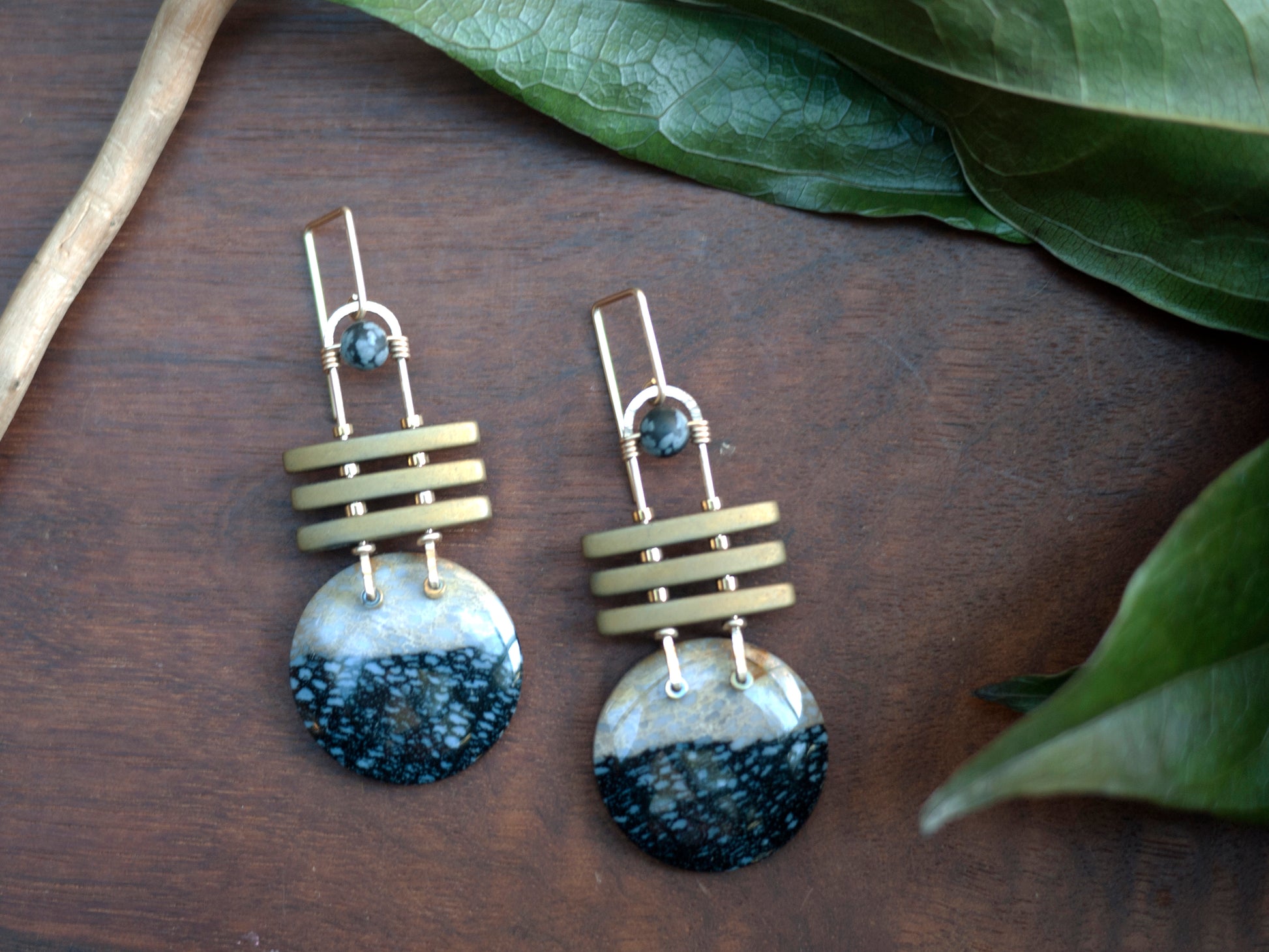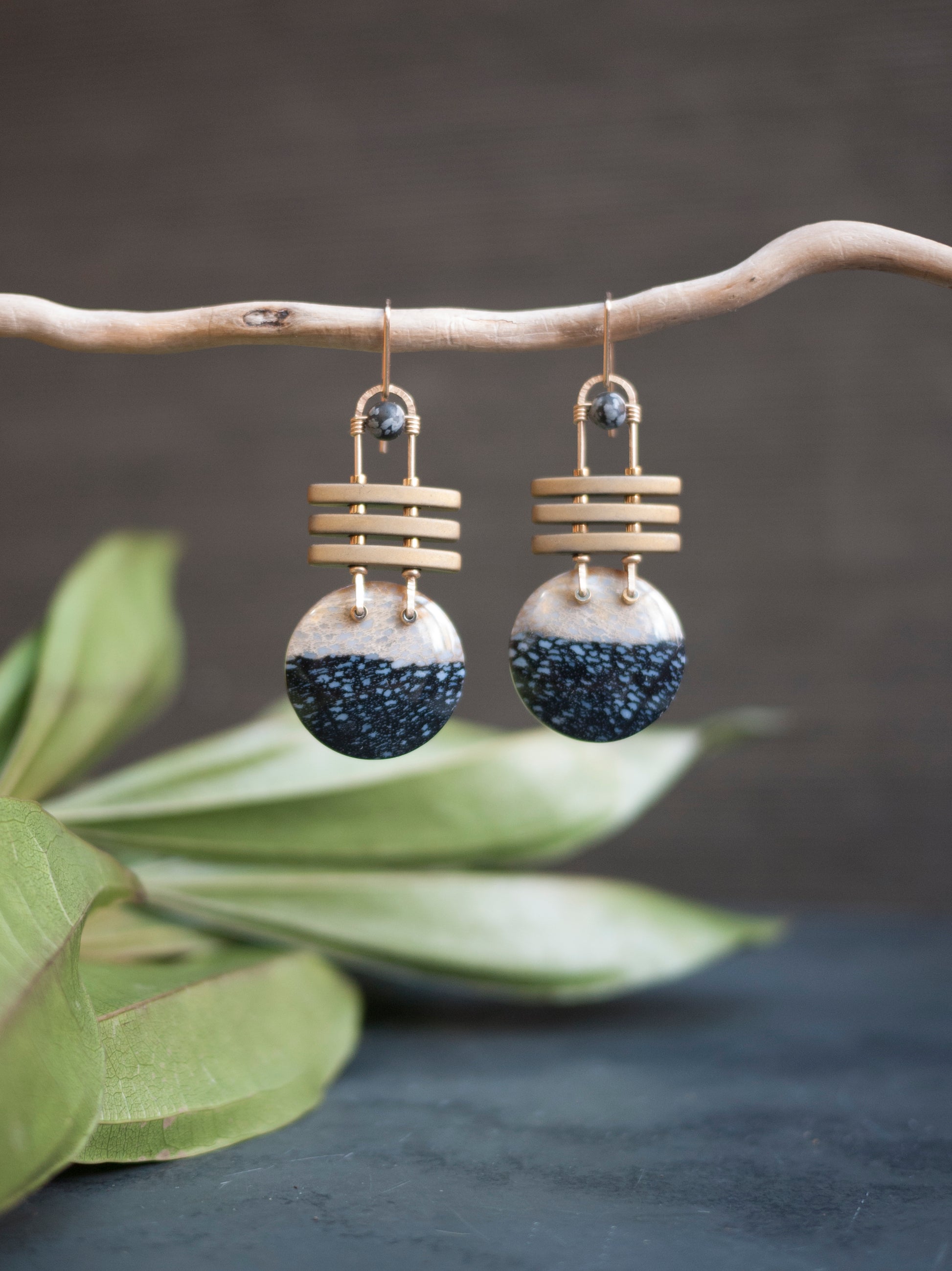 These striking petrified palm wood stones have beautiful pattern and a graphic color break of soft yellow and black. They dangle from gold fill wire adorned with hematite beads and snowflake jasper. The ear wires come with rubber backings