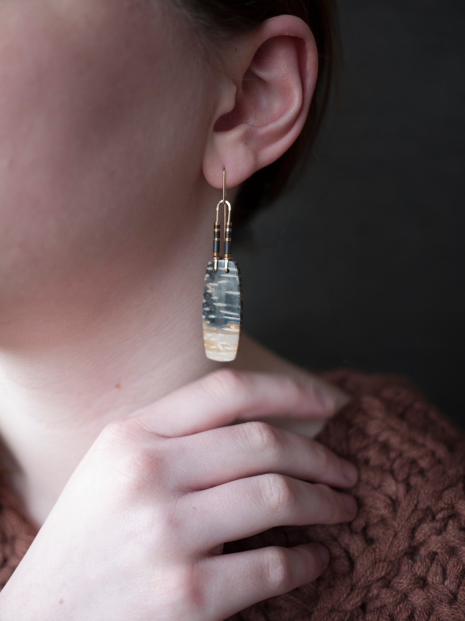 These striking petrified palm root stones have a beautiful pattern that reminds me of birchwood bark in a soft yellow and black. They dangle from gold fill wire adorned with hematite beads. The ear wires come with rubber backings