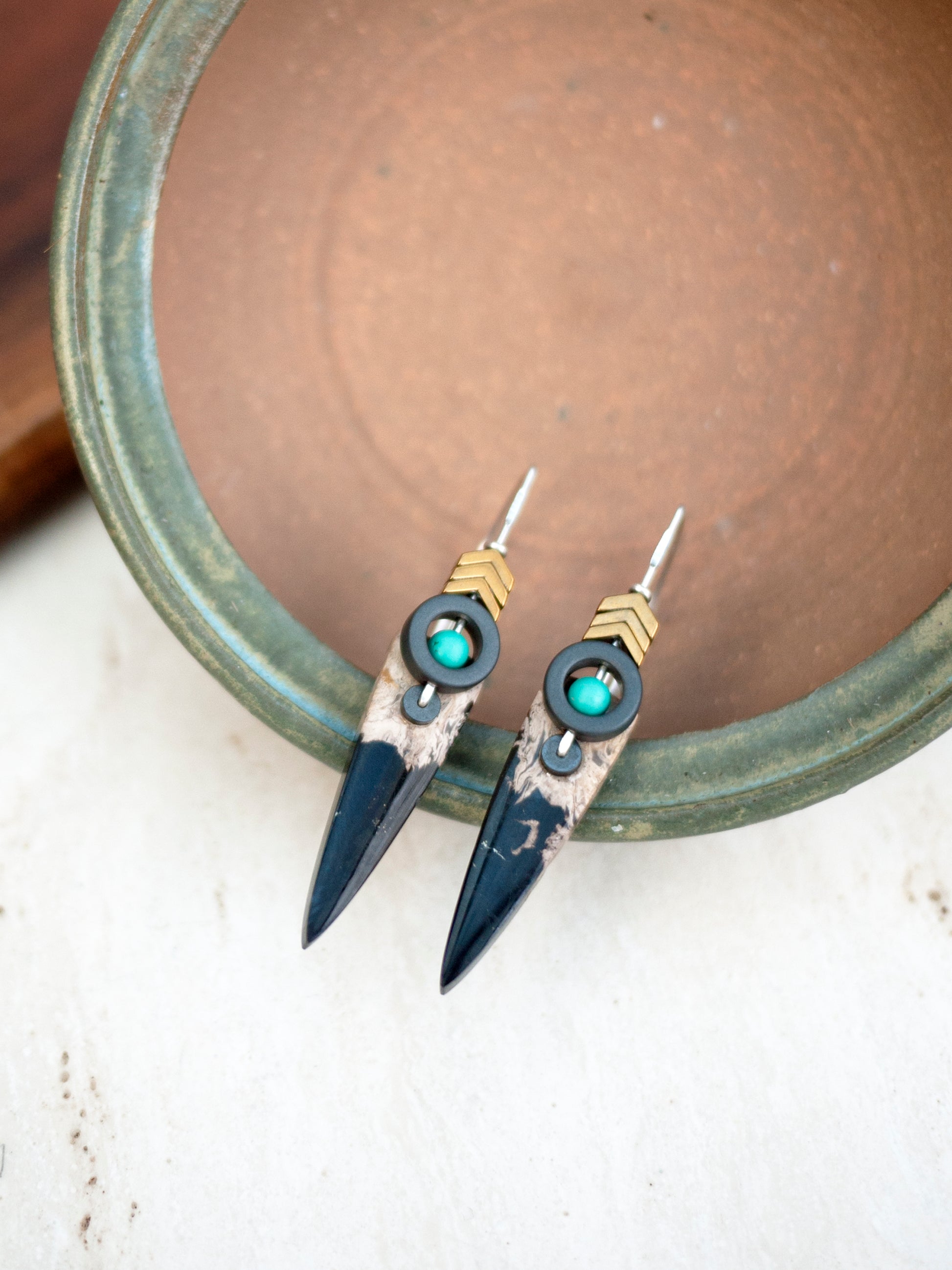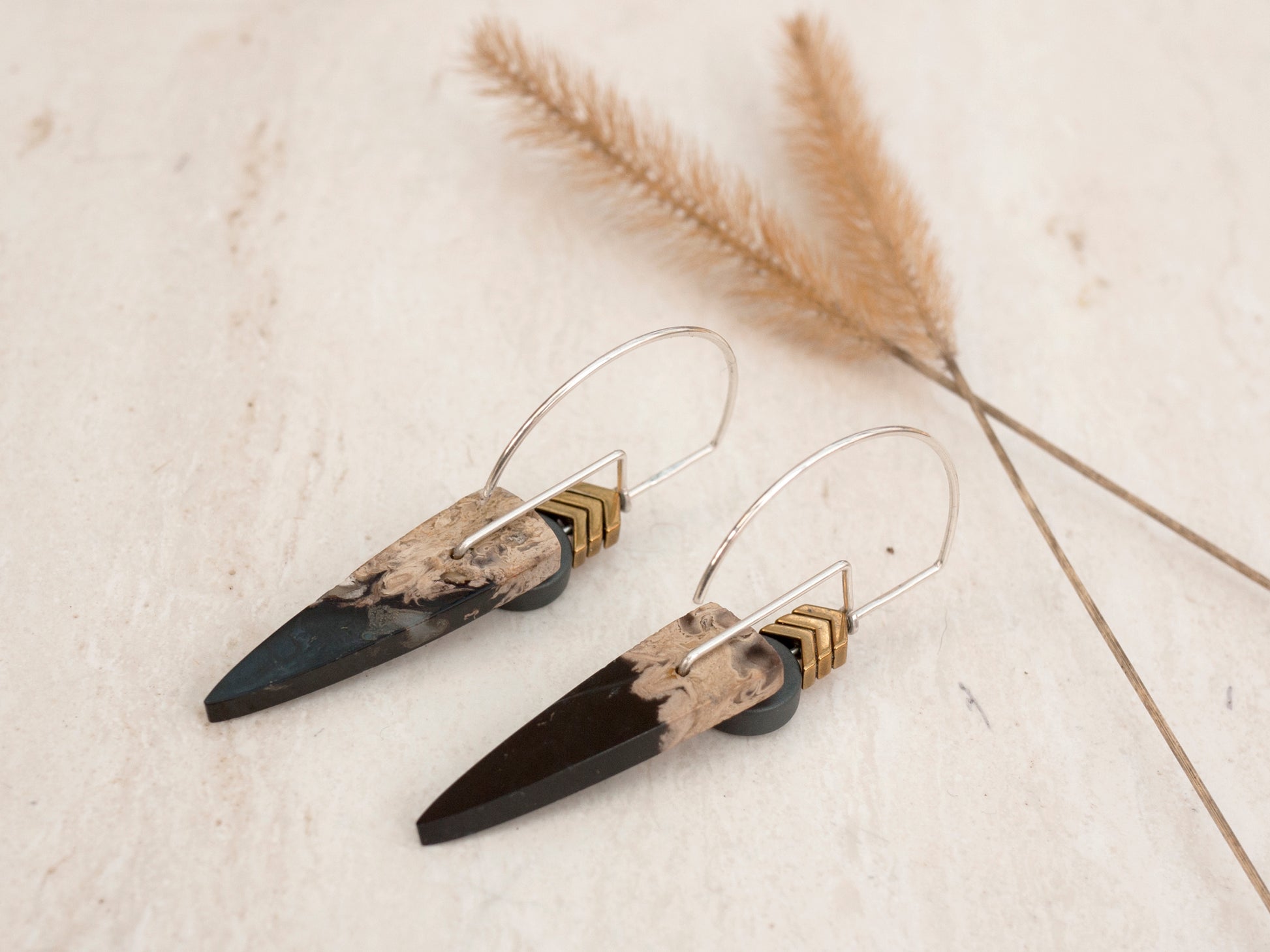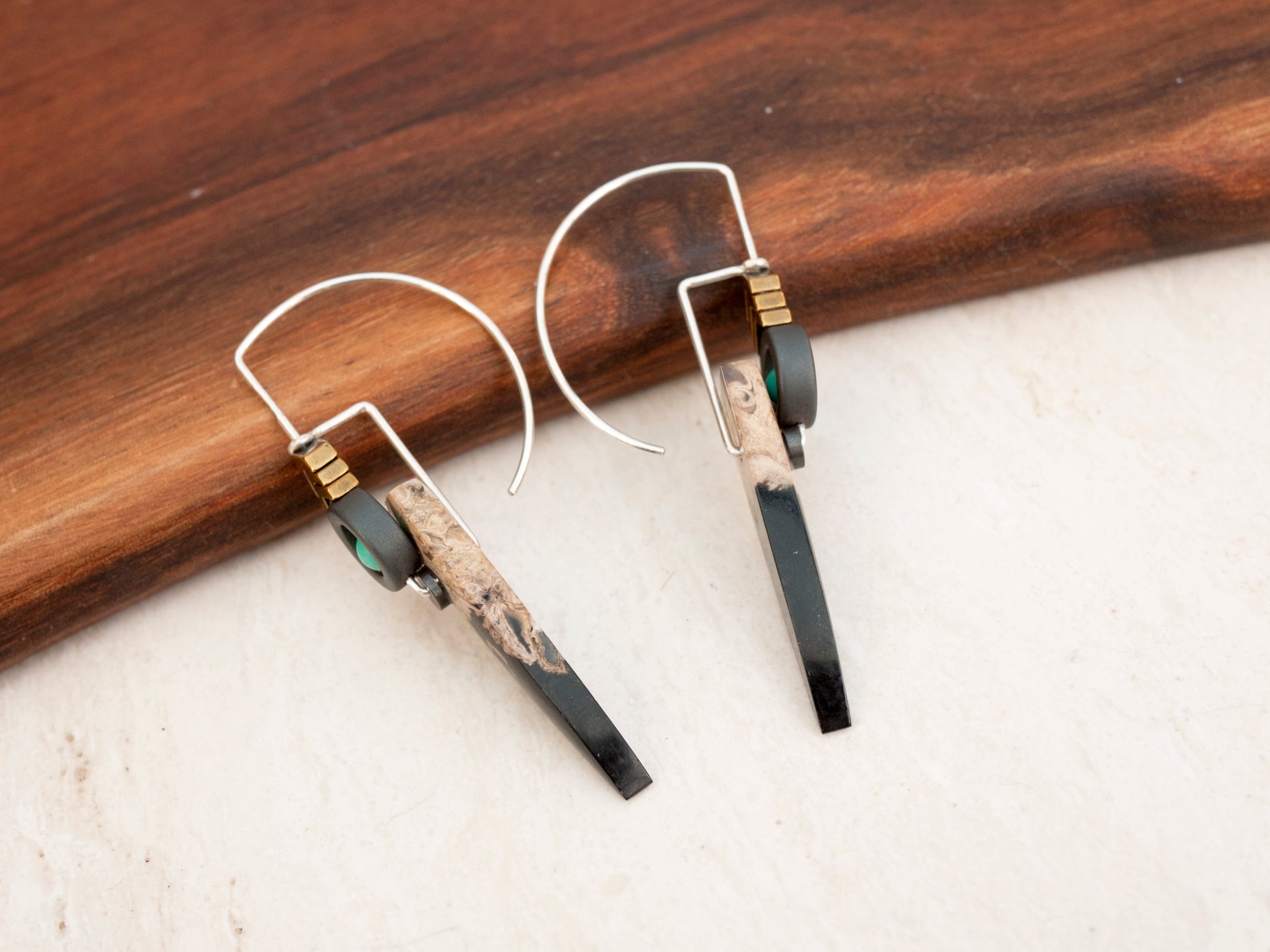 These fun drop earrings are made with hand cut petrified palm root and solid sterling silver wire. The wire is embellished with hematite beads in gold and grey. Portions of the wire are hammered to add sparkle. Earrings come with rubber backings