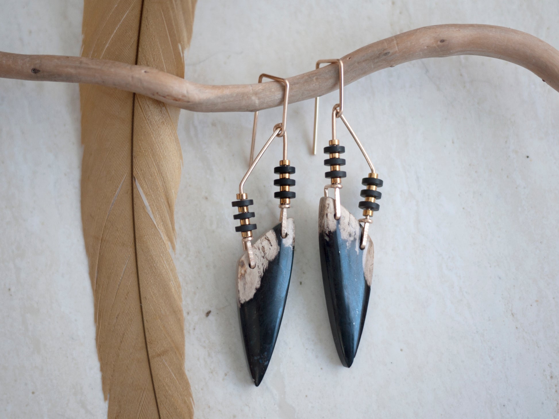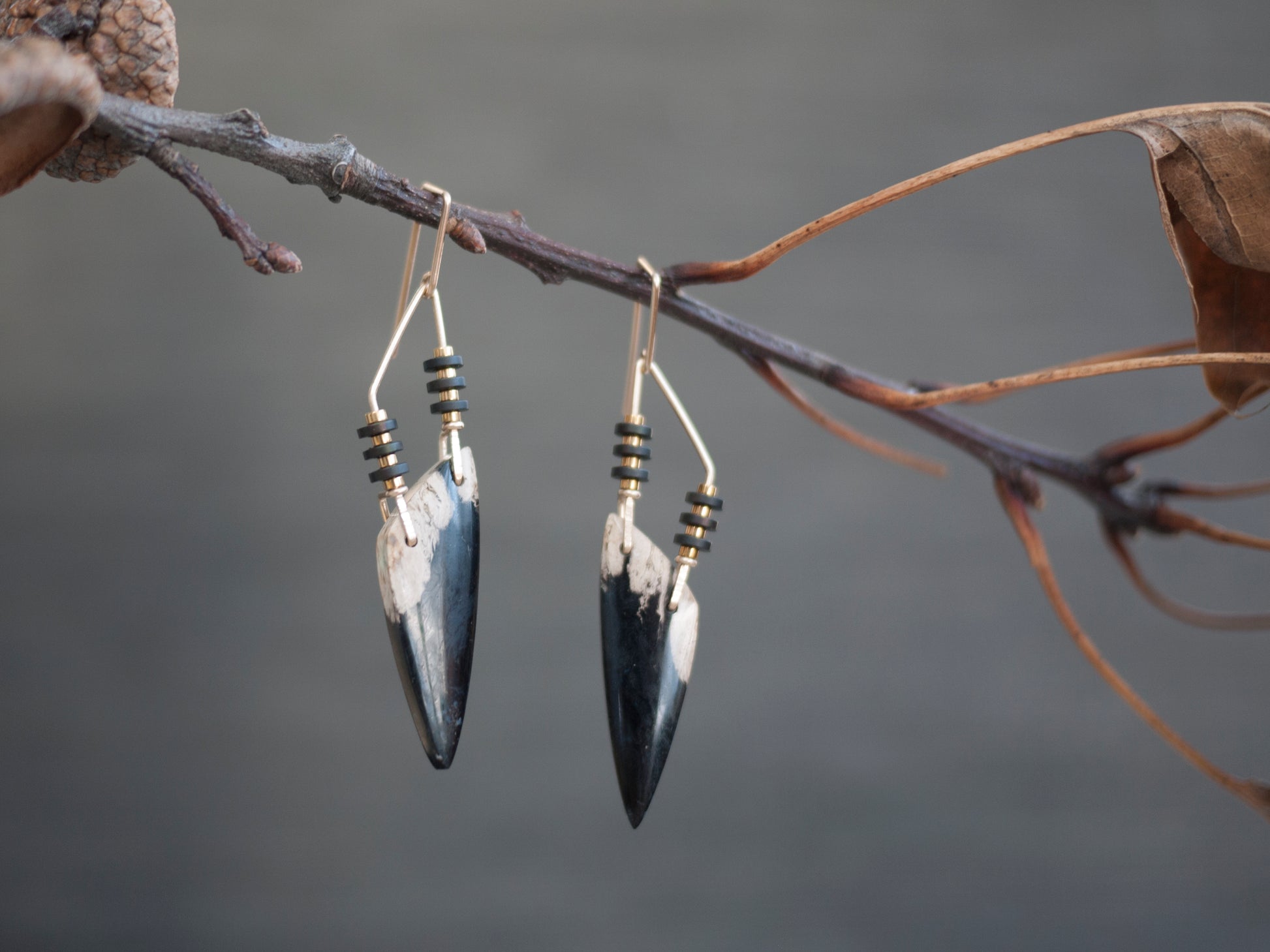 These striking petrified root stones are classic black and white pattern and would make the perfect accessory for any evening wear. They dangle from gold fill wire adorned with hematite beads. The ear wires come with rubber backings.