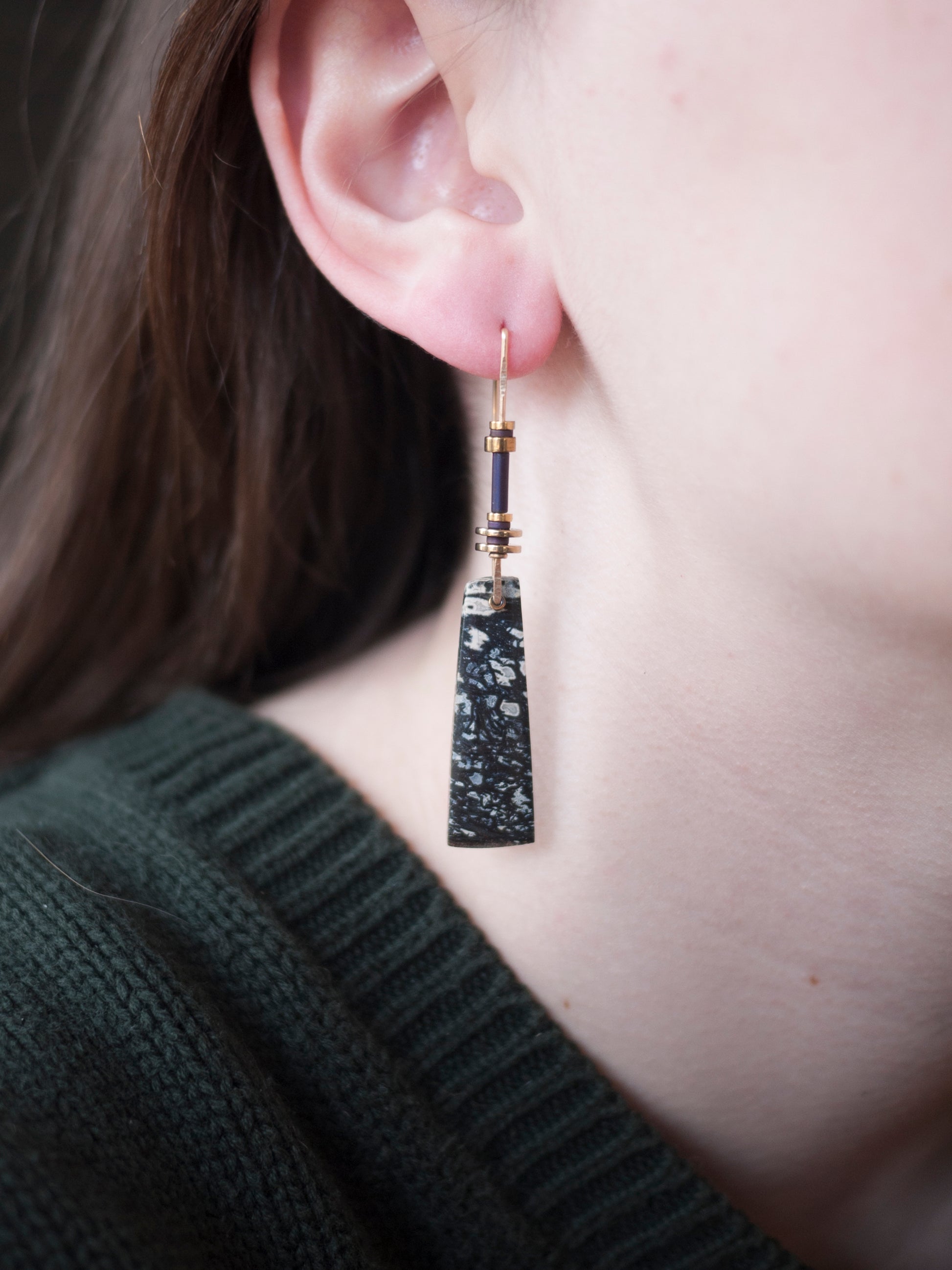 These striking petrified pal wood stones have a beautiful marbled pattern. They dangle from yellow gold fill wire adorned with gold and purple hematite beads. The ear wires have a sculptural curve to add interest and form to the overall earrings. Earrings come with rubber backings