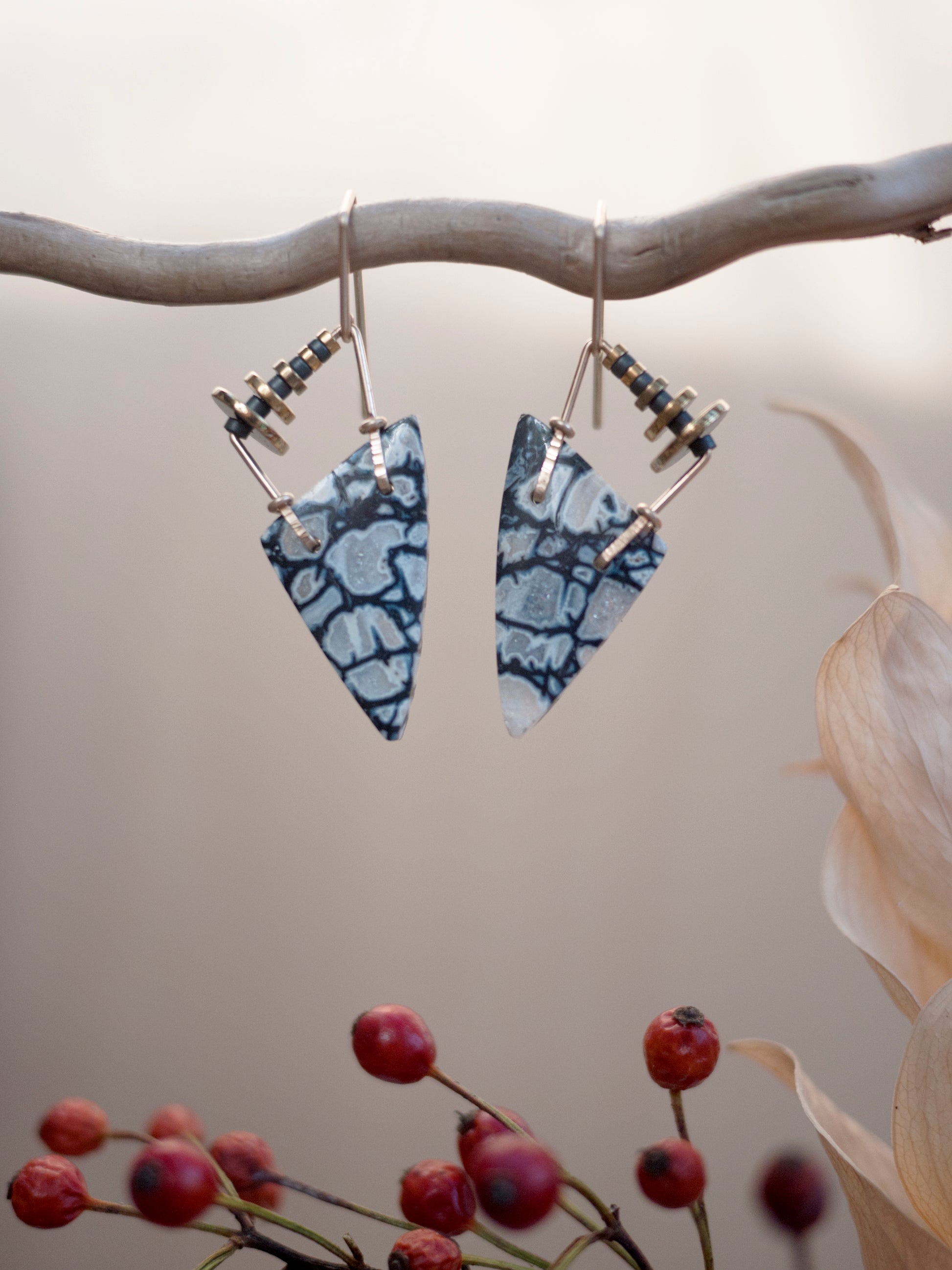 These petrified palmwood stones have a striking line pattern and would make the perfect accessory for any evening wear. The stones hang from a yellow gold fill arch adorned in hematite beads. They dangle from handmade gold fill french hooks. Earrings come with rubber backings.