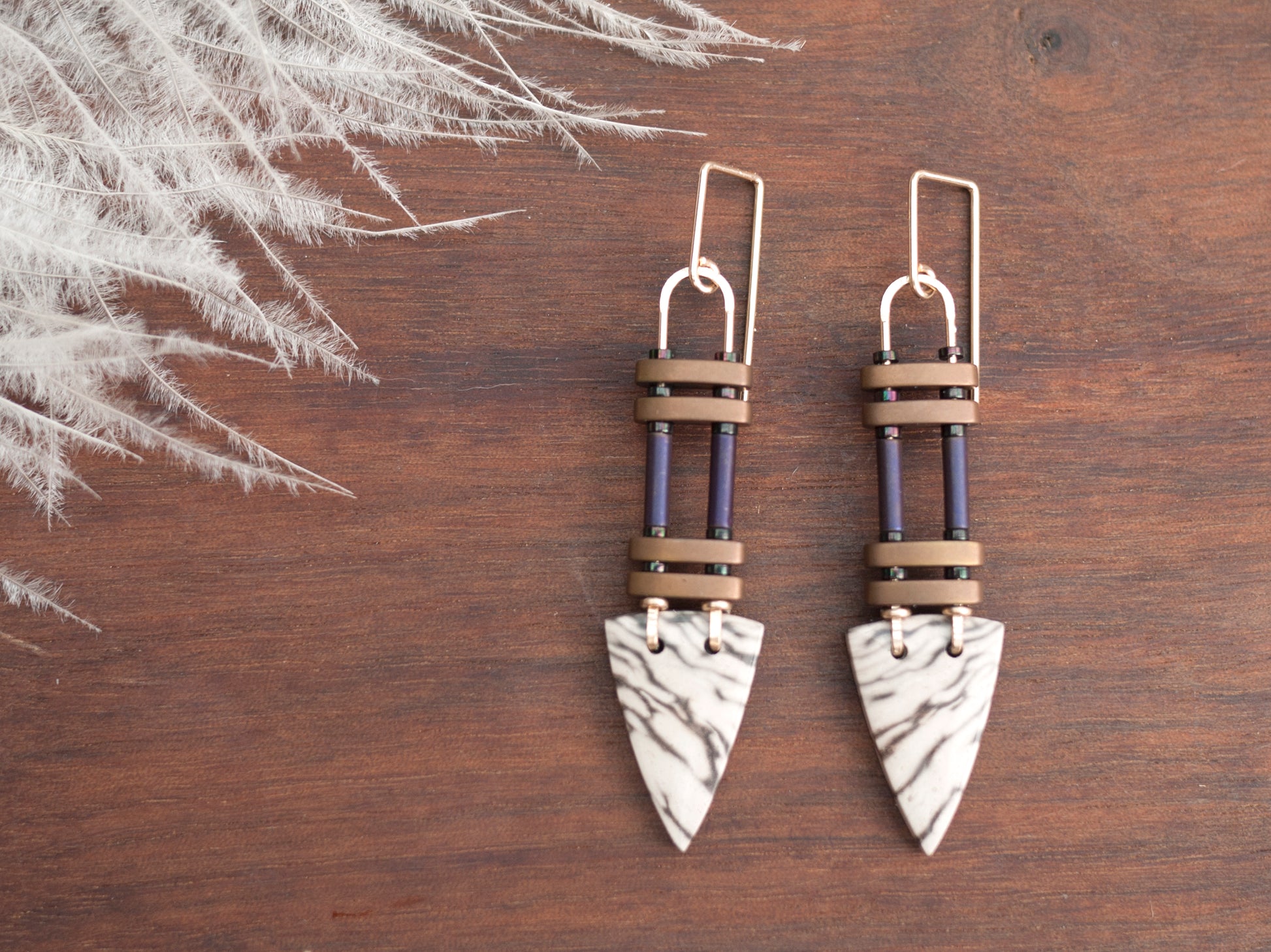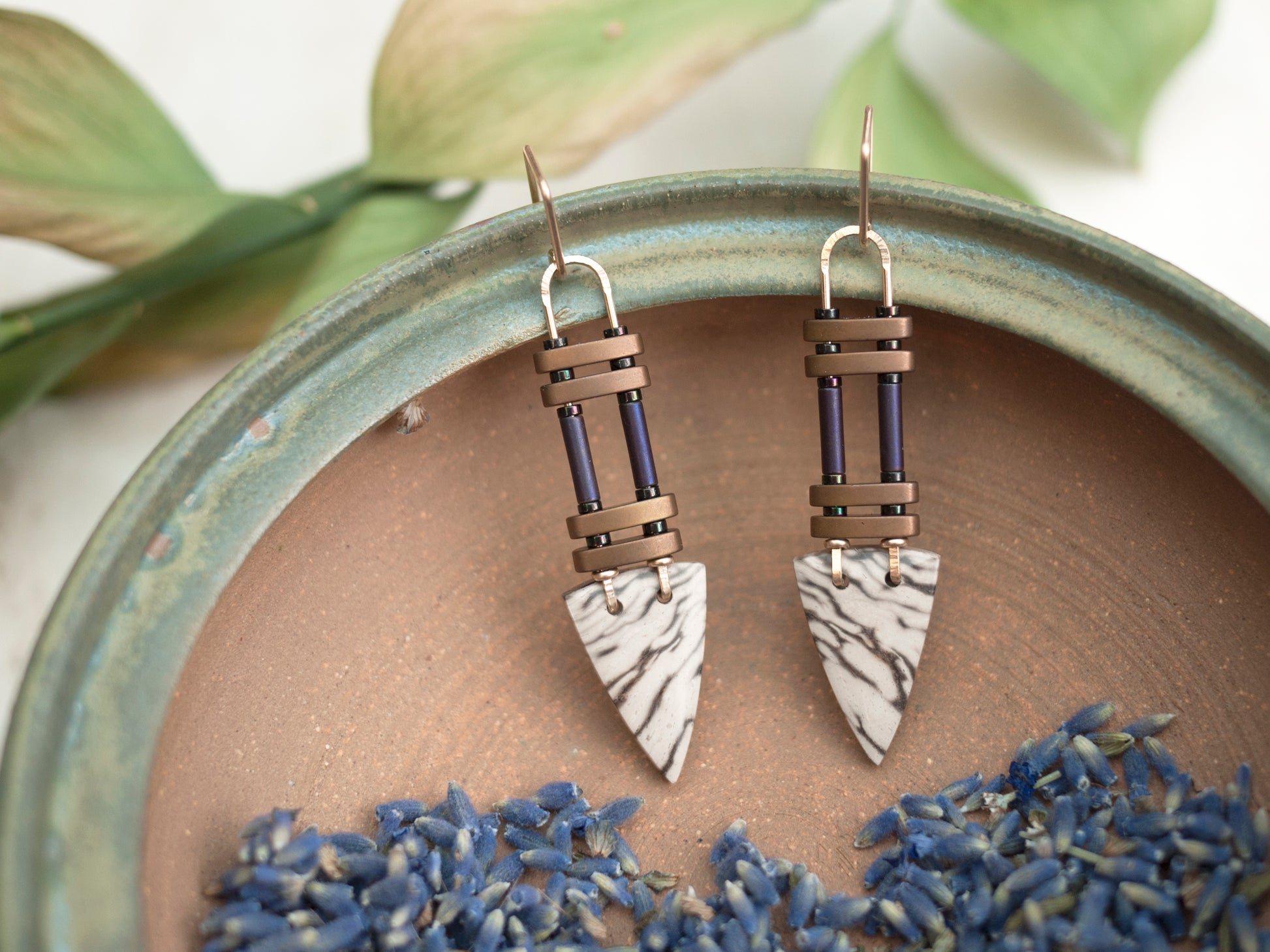 I love the subtle pattern on these petrified wood stones. They have an animal print feel to them. The hand formed yellow gold filled wire is embellished with hematite beads in copper and purple. The ear wire has a sculptural curve to them, giving more interest in their form.