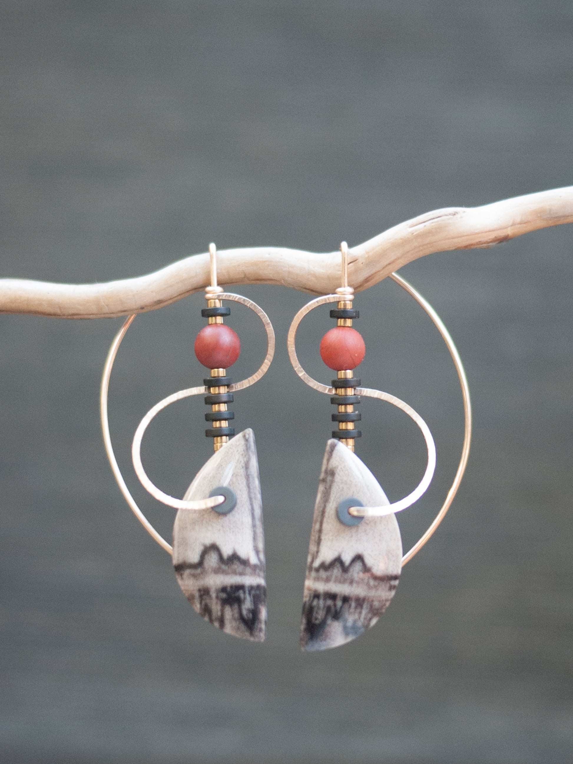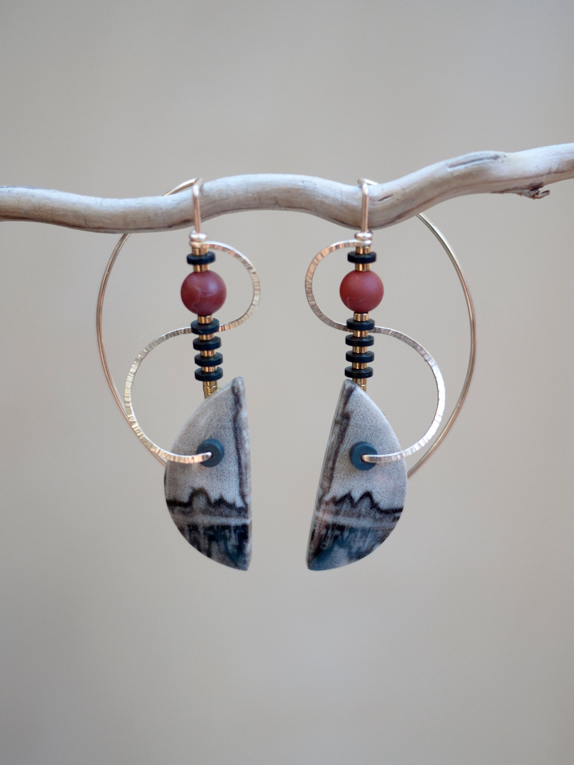 These beautiful natural petrified wood stones have a subtle pattern in grey and black. The gold fill wire is adorned with gold and grey hematite beads and round red jasper beads. The ear wires are arched to add design interest. Earrings come with rubber backings.