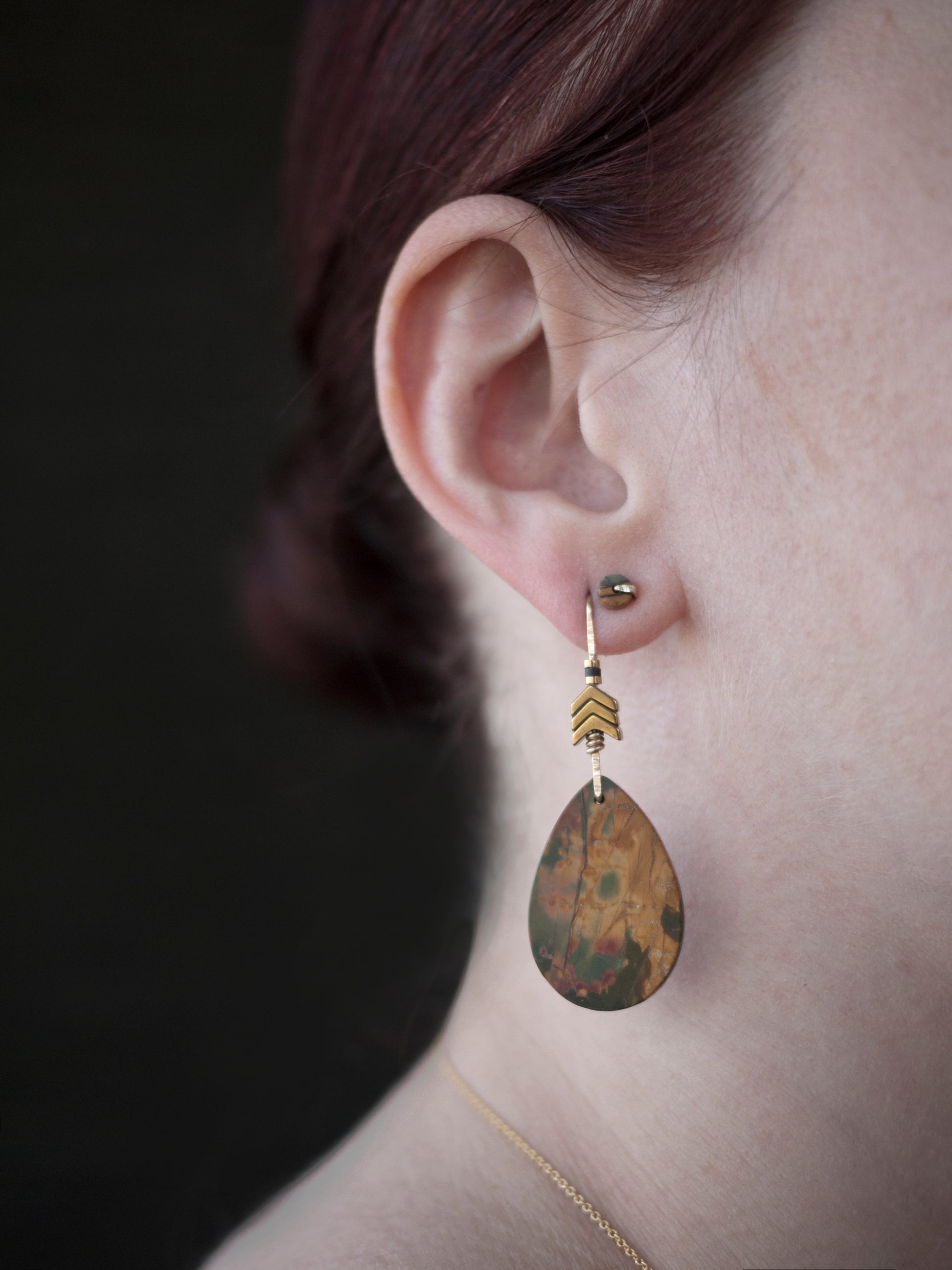 These Picasso jasper stones are rich in color and pattern. Combined with gold fill wire chevron shaped hematite beads to crate an earthy feel for these one-of-a-kind dangle earrings.