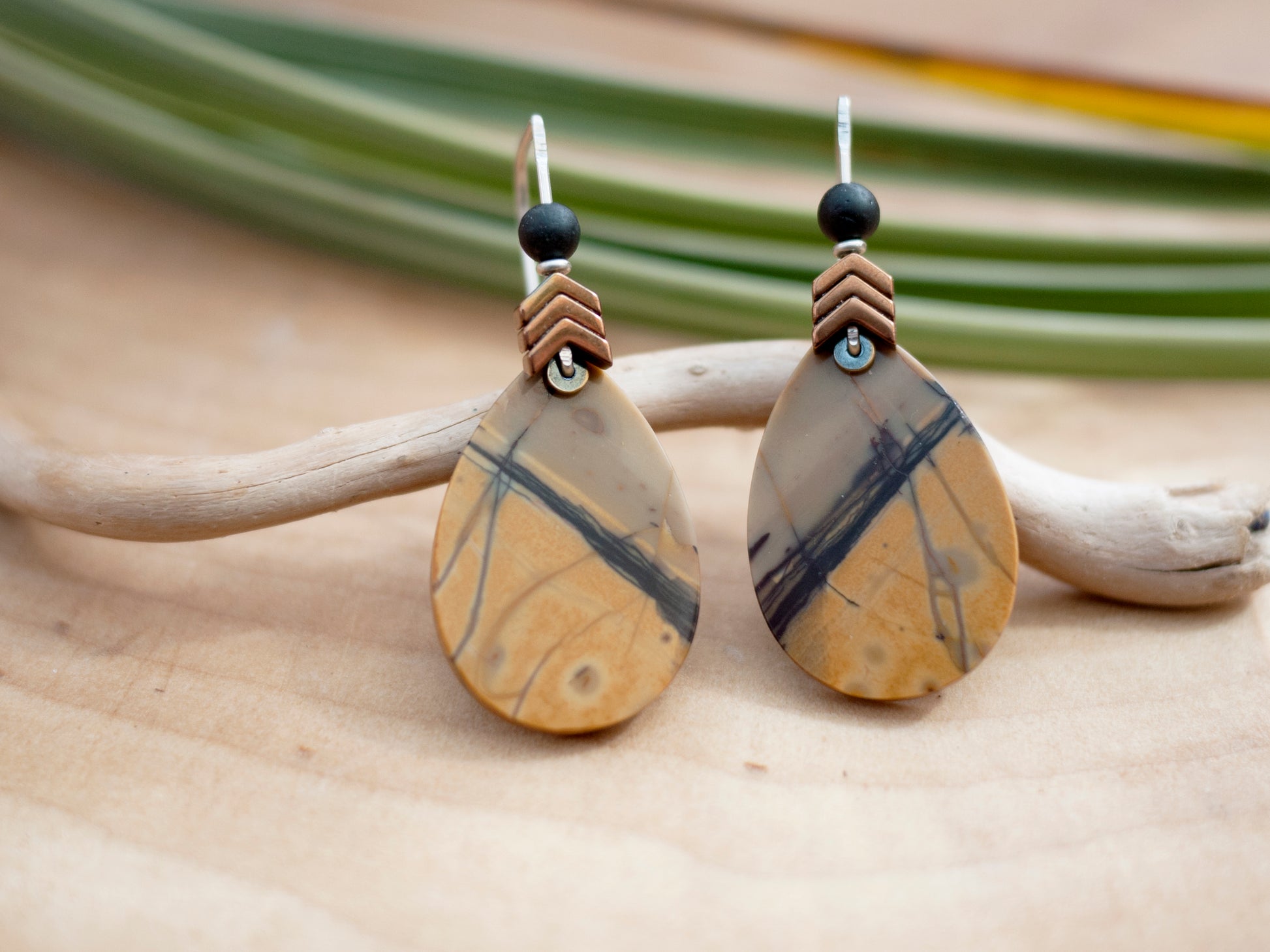 These red creek jasper stones are a rich mustard yellow and tan. Combined with solid sterling silver wire and chevron shaped hematite beads to crate an earthy feel for these one-of-a-kind dangle earrings.