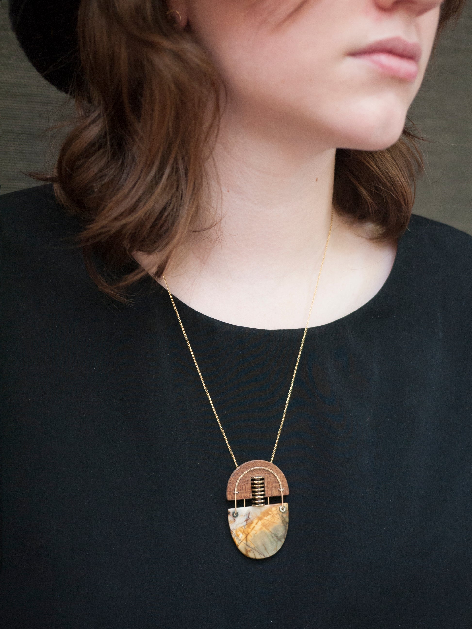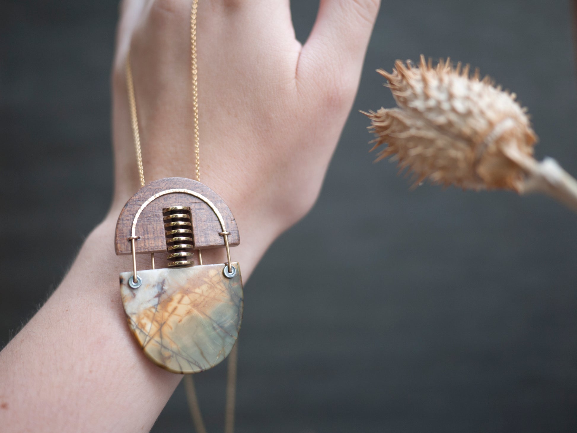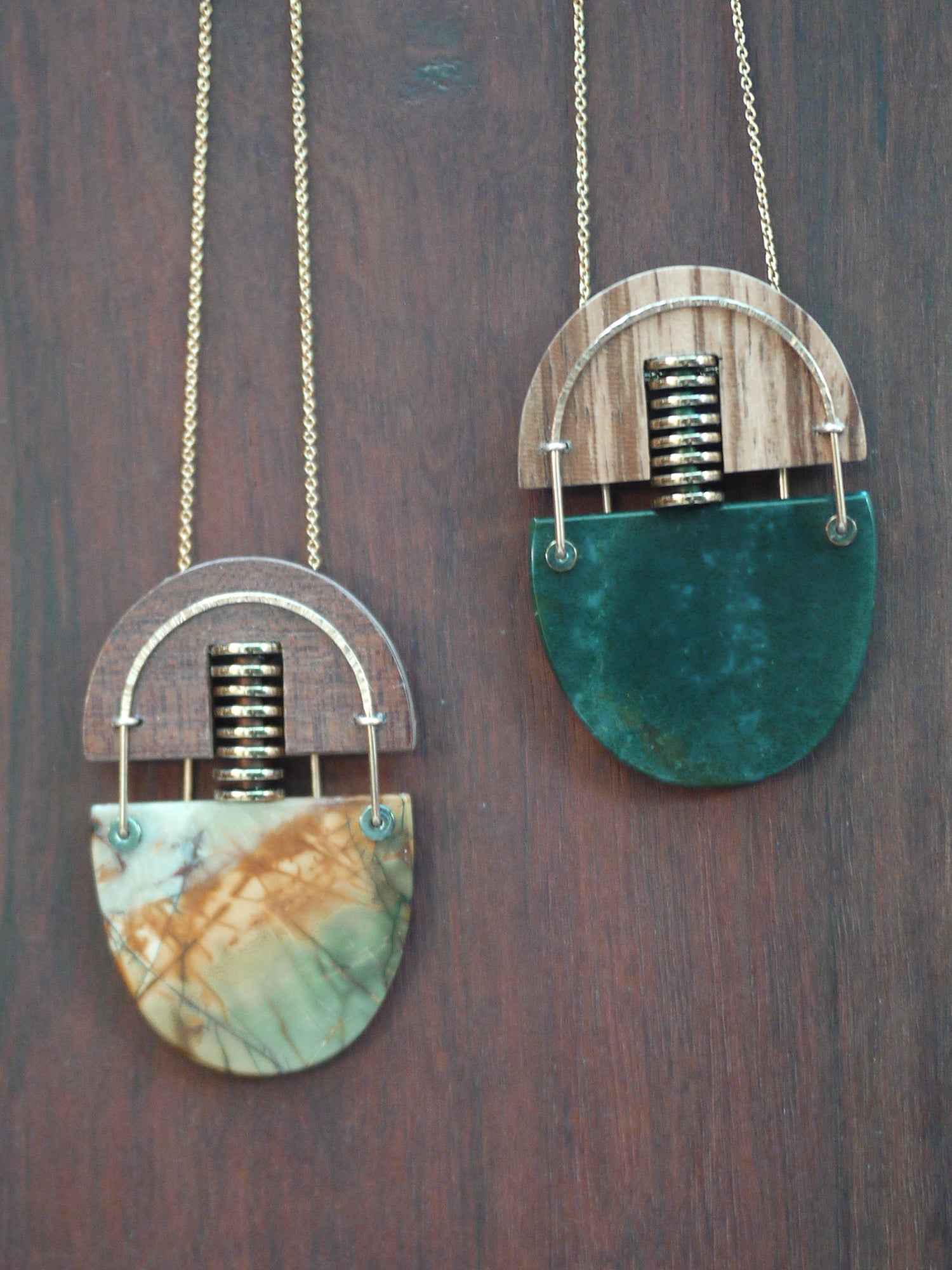 The combination of stone, metal, and wood is classic and sophisticated. My new line of geometric pendants uses this combination in unique but familiar forms.