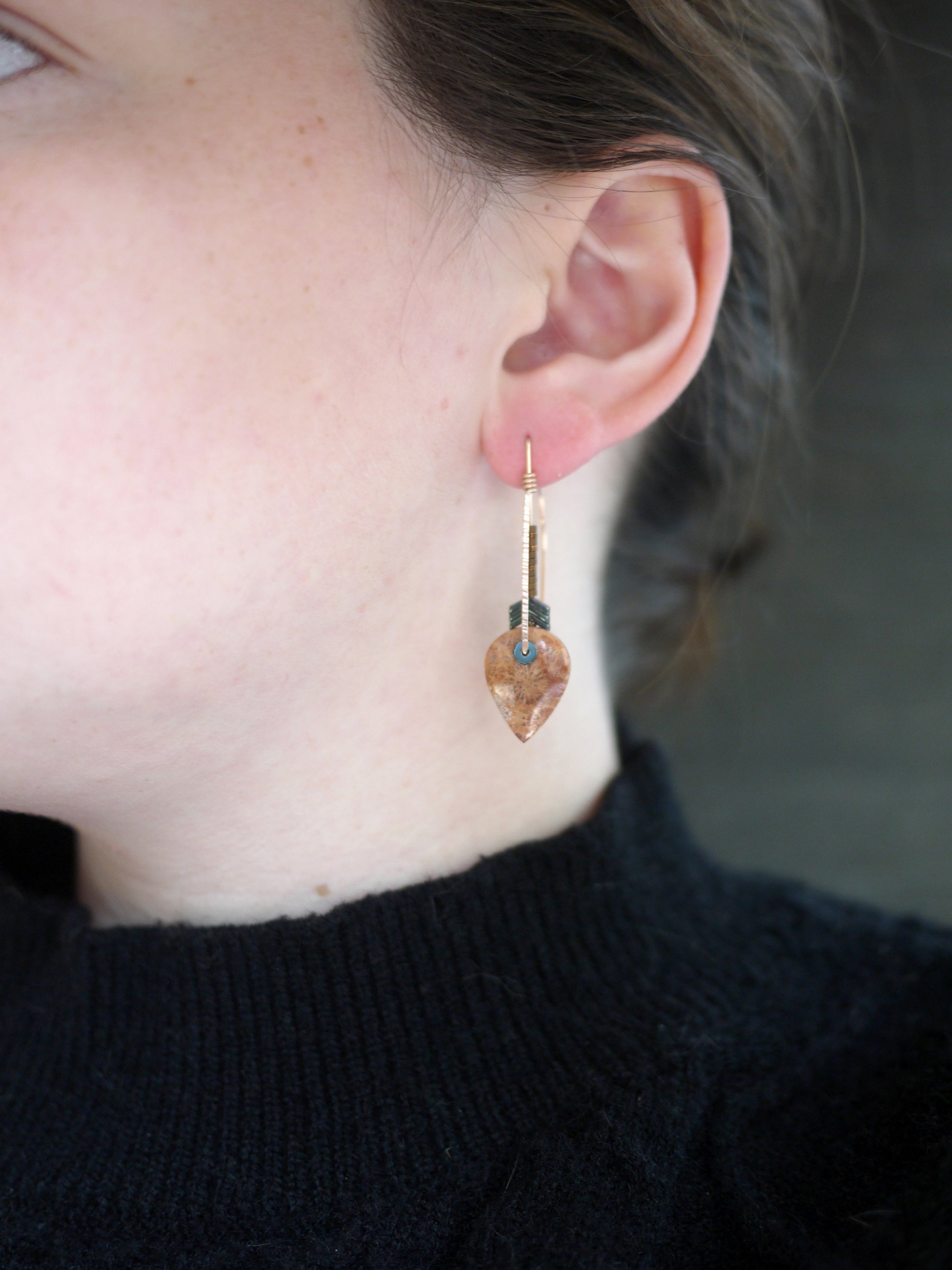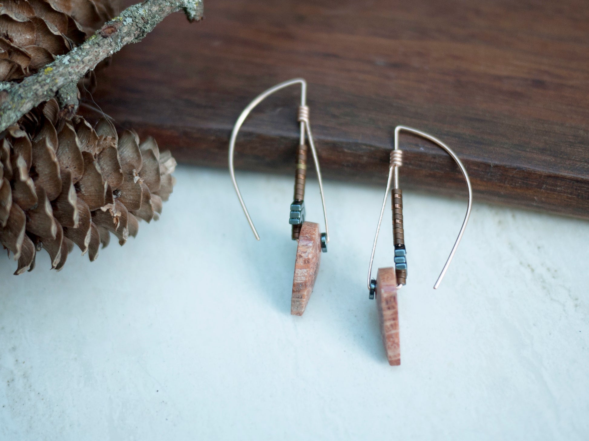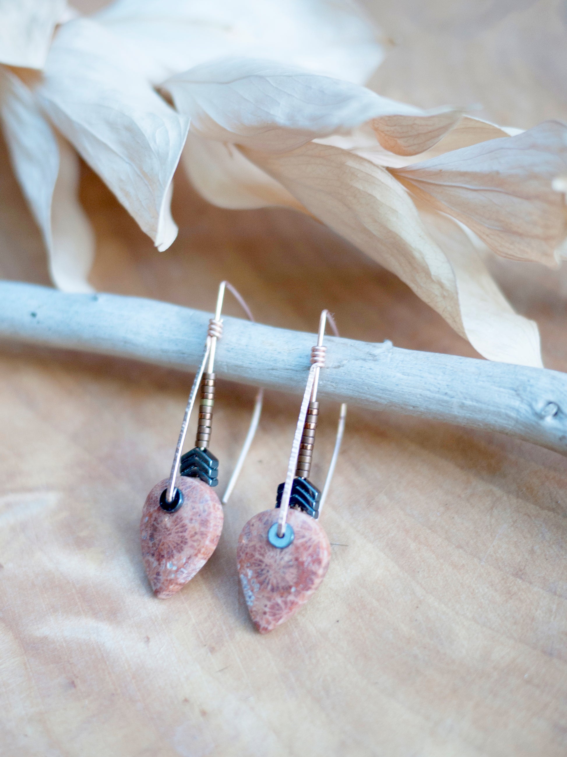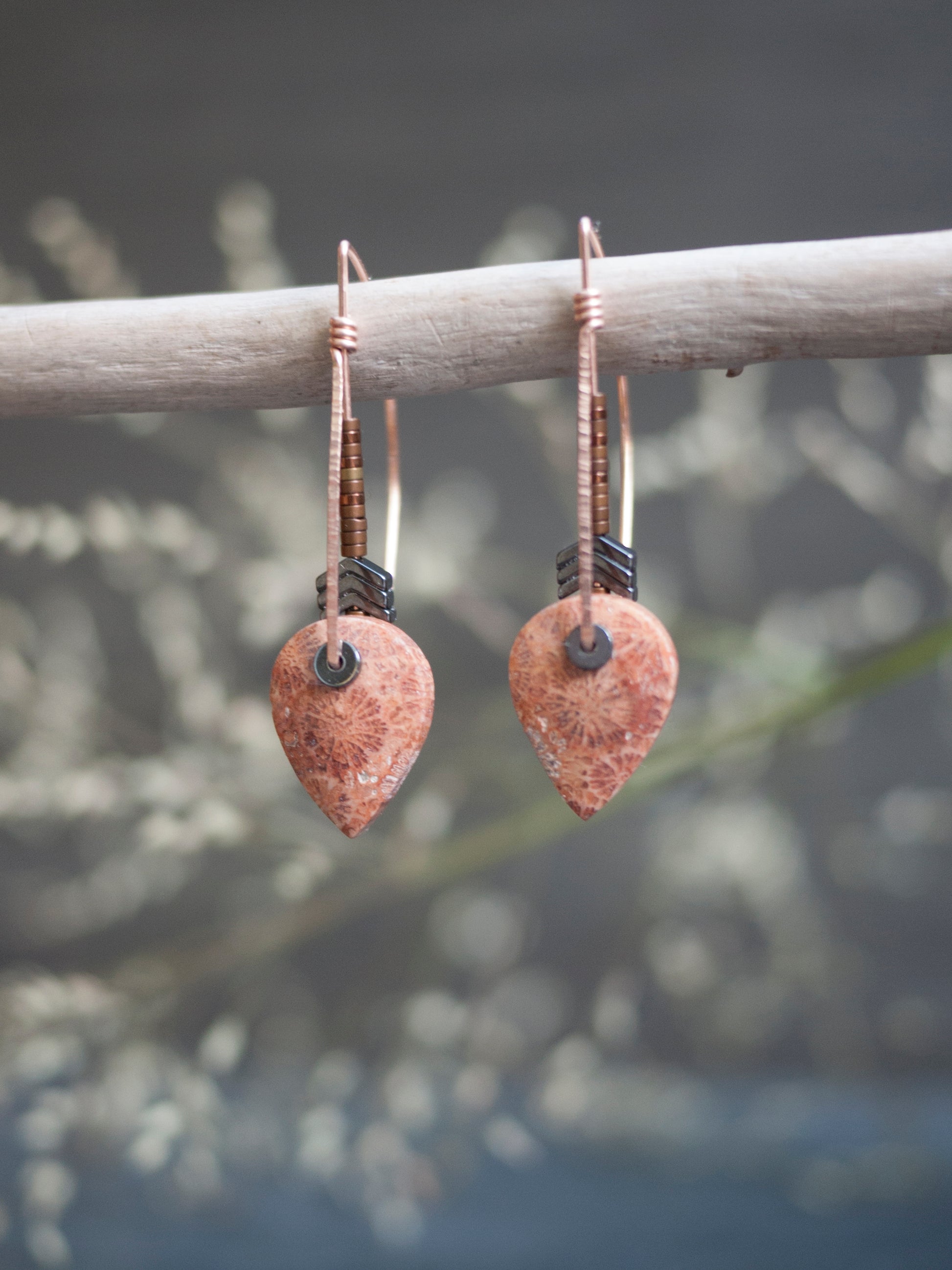 Wear a piece of natures past with these pink fossil coral dangle earrings. Hand cut Indonesian fossil coral stones are accented with rose gold fill wire and multicolored hematite beads. The wire is hammered to give texture and sparkle. Arched ear wires add extra interest to the overall look. Earrings come with rubber backings