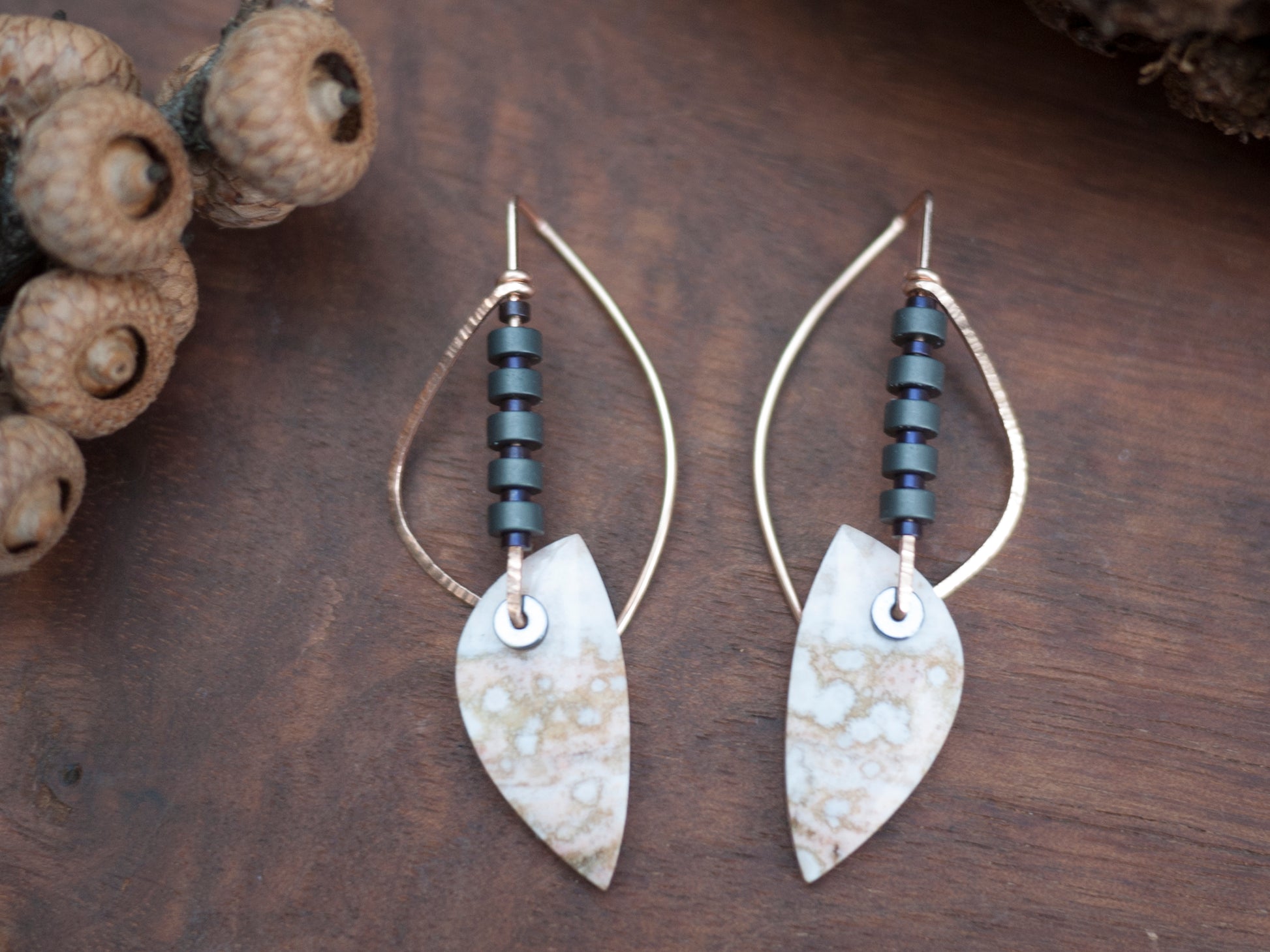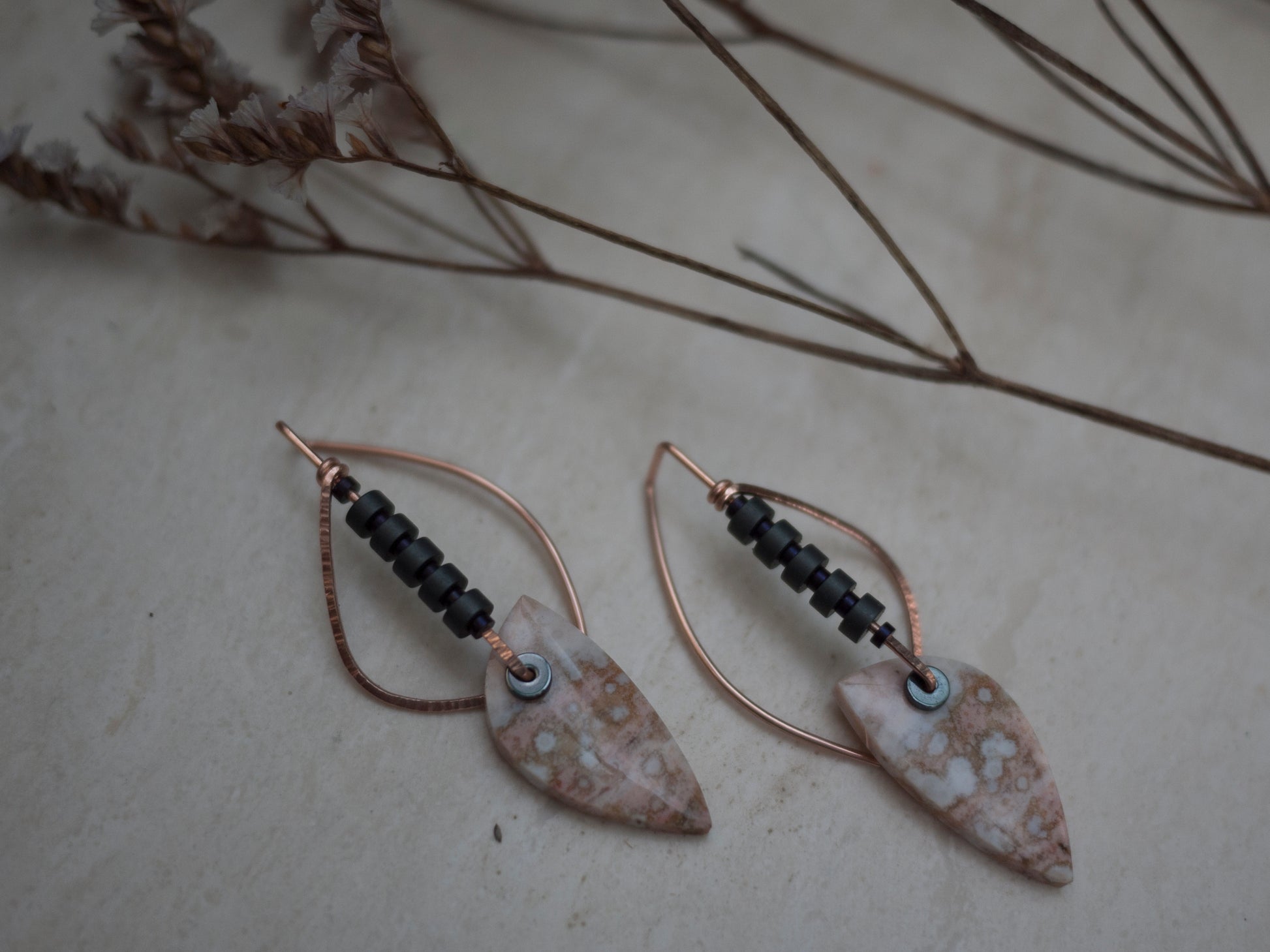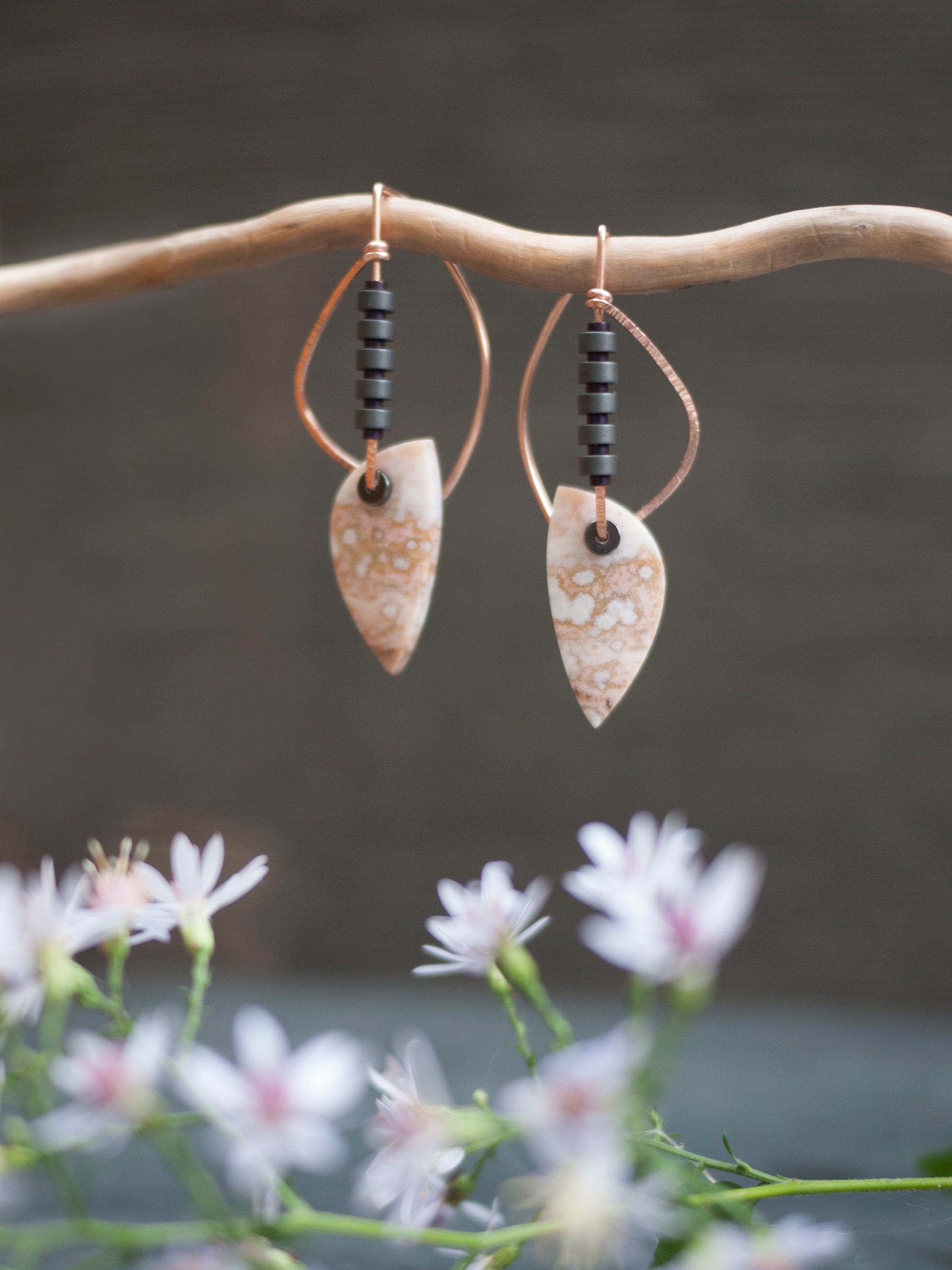 These picturesque ocean jasper stones have a beautiful speckled pattern in pinks and white. They dangle from hammered rose gold fill wire, adorned with dark gray and purple hematite beads. The curved ear wires add sculptural interest to these earrings. These earrings come with rubber backings.
