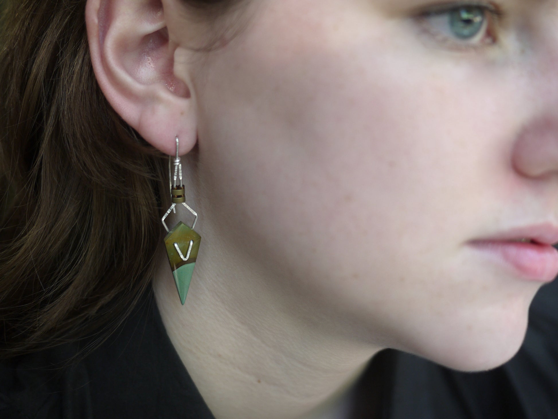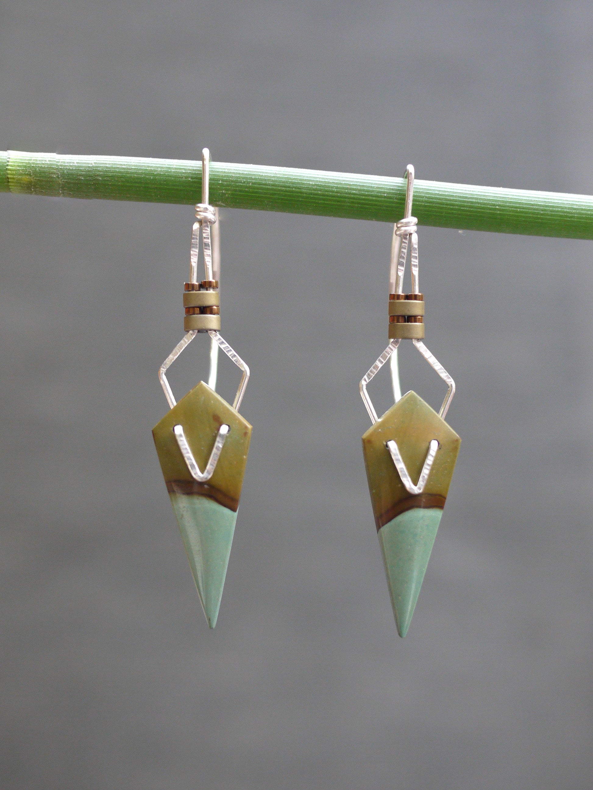 These polychrome jasper stones are designed and hand cut specifically for my designs by a lapidary artist in Indonesia. The diamond shape of the stone is carried on by the sterling silver wire. The wire is hammered to add sparkle and hematite beads finish off the look. The ear wires have a decorative arch to add interest all around.