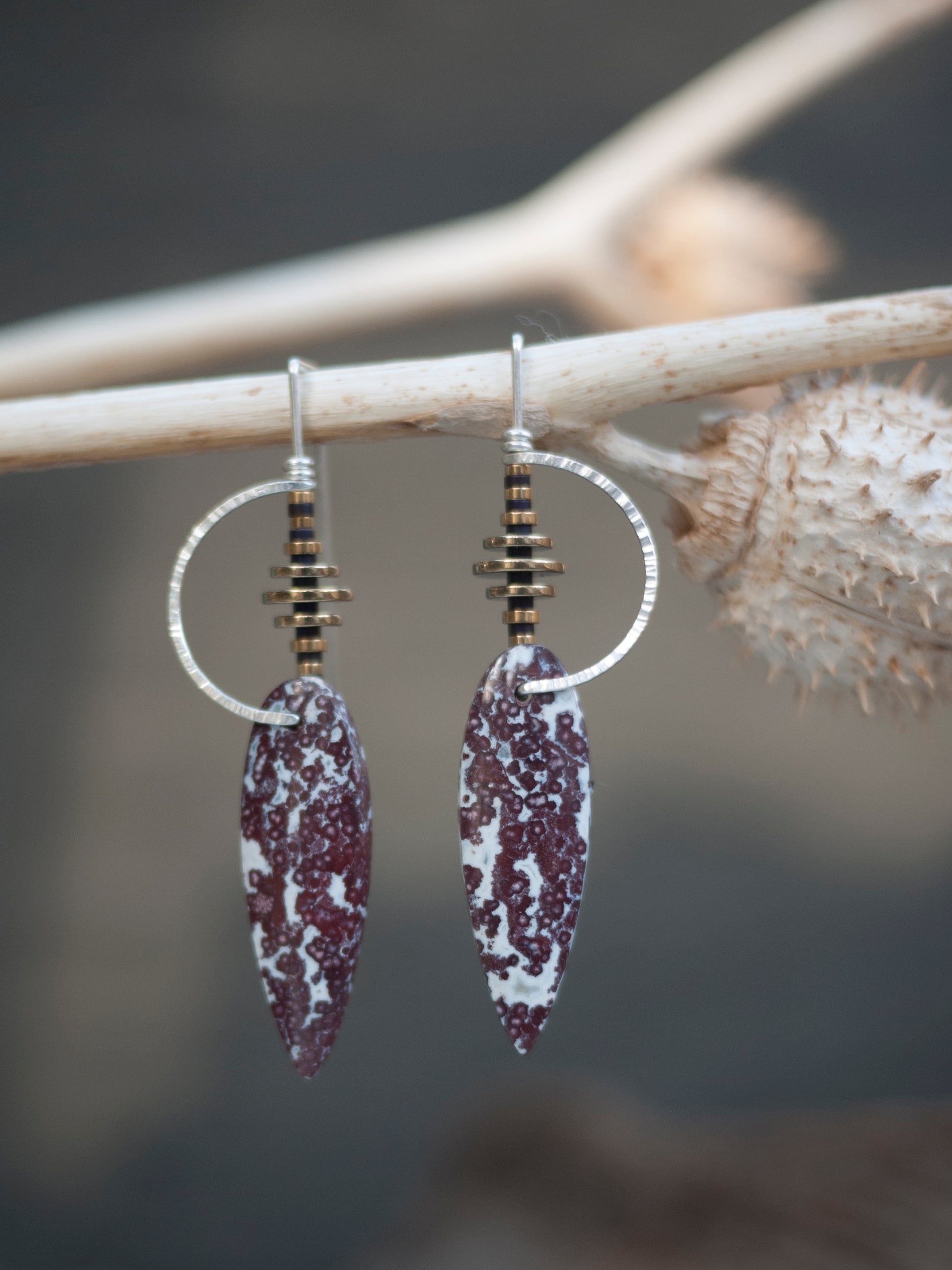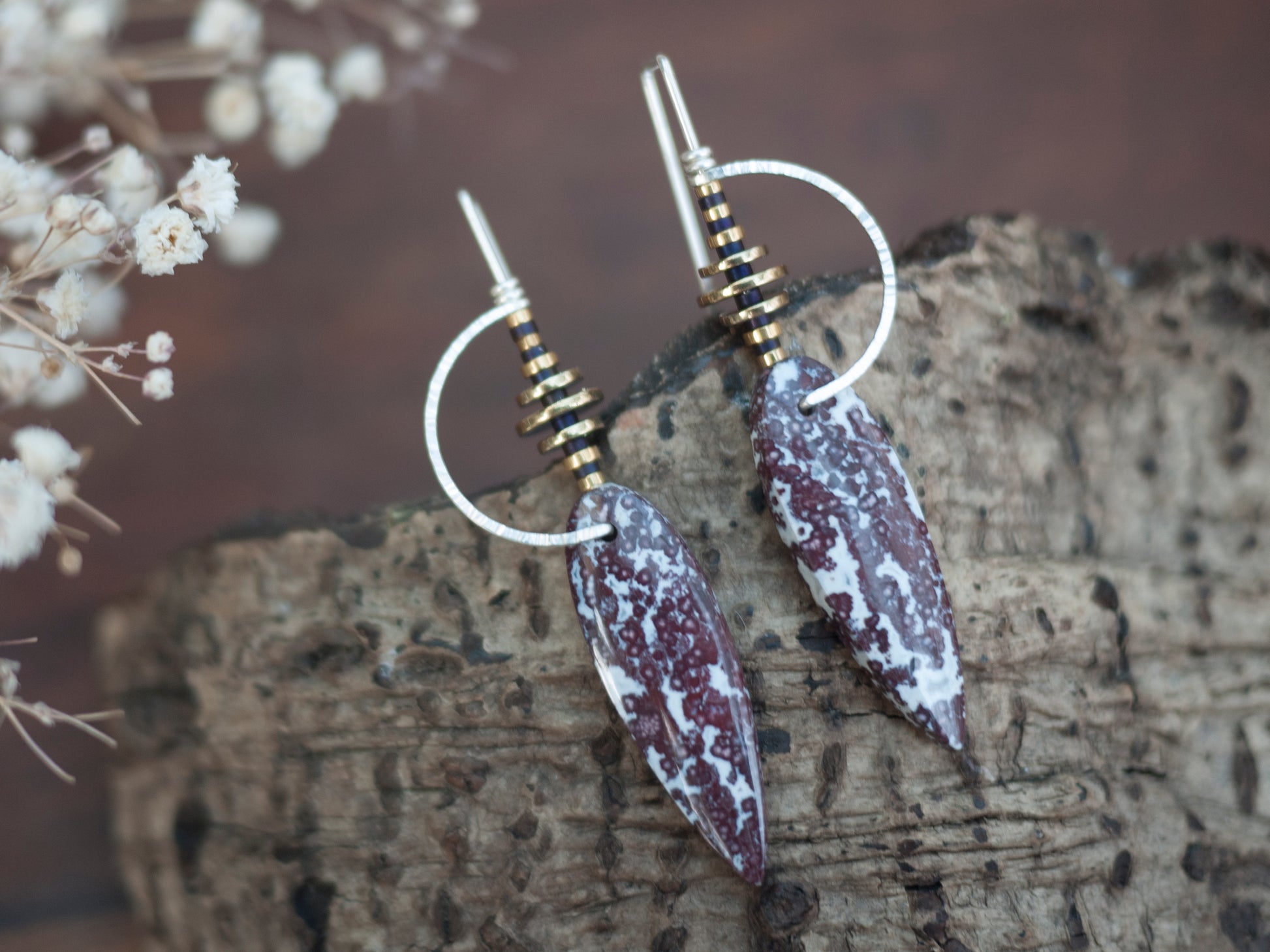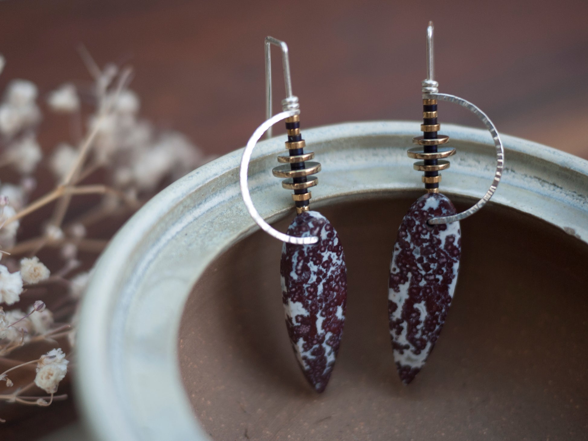 These picturesque ocean jasper spears have a beautiful speckled pattern in purple and white. They dangle from sterling silver wire adorned with gold and gray colored hematite beads. The half circle wire adds a unique sculptural form to the earrings. Wire is hammered in portions for sparkle.