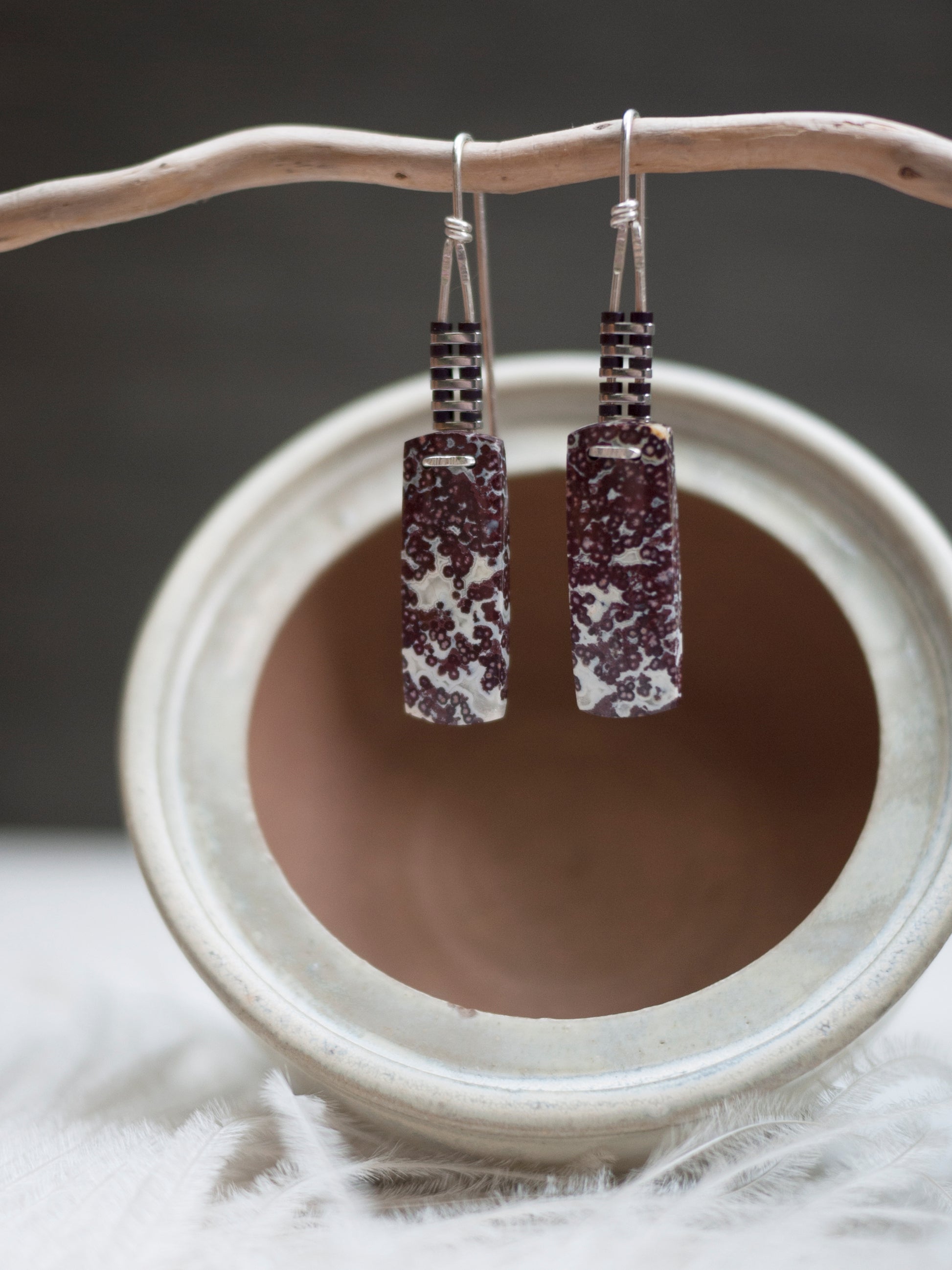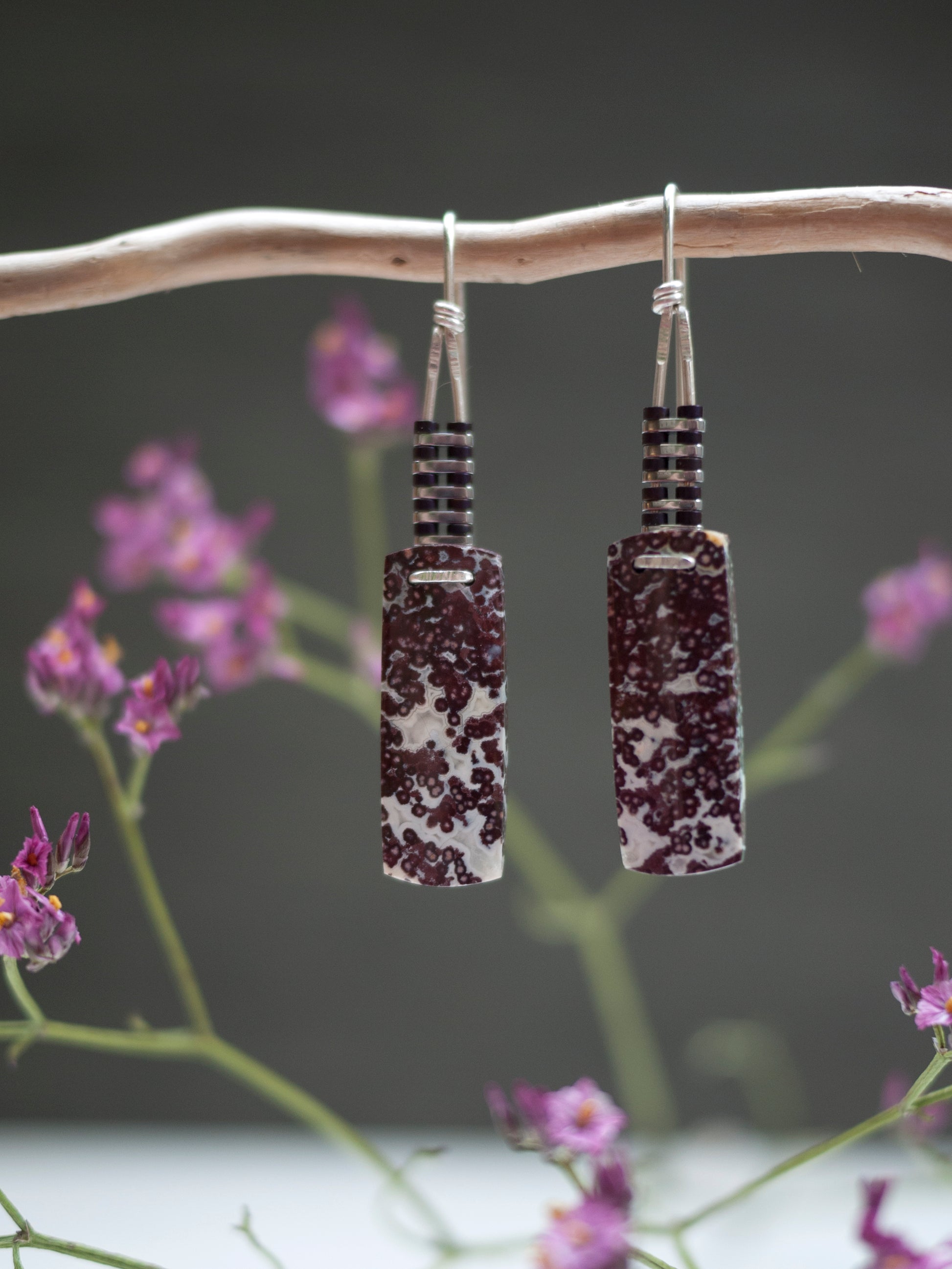 These beautiful specimens are a beautiful mix of purple and white. They hang from sterling silver wire, embellished with hematite beads in silver and purple. The ear wire is long making them more interesting in form. Come with rubber backings.