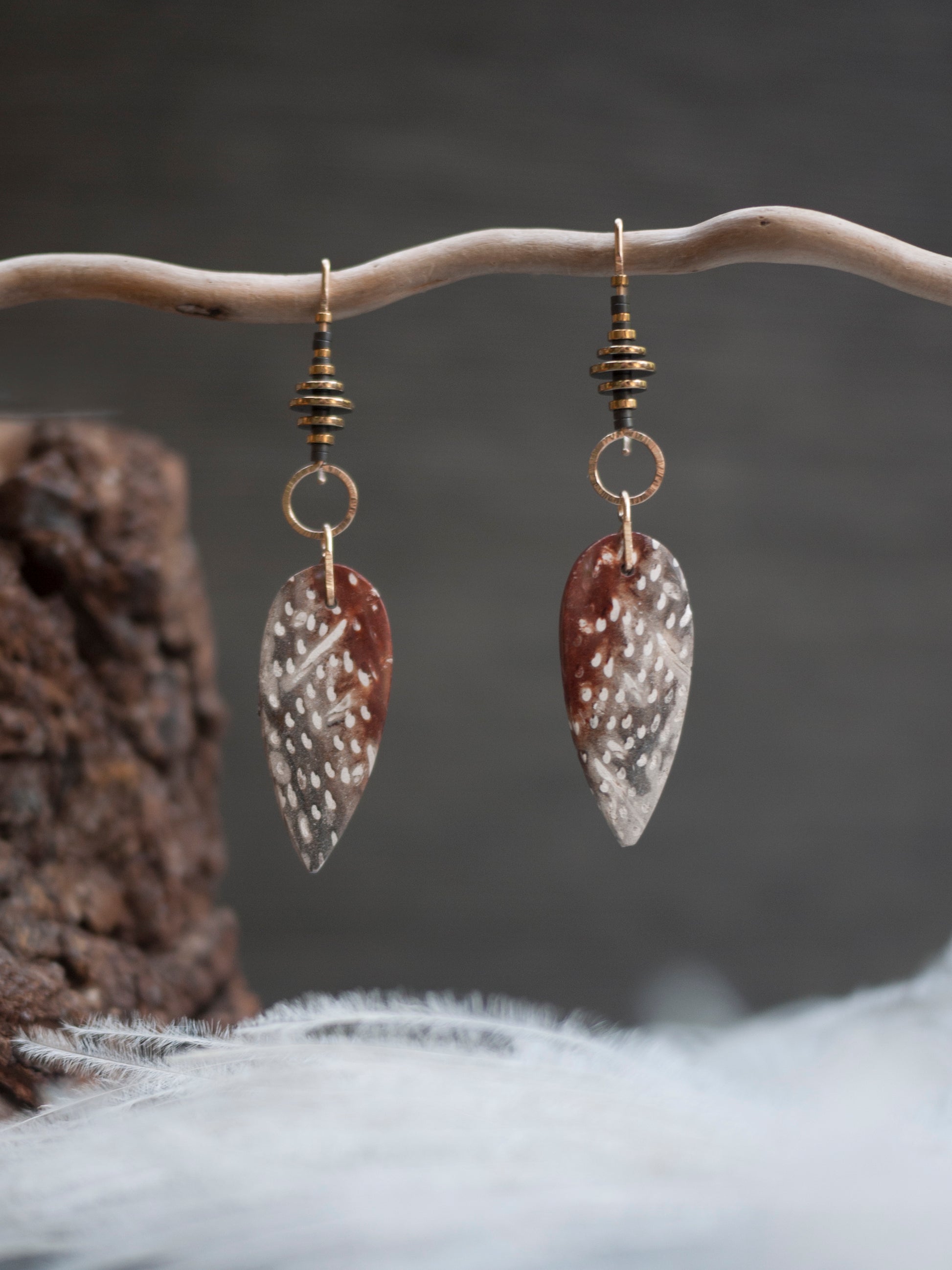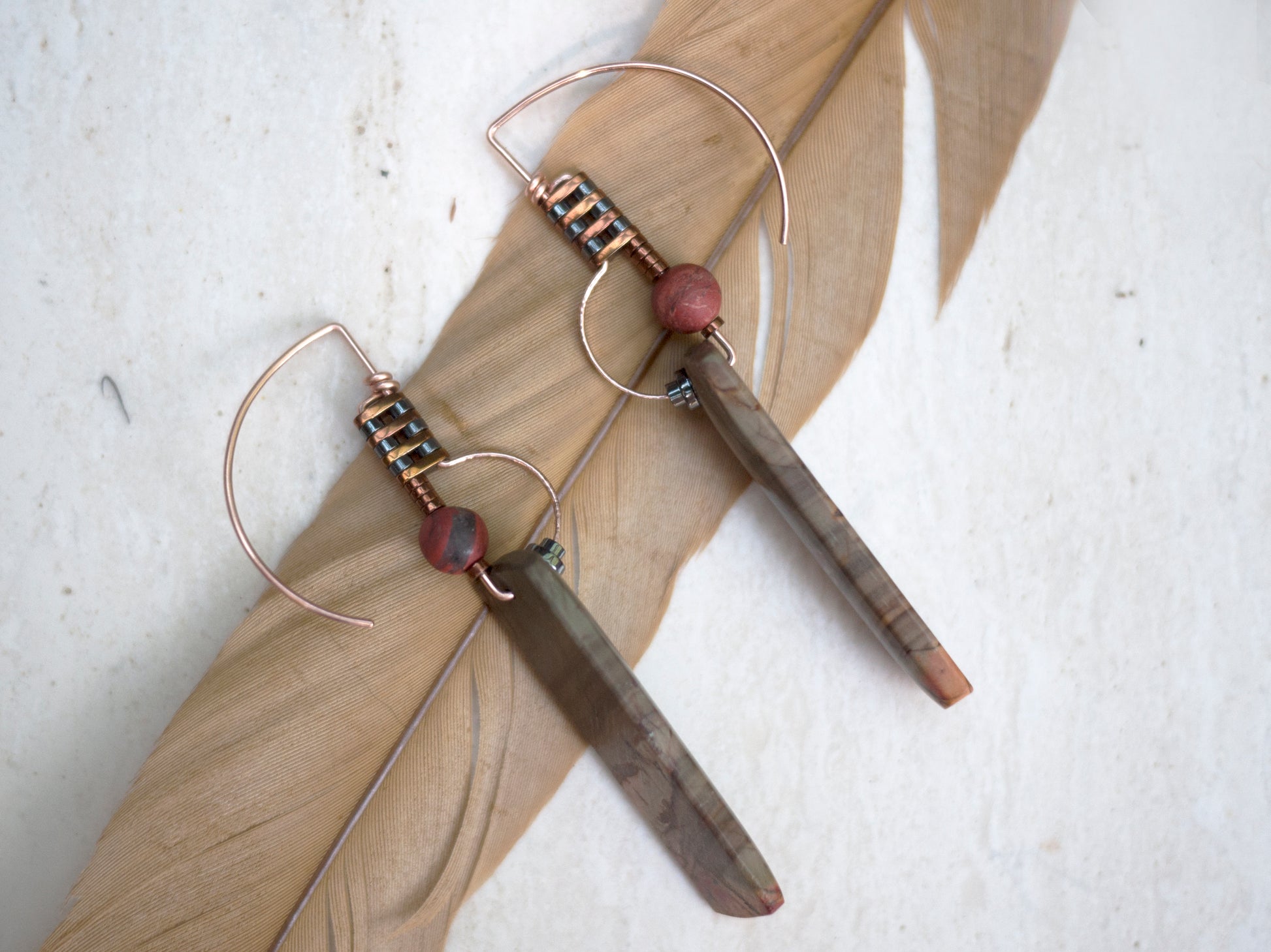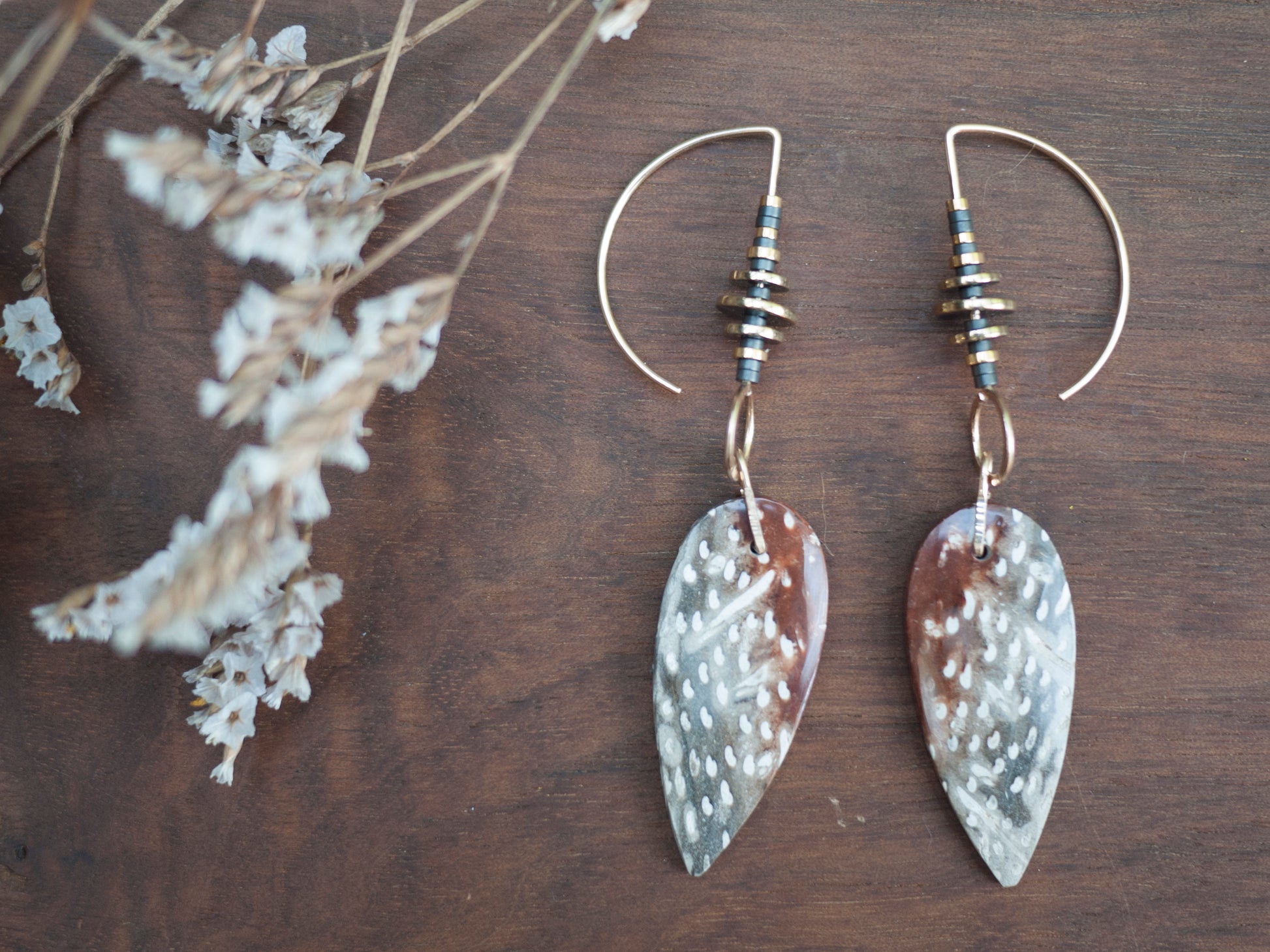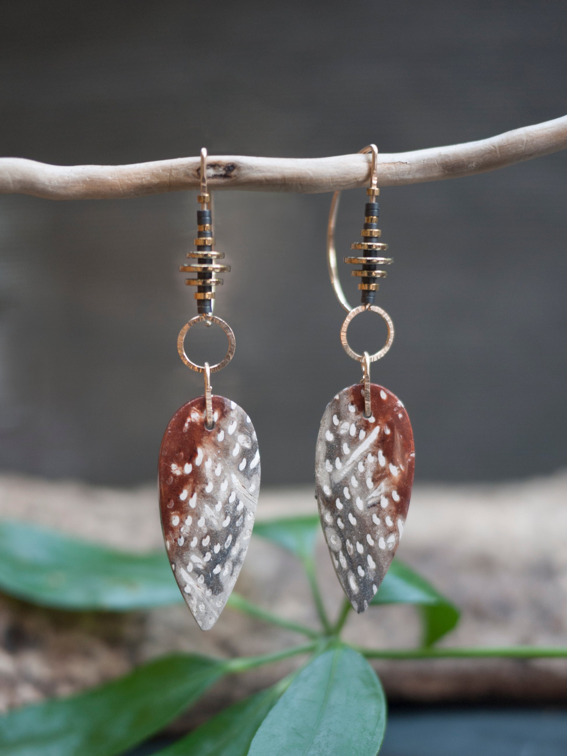 These striking petrified palm wood stones have a beautiful speckled pattern in grey and rust red. They dangle from yellow gold fill wire adorned with gray and gold hematite beads. The ear wires have a sculptural curve to add interest and form to the overall earrings. These earrings come with rubber backings.