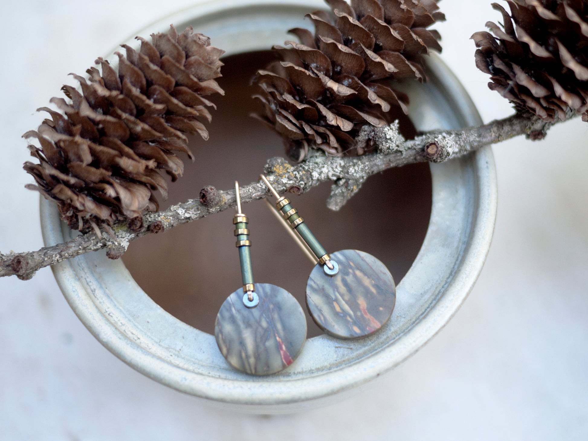 These striking red creek jasper stones have an abstract pattern in green, browns, and a splash of orange. The stones dangle from yellow gold filled wire and adorned with gold and green hematite beads. Earrings come with rubber backing.