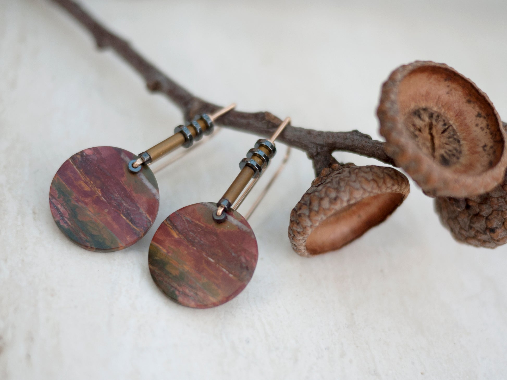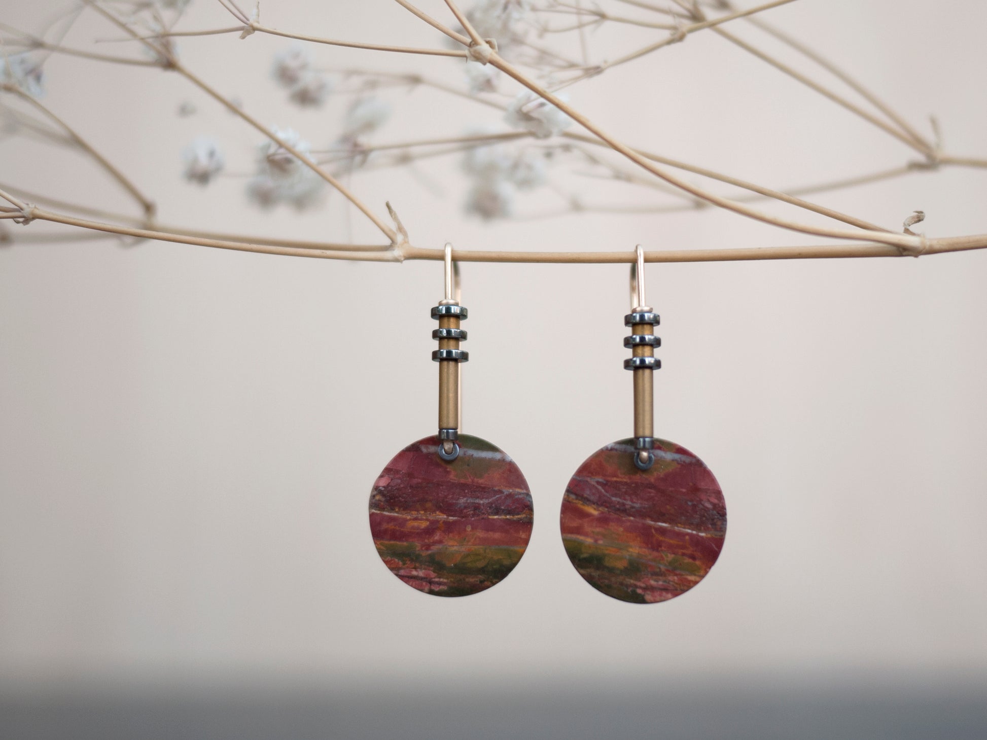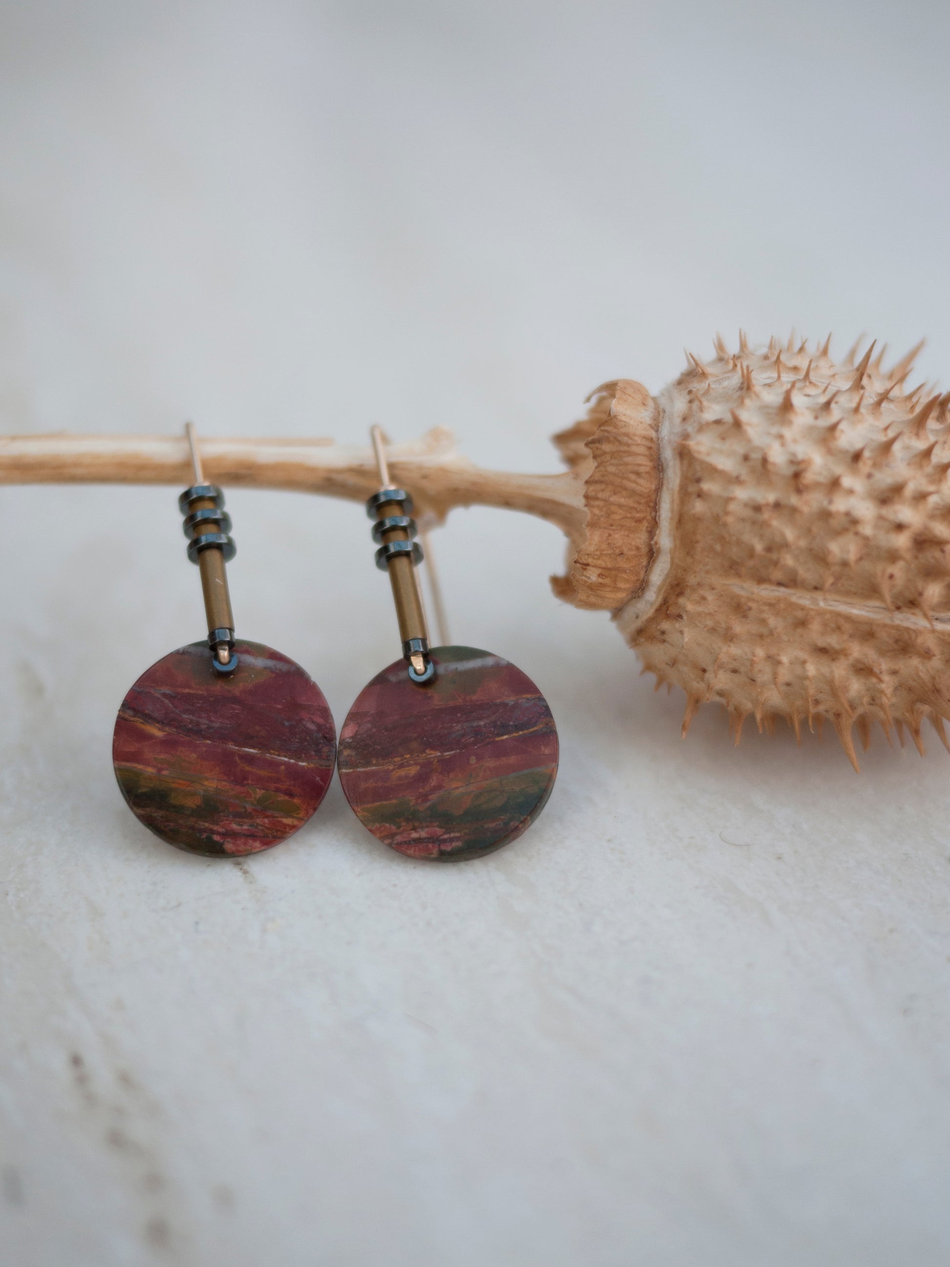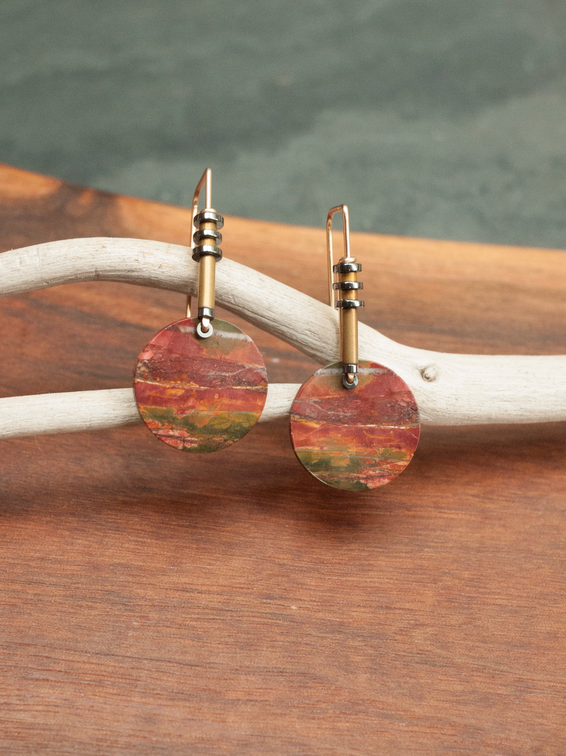 These striking red creek jasper stones have an abstract pattern in orange, yellow, green, and brown. Dangles from a yellow gold fill wire and adorned with hematite beads. Earrings come with rubber backing.
