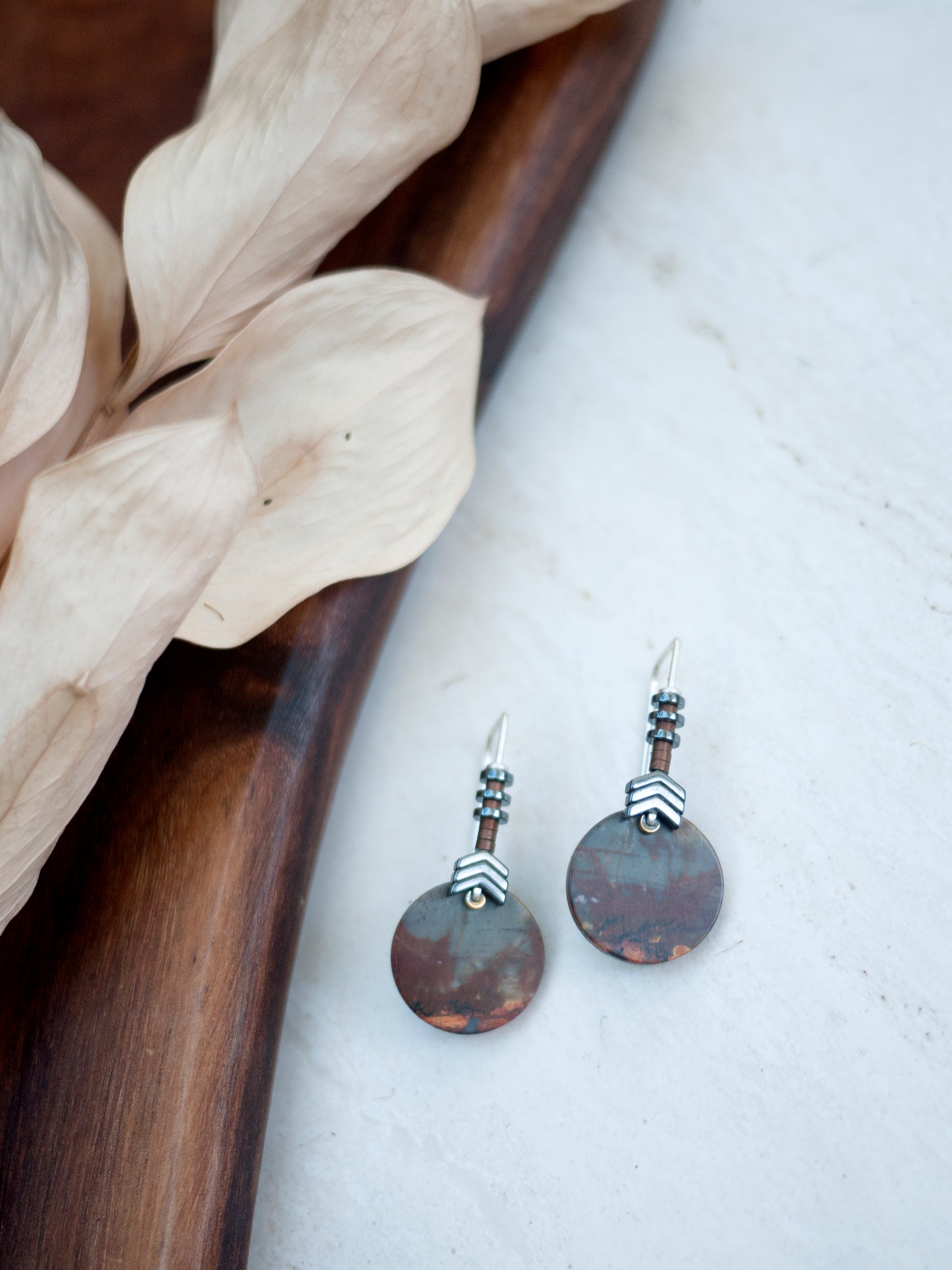 These striking red creek jasper stones have an abstract pattern in yellow, grey/blue, and brown. The stones dangle from solid sterling silver wire and adorned with grey and matte gold hematite beads. Earrings come with rubber backing.