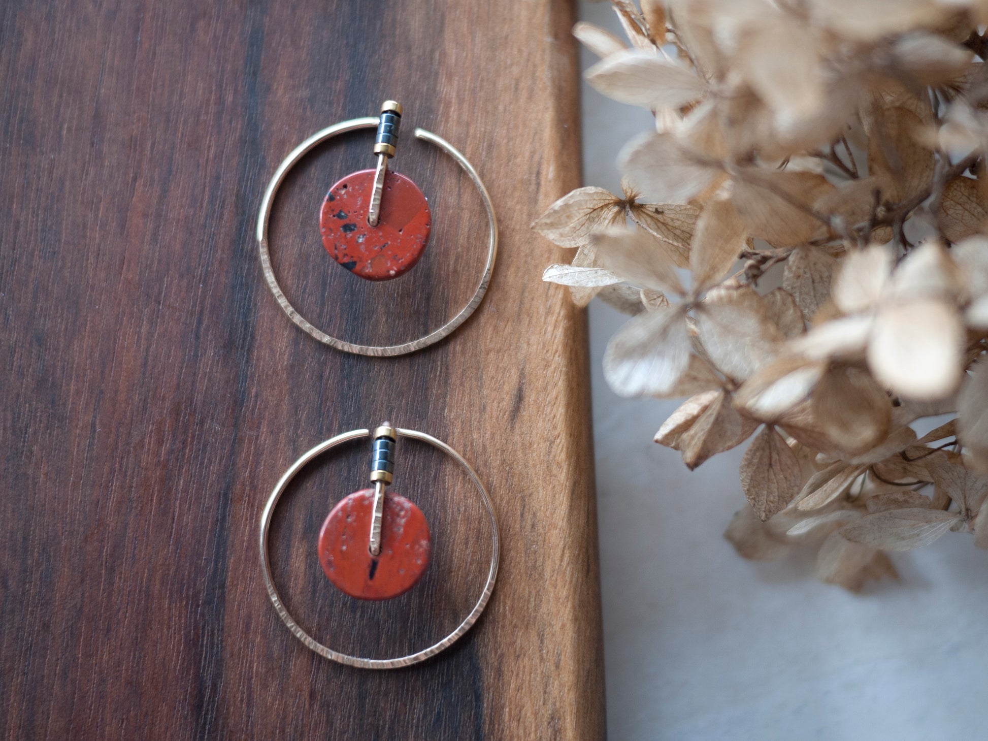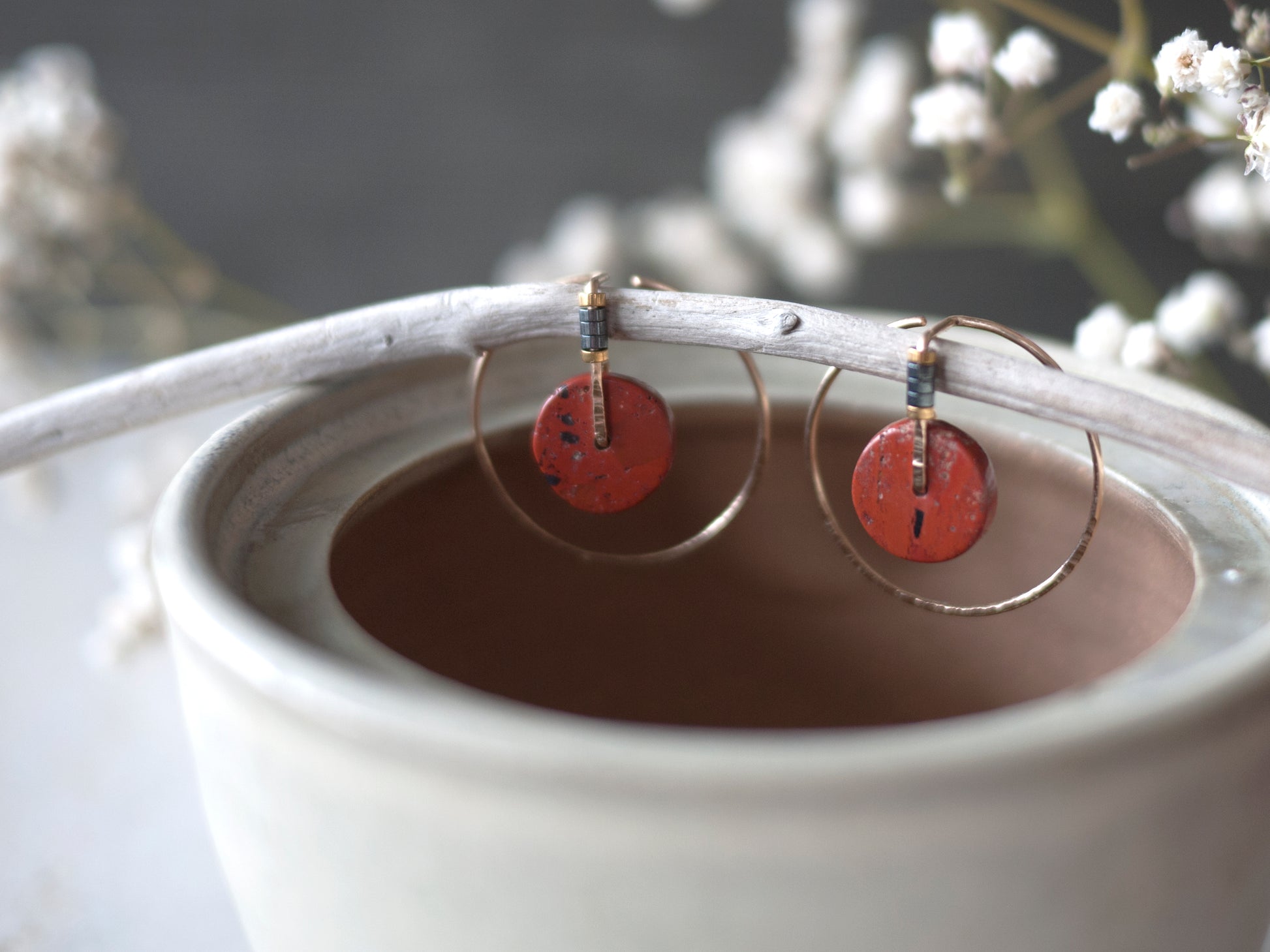These yellow gold fill ear jackets are sure to attract attention. The wire is accented with red jasper discs and hematite beads. The big wire circle threads through the piercing and sits behind the lobe.