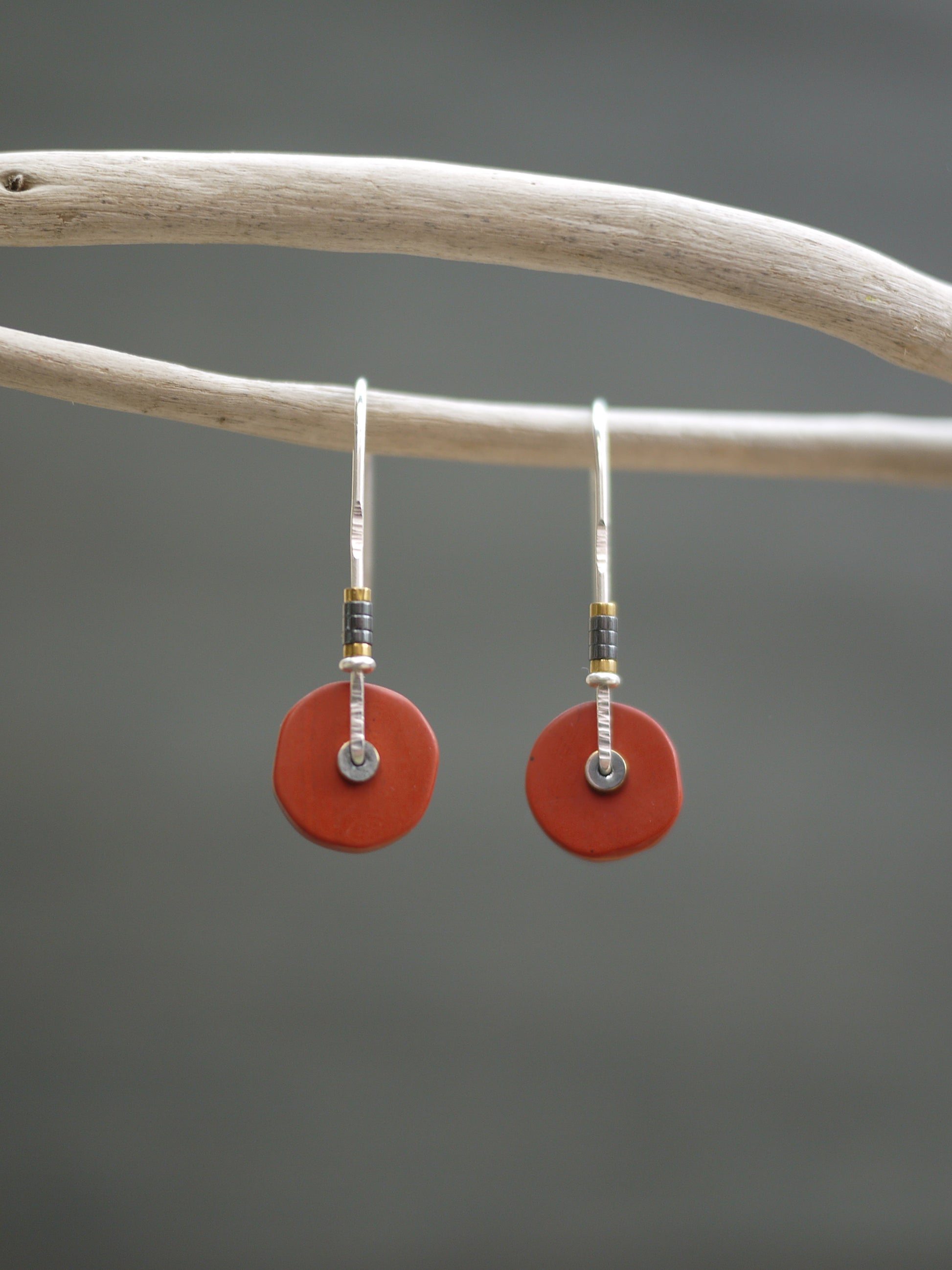 These fun earrings are simple from the front but a party in the back! The wire is accented with a red jasper discs and hematite beads. In the back, a line of hematite beads make a pleasing pattern and added interest to the earrings. Earrings come with rubber backings.