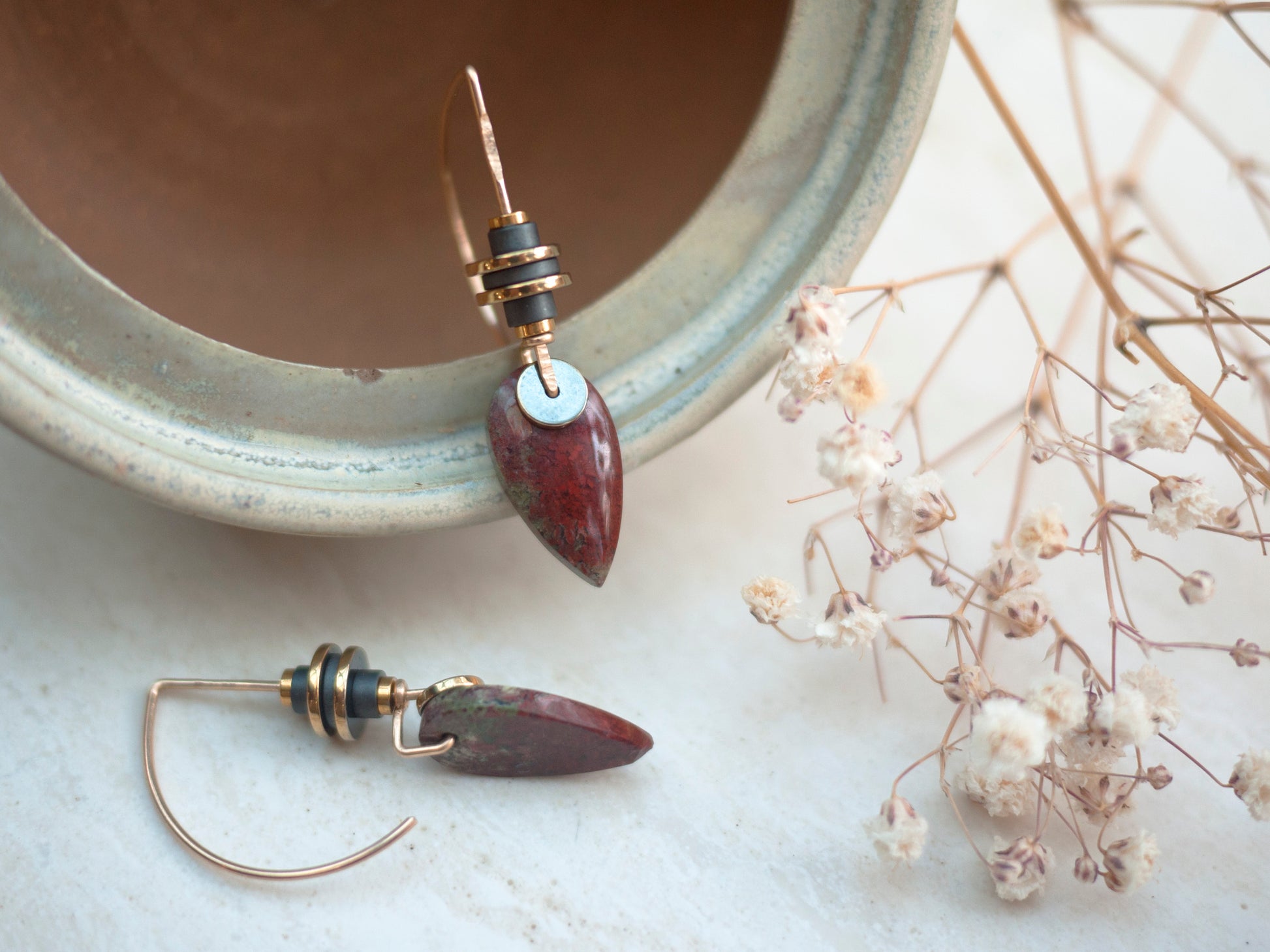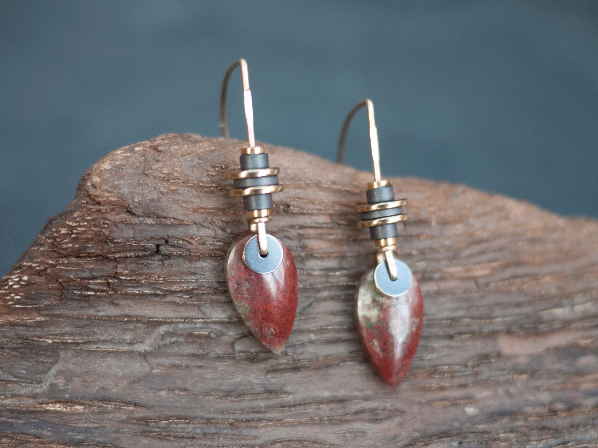 Inverted red moss agate teardrops dangle from hand formed yellow gold fill wire. The wire is hammered for texture, and accented with a pattern of gold and gray hematite beads. These earrings come with rubber backings.