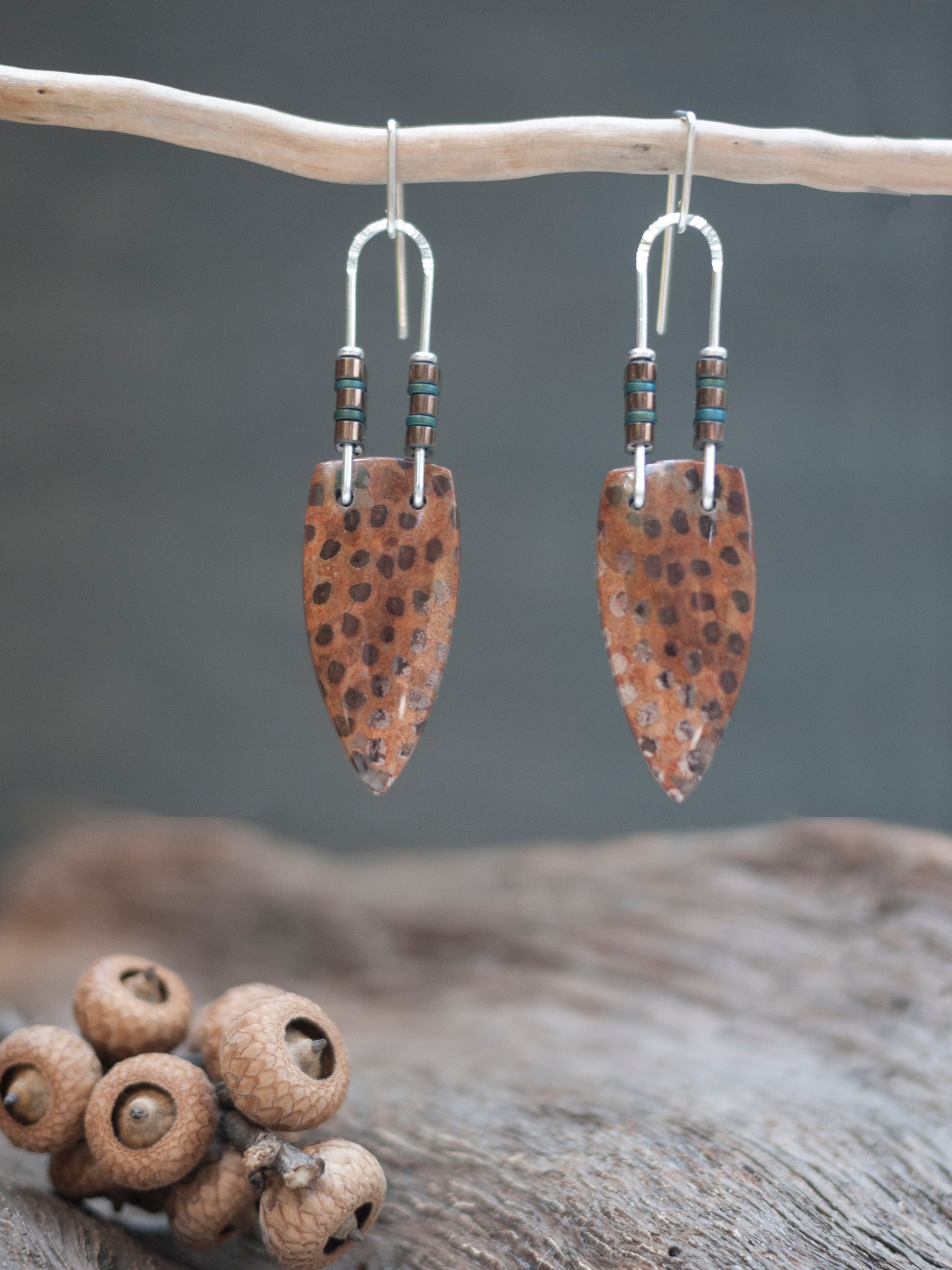 These striking petrified palmwood stones have a beautiful pattern of reddish-browns and would make the perfect accessory for any evening wear. The pattern is animal-print like with small dark circles. They dangle from sterling silver wire adorned with copper and gray hematite beads. Portions of wire are hammered for sparkle and texture.