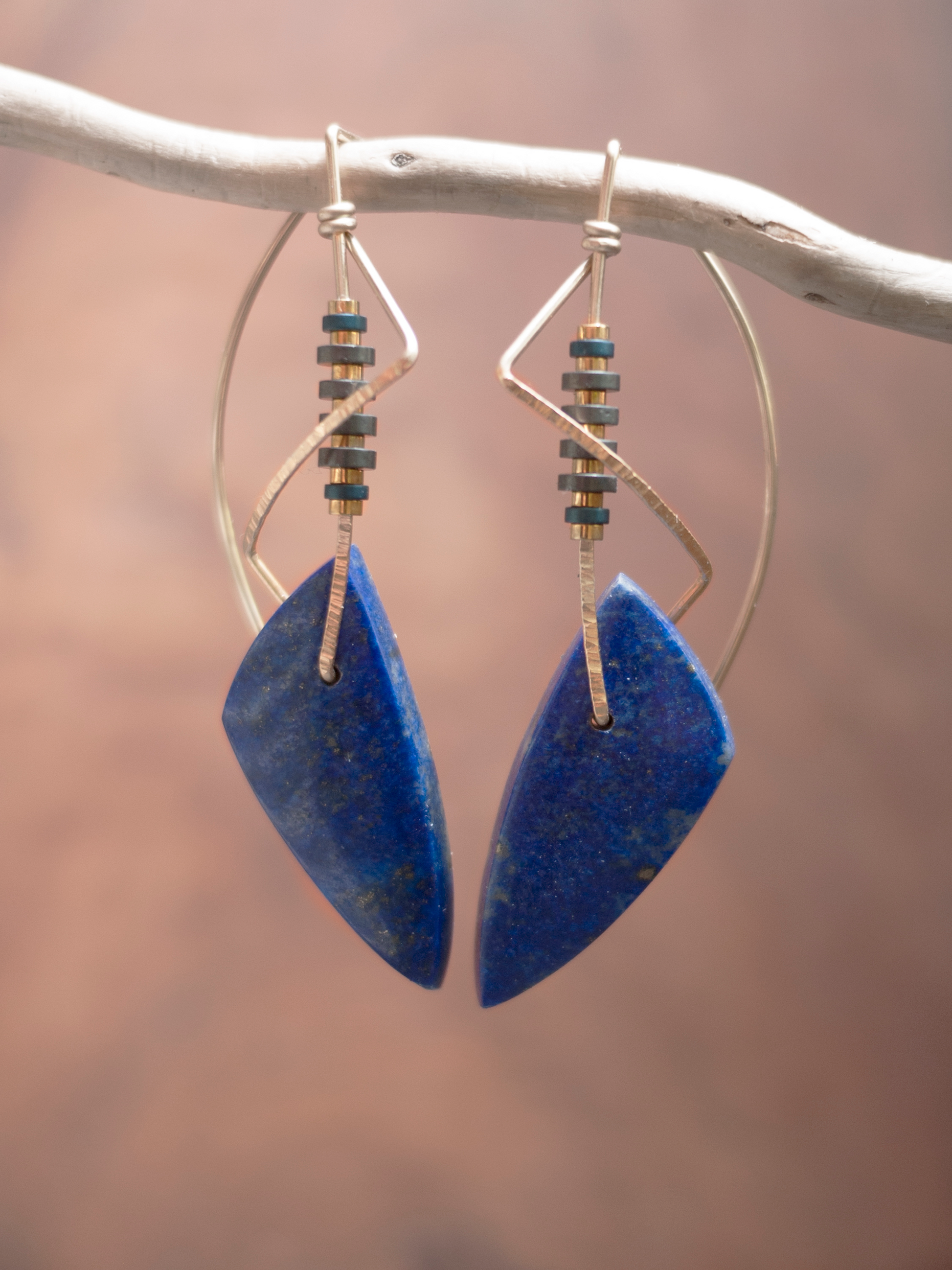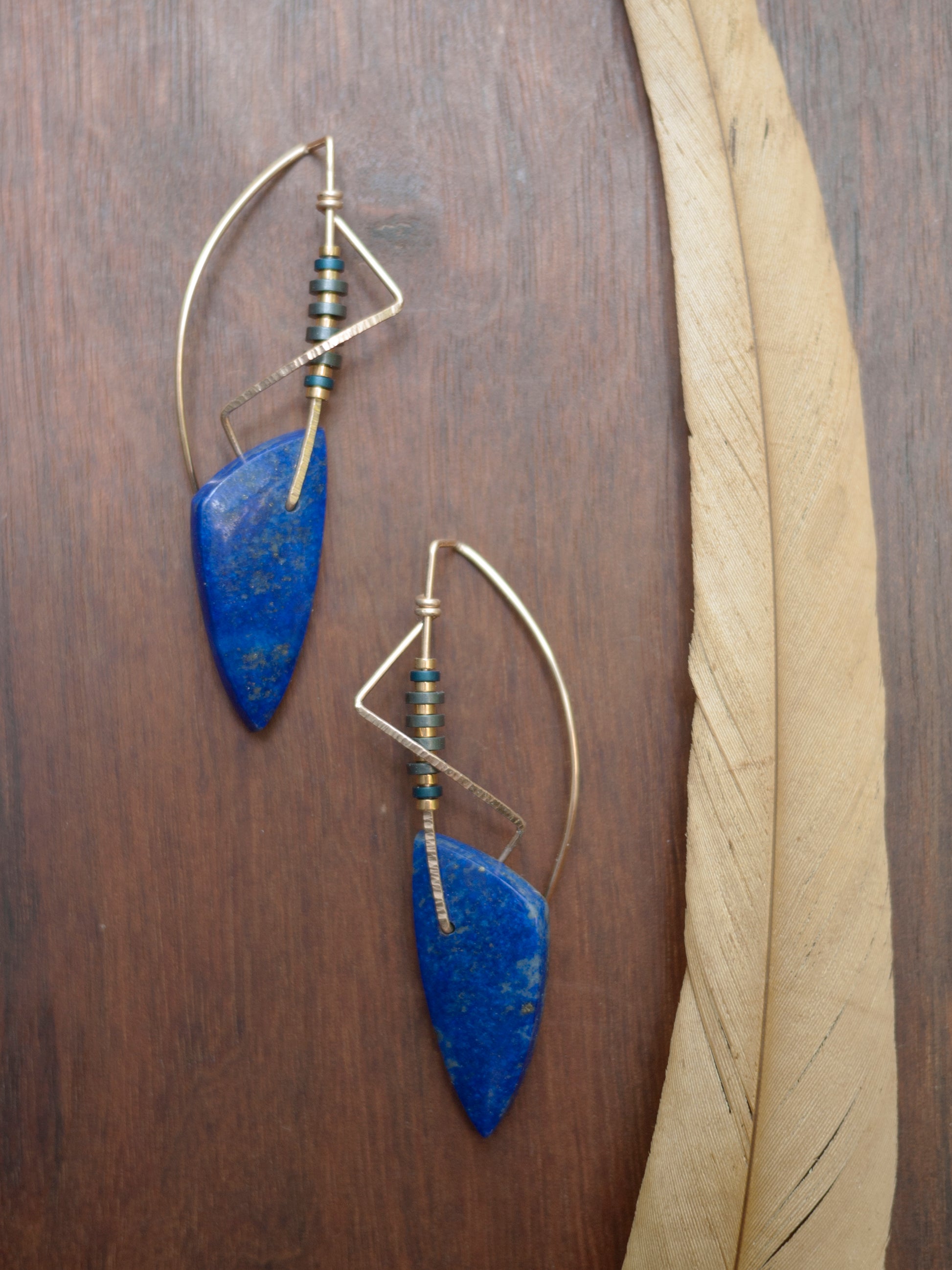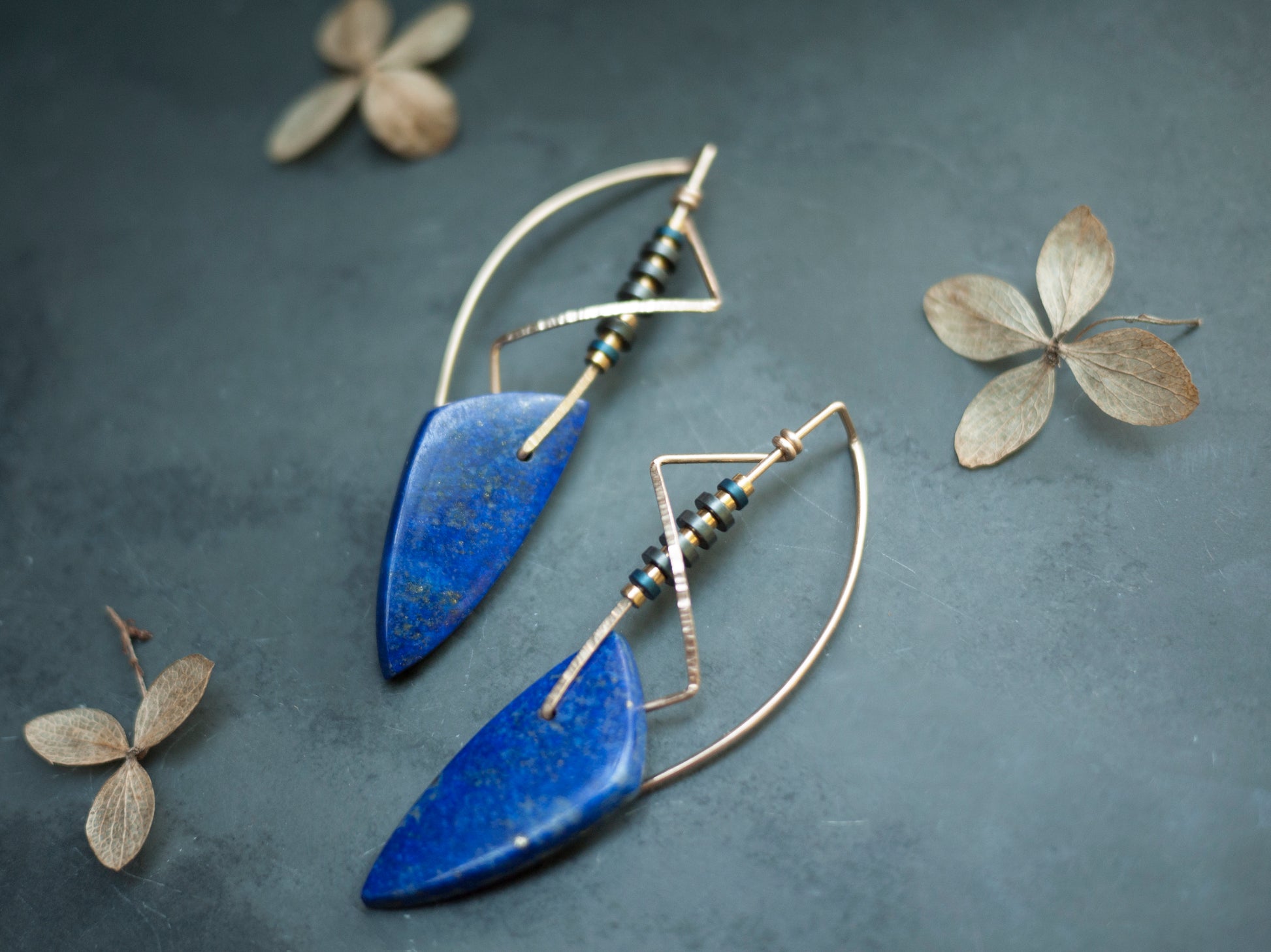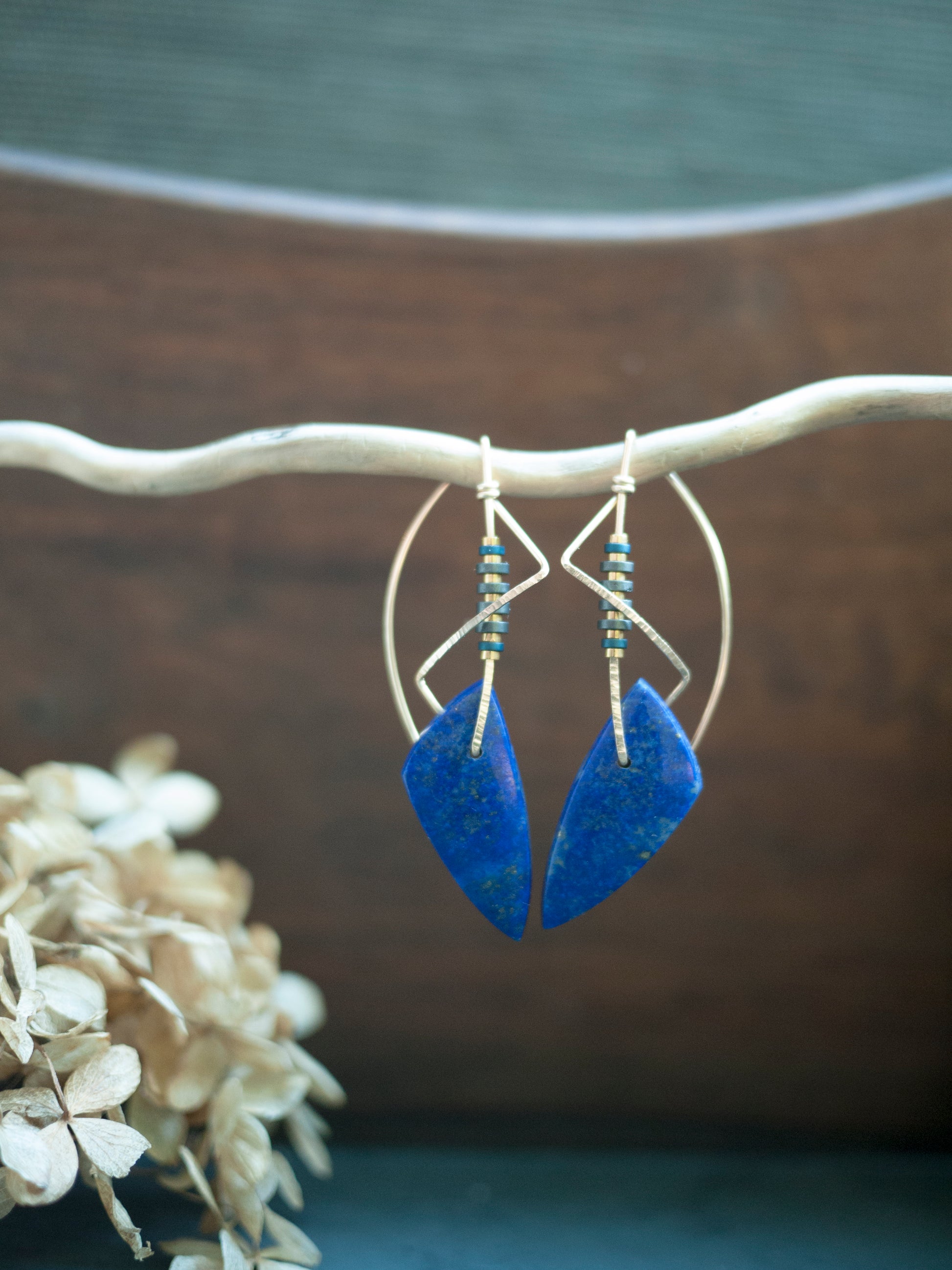 Lapis is one of my favorite stones to make into jewelry. It is one of the oldest stone materials used in jewelry making and I can see why. These one of a kind hand cut pair were perfect inspiration for these earrings. Their triangular shape has been adorned with hand formed gold filled wire. Blue and gold hematite beads adorn the wire. The wire is hammered to add sparkle and texture. These earrings come with rubber backings.