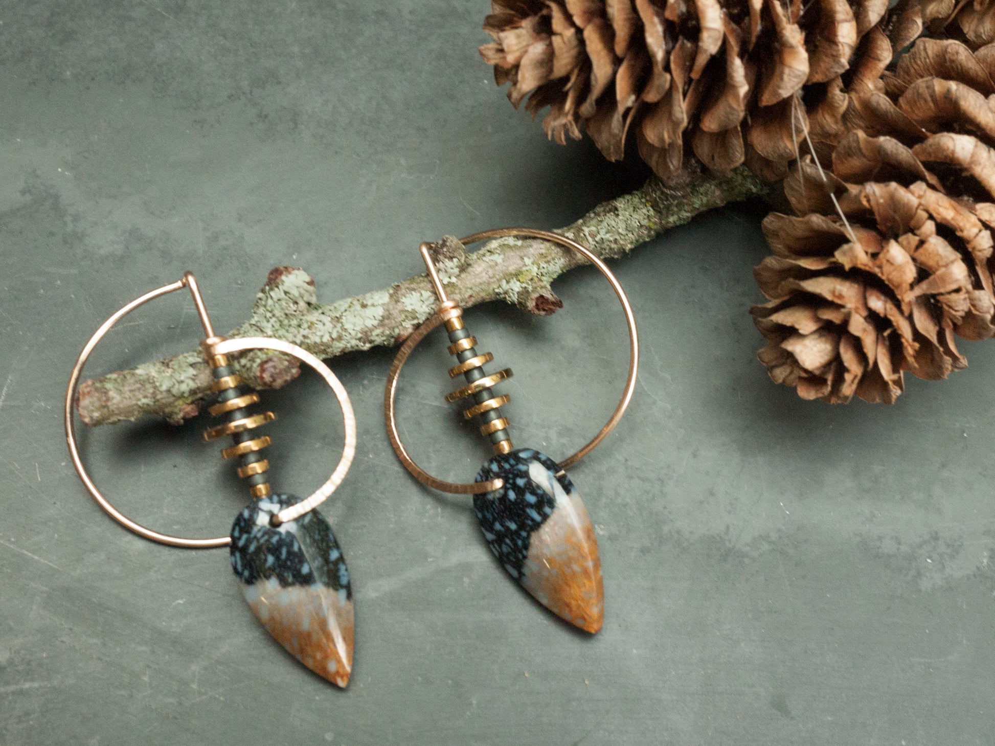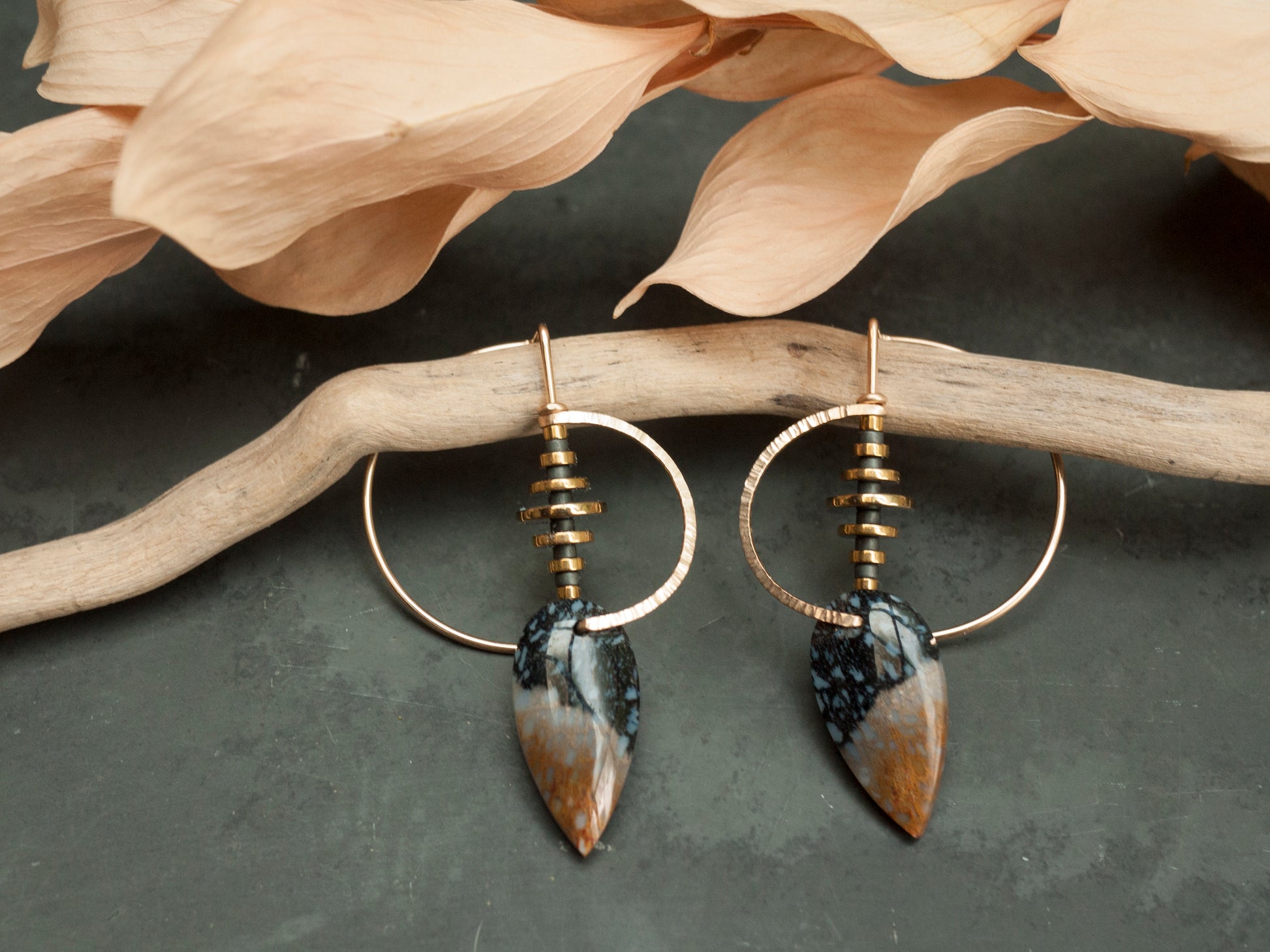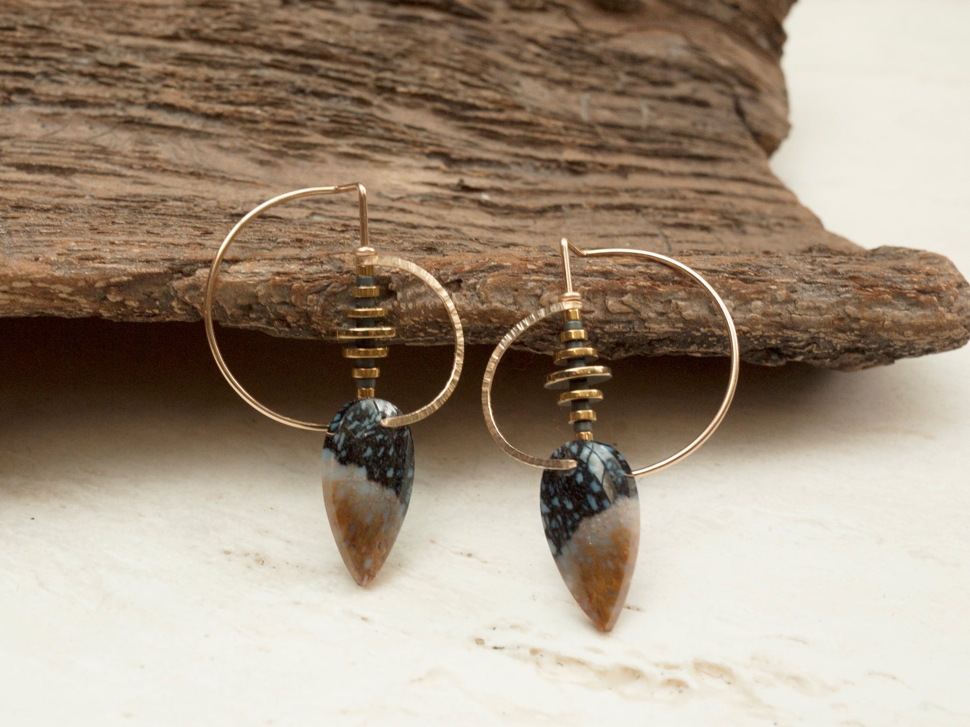 These striking petrified palm wood stones have a beautiful pattern of reddish-browns and would make the perfect accessory for any evening wear. The pattern is animal-print like with small dark circles. They dangle from 14K yellow gold fill wire adorned with gold and gray hematite beads. Portions of wire are hammered for sparkle and texture.