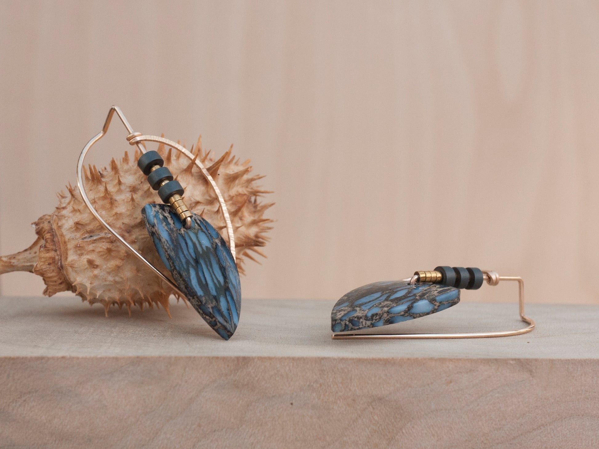 These blue and grey colored petrified palm wood stones have a unique swirl pattern. The yellow gold fill wire is bent to follow the lines on the stones. Grey and gold hematite beads adorn the wire. The wire is hammered to add sparkle and texture. Earrings come with rubber backings.