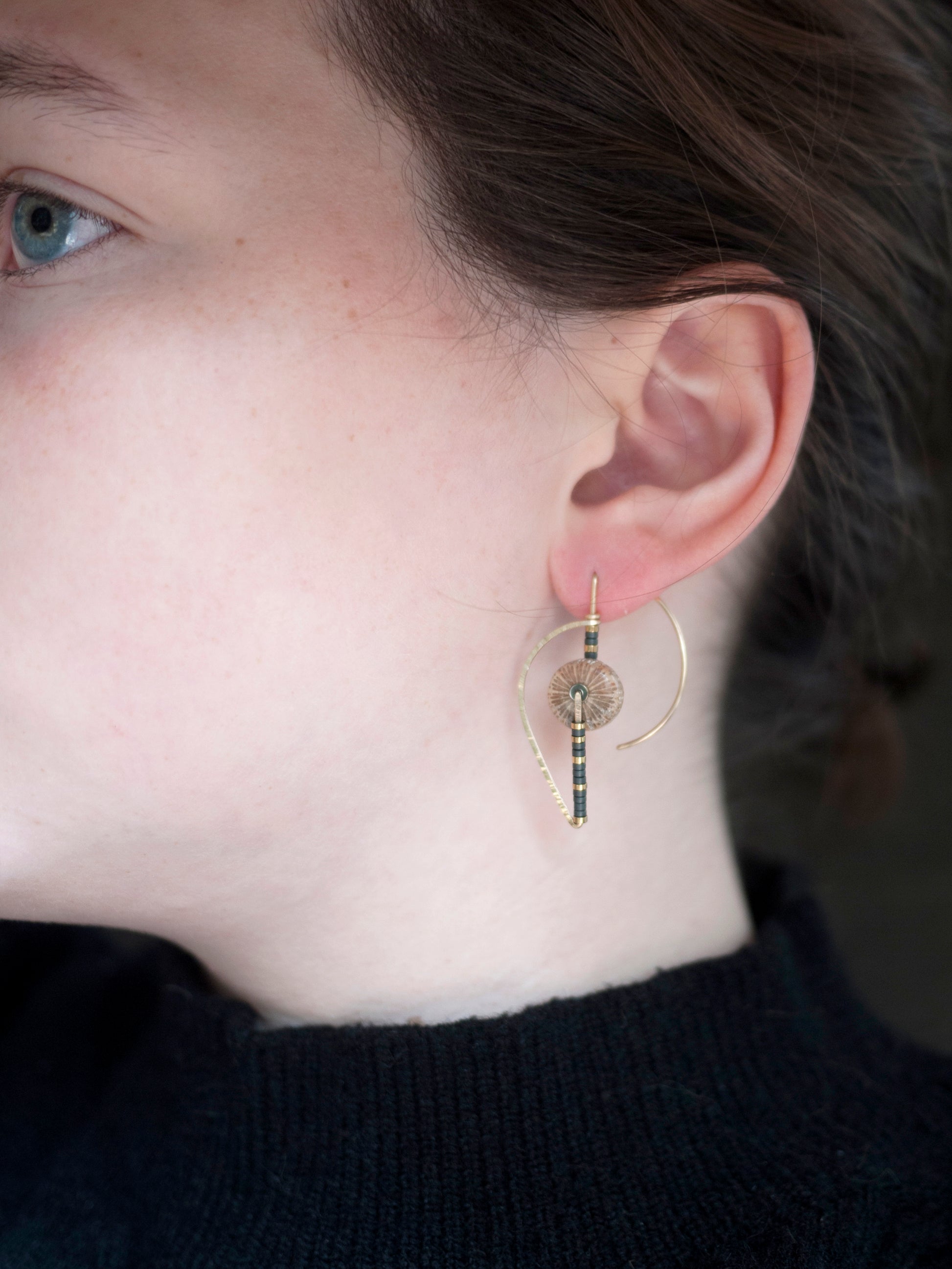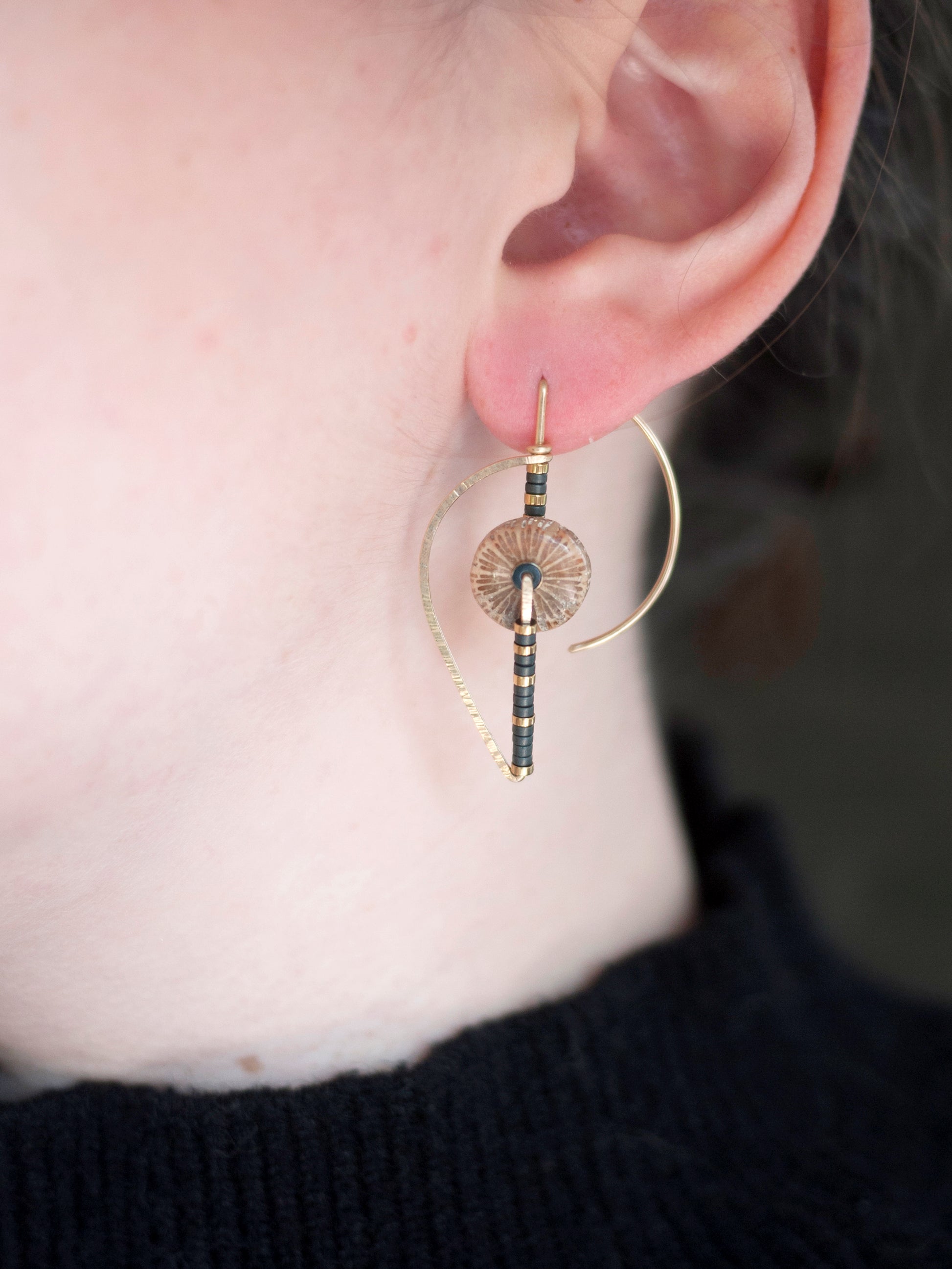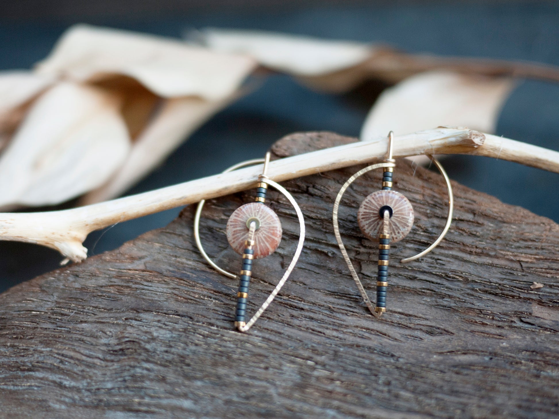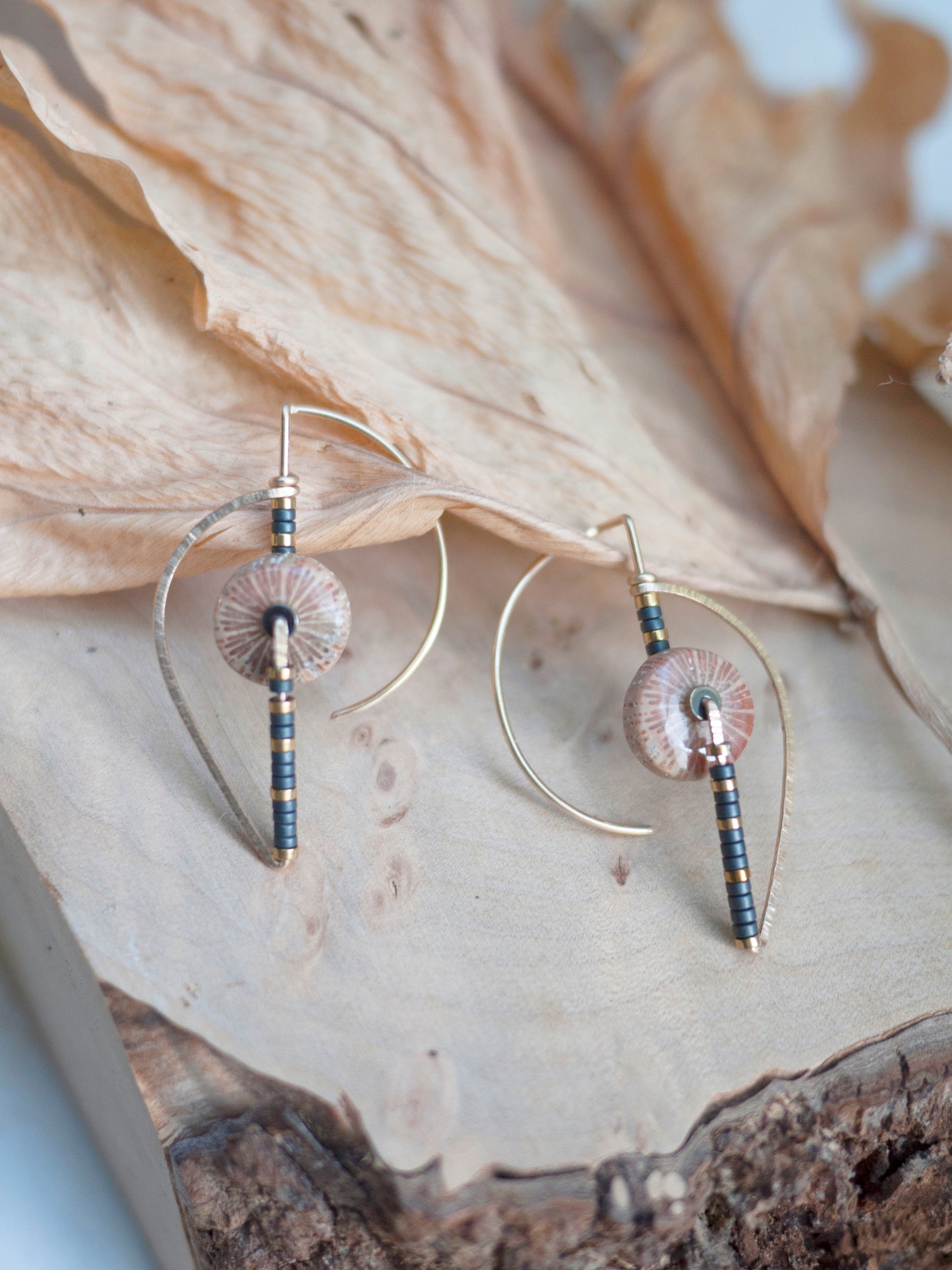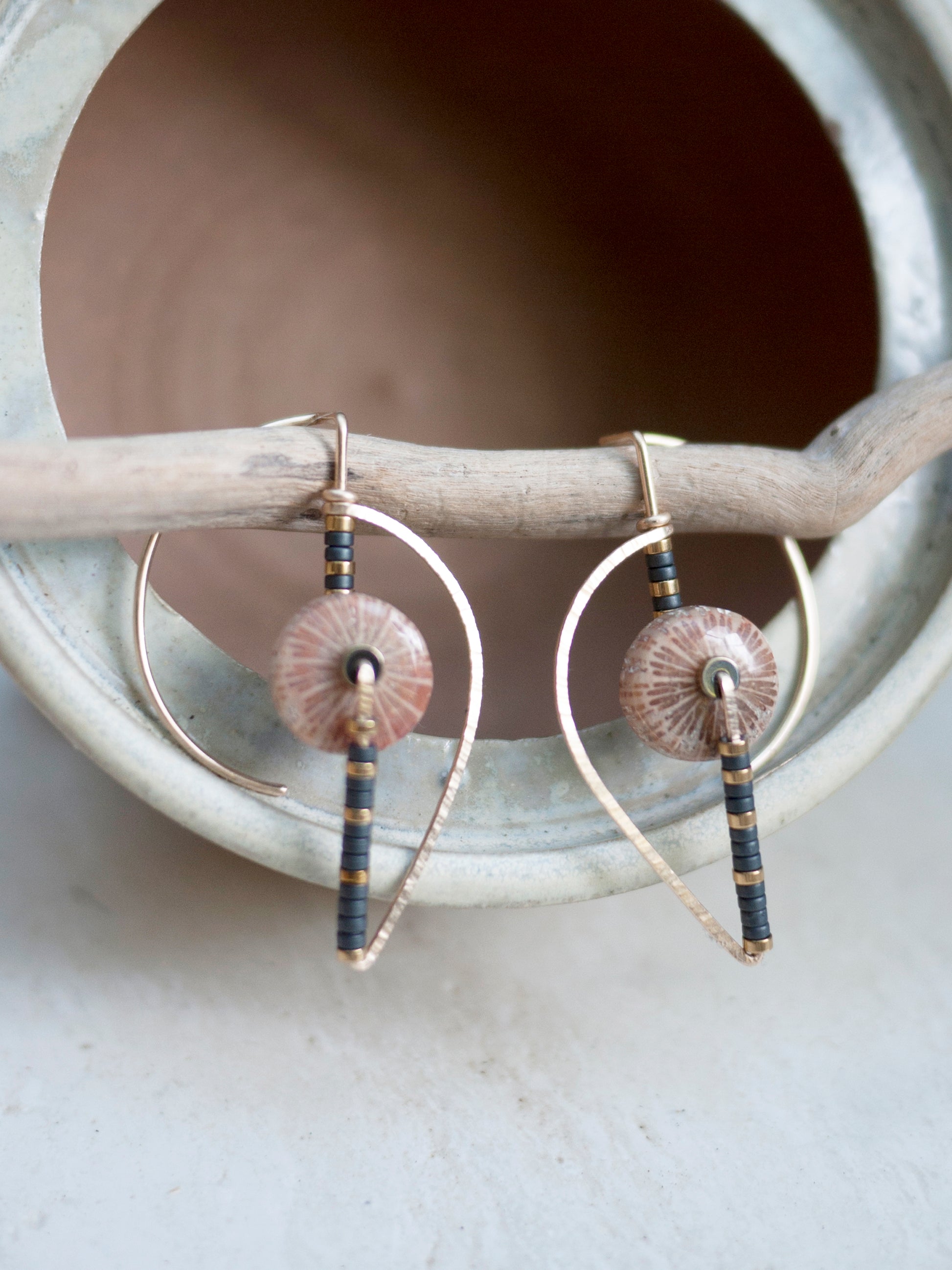 Wear a piece of natures past with these pink fossil coral dangle earrings. Small circle fossil coral stones are accented with yellow gold fill wire and grey and gold hematite beads. The wire is hammered to give texture and sparkle. Arched ear wires add extra interest to the overall look. Earrings come with rubber backings