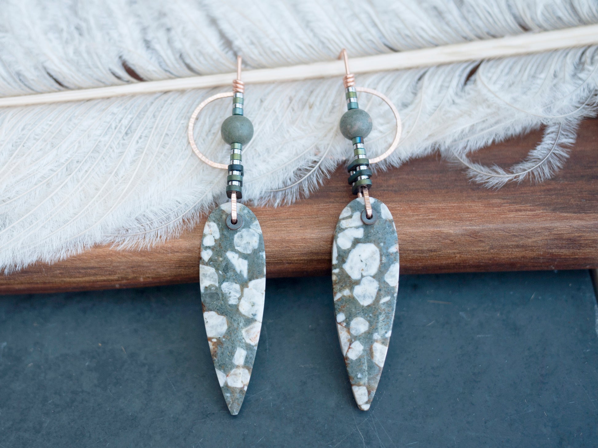 These beautiful patterned brecciated jasper stones have white spots atop a muted green background. The stones hang from rose gold fill wire adorned in green and gold hematite beads. These earrings have unique shaped ear wires that look beautiful when worn. Earrings come with rubber backings.