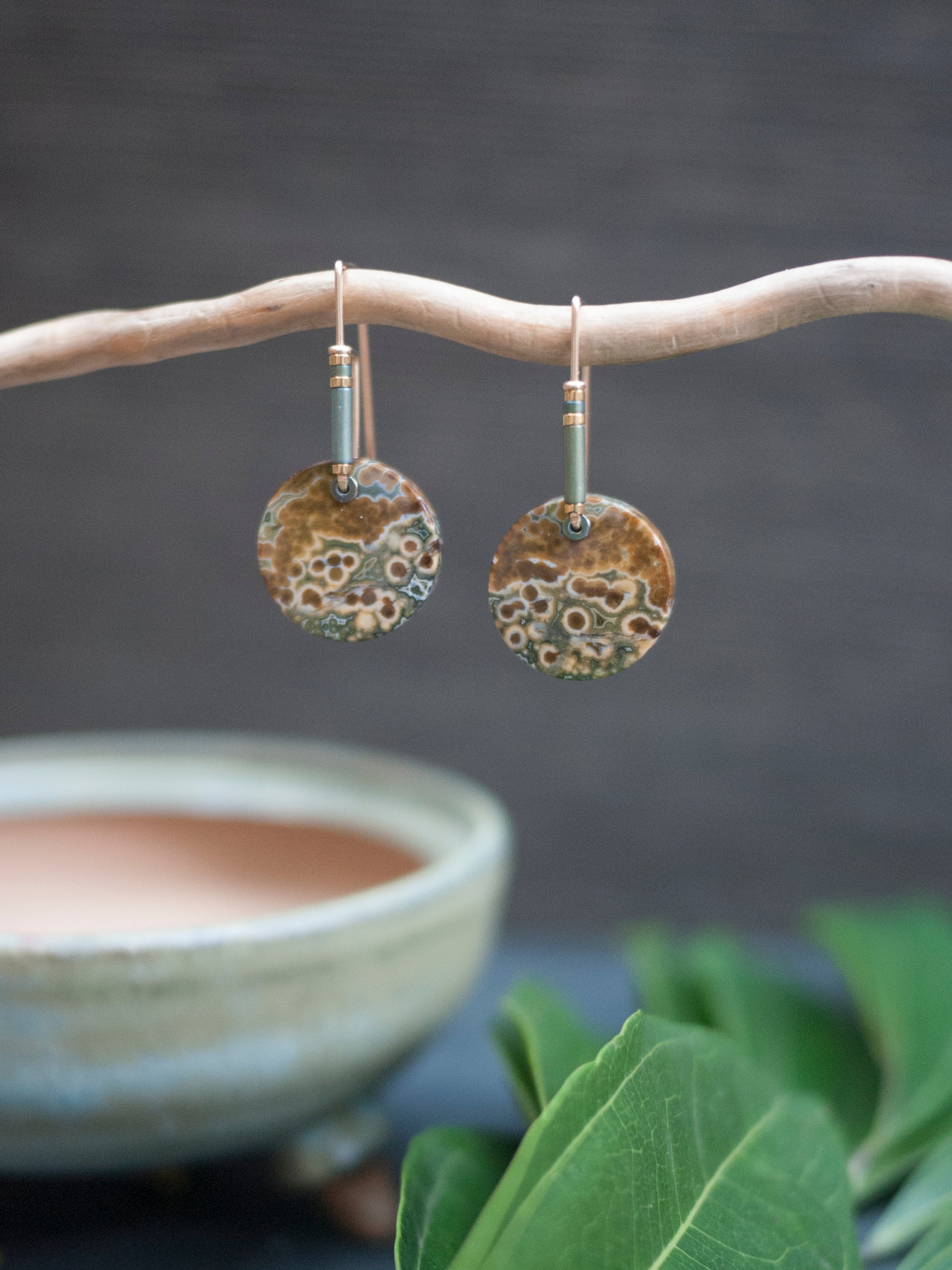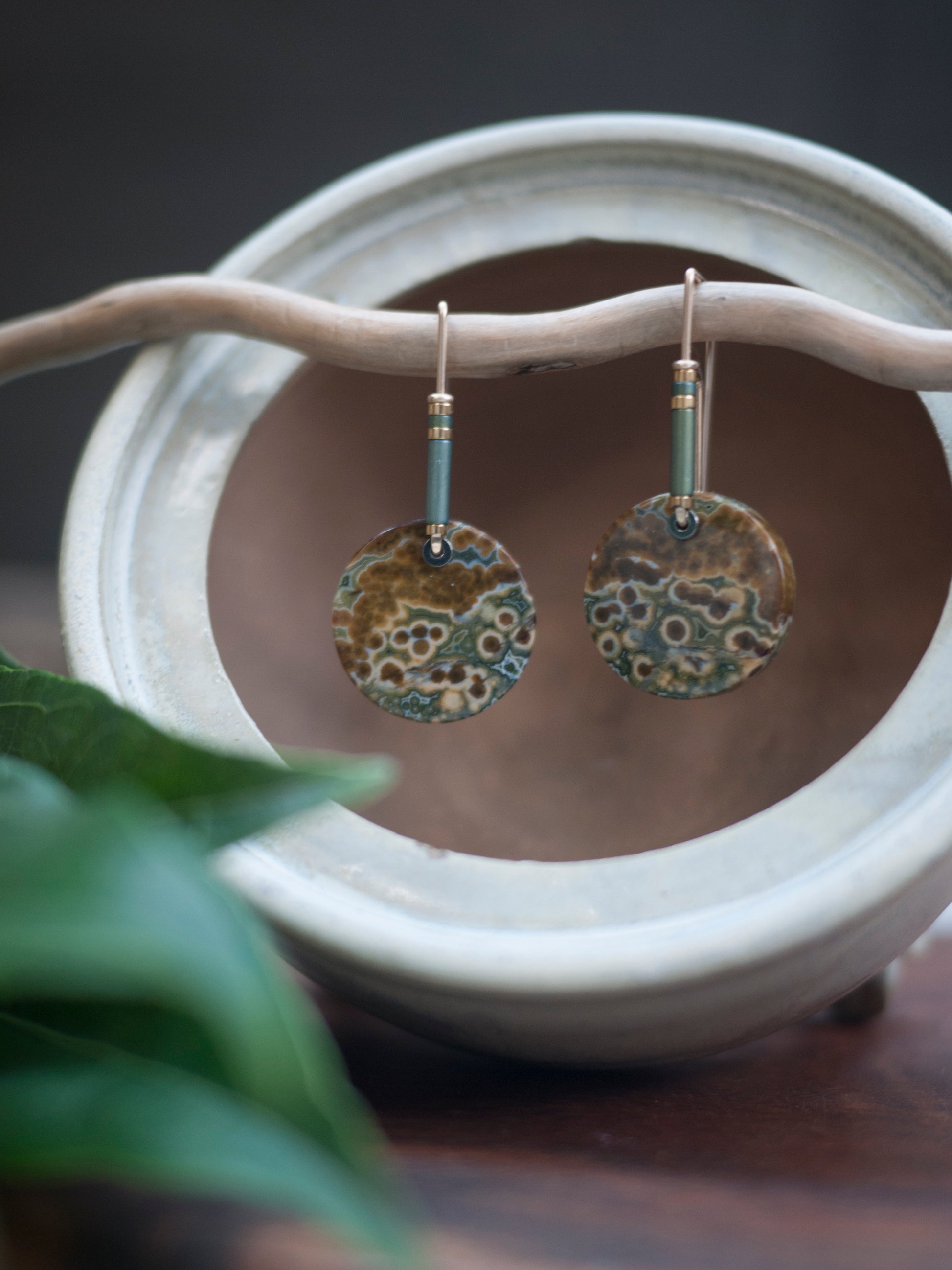 These magnificent pair have a great pattern of concentric circles in greens, tans and rust brown. They are subtly adorned with hematite beads of gold and green and yellow gold filled wire.