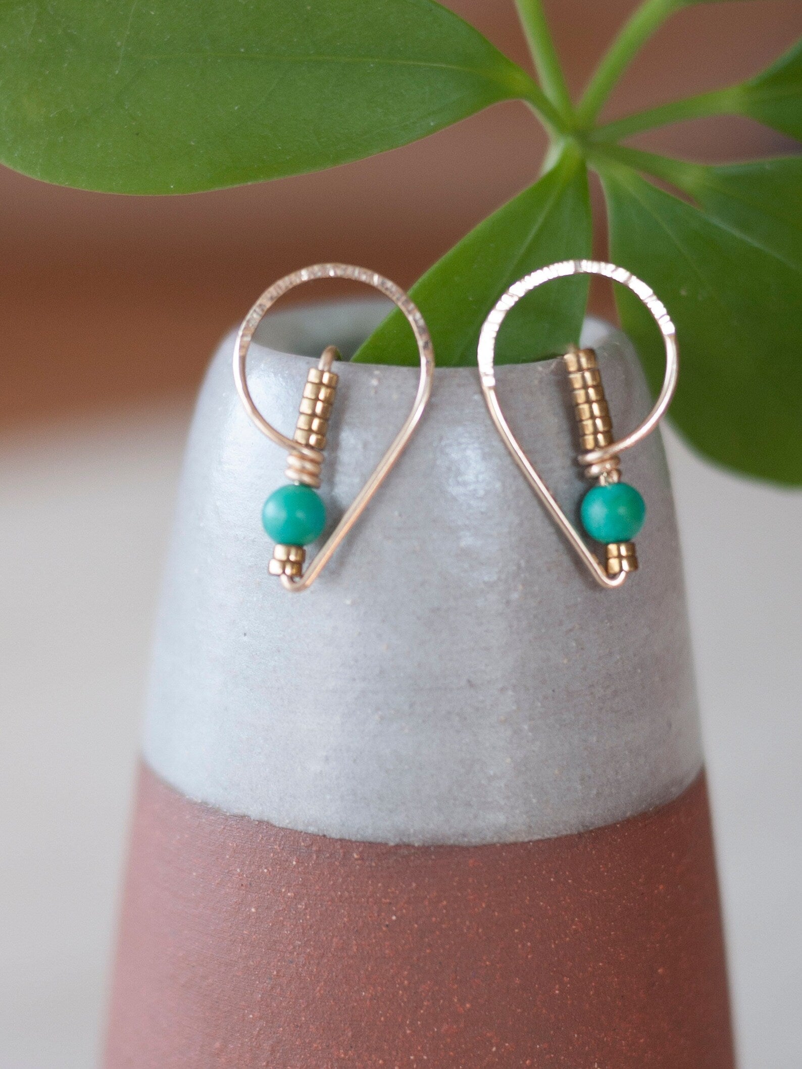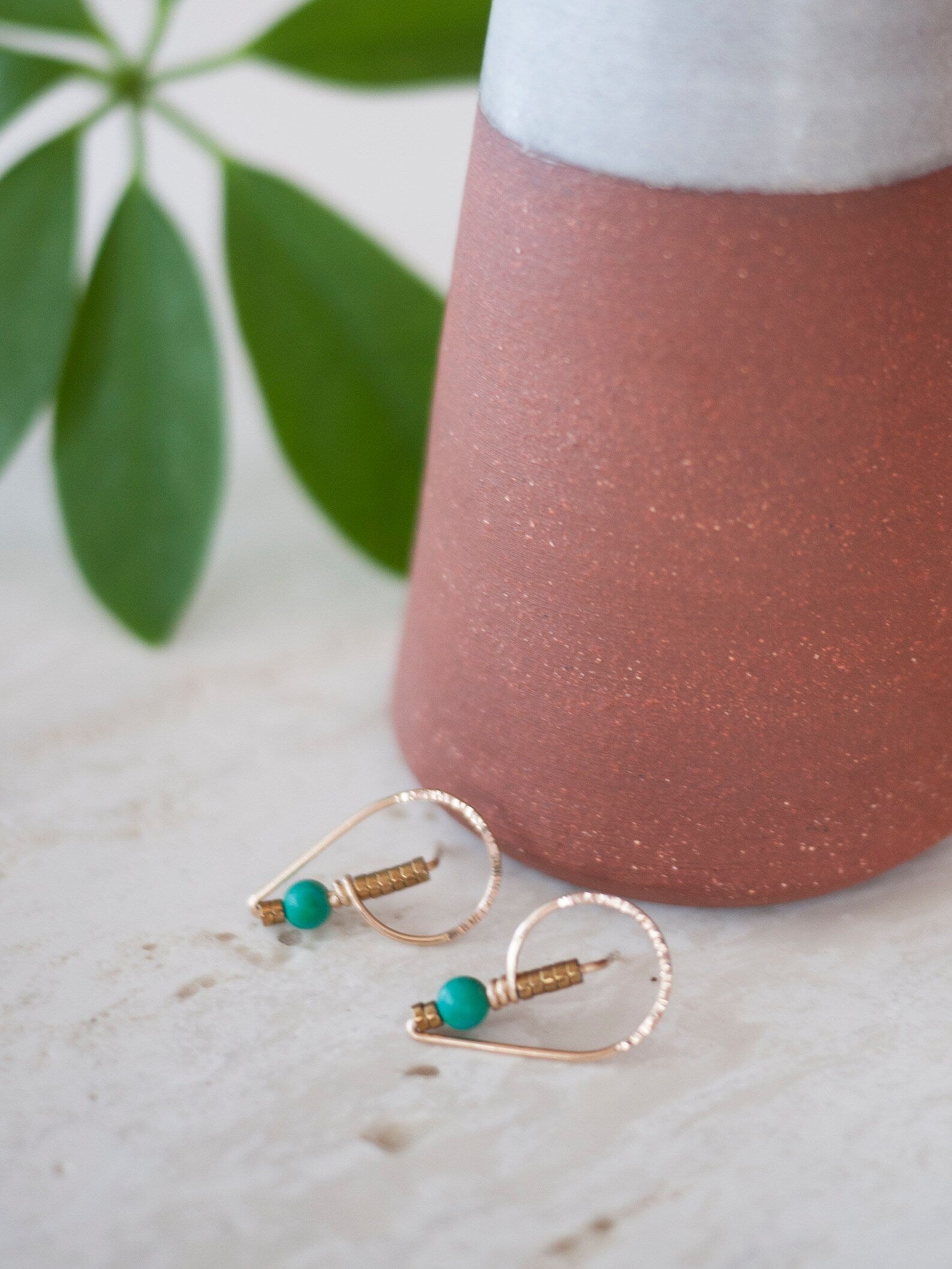 Made from gold fill or silver wire, hematite beads and matte turquoise beads . The wire has portions that are hammered to give the earring a unique combo of texture and smooth.