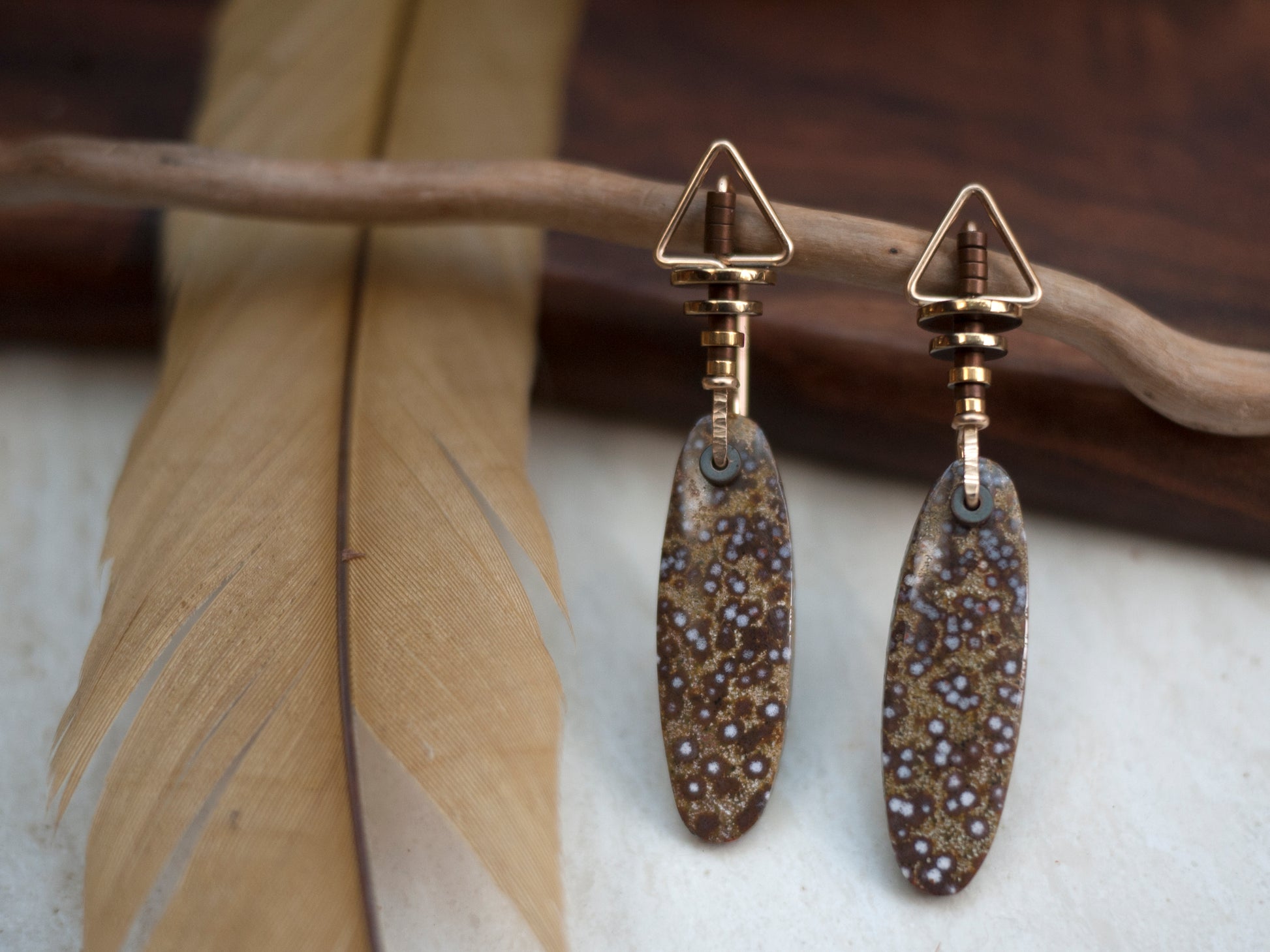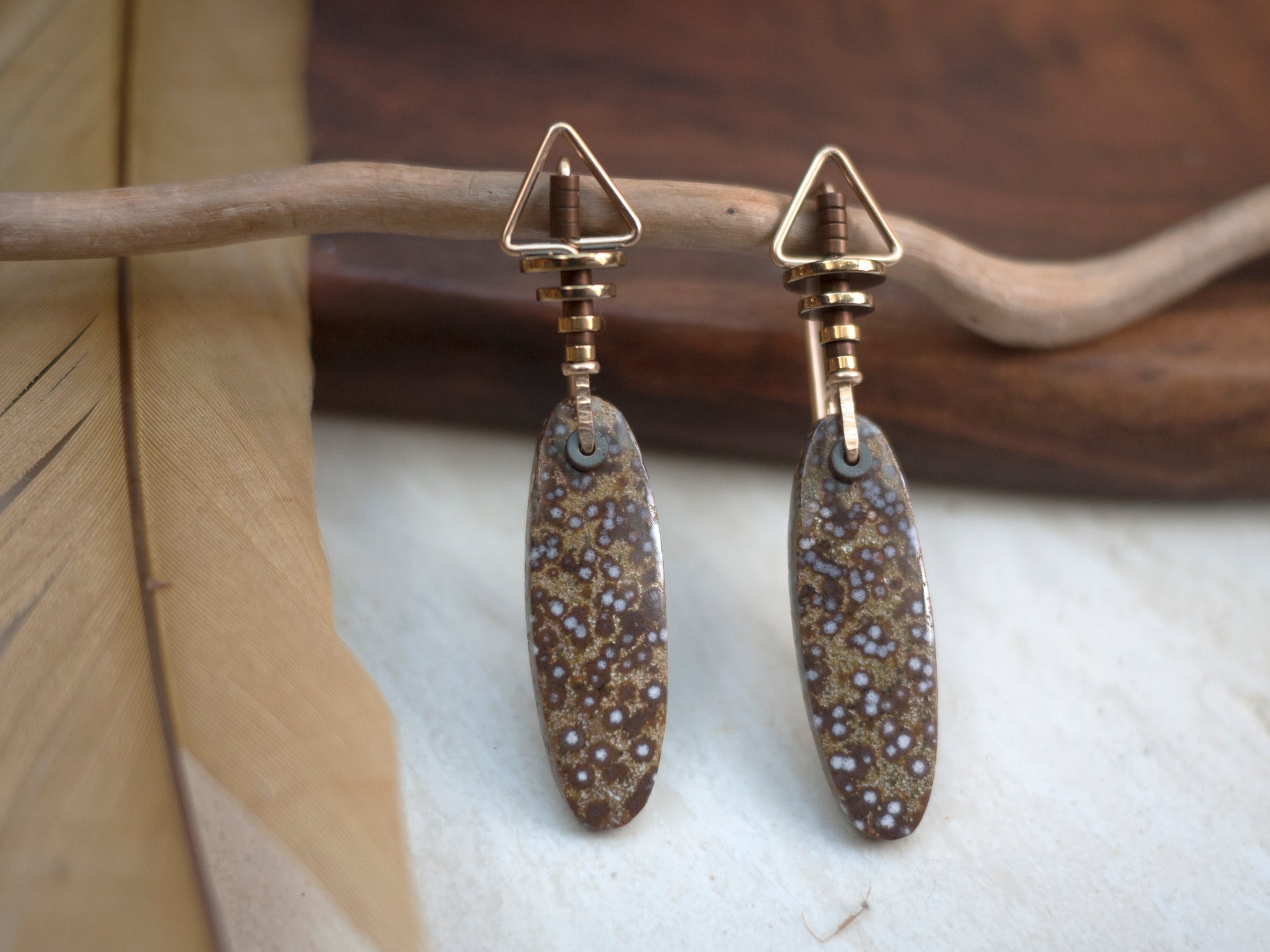 These picturesque river jaspers spears have a beautiful speckled pattern in browns and white. They dangle from yellow gold fill wire adorned with gold and green hematite beads. The wire is bent into triangles to add interest to the top of the earring. Portions of wire are hammered for sparkle.