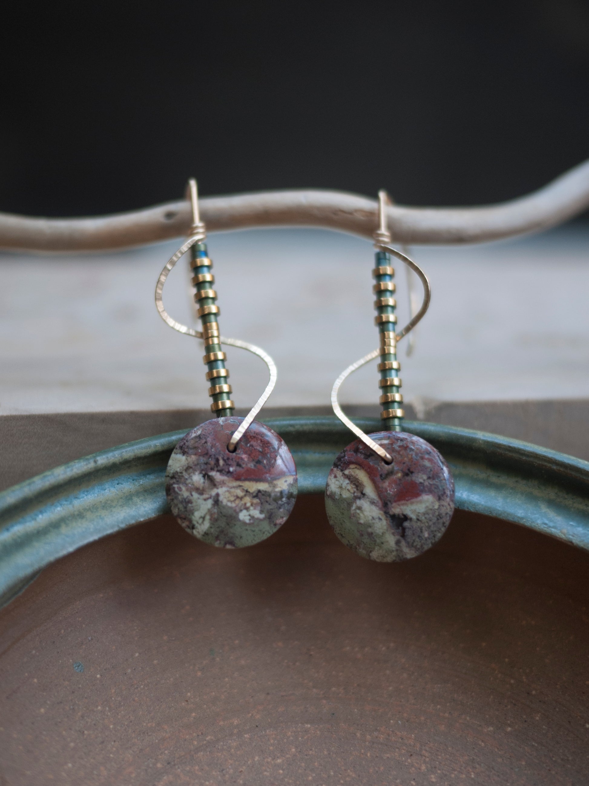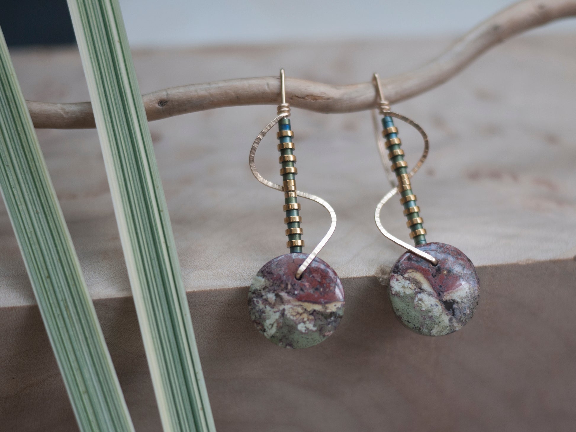 These earrings are unique in form. The beautifully patterned red moss agate beads dangle from spirals of yellow gold filled wire adorned with gold and green hematite beads. The ear wires are long and add intrigue to their style. All Earrings come with rubber backings
