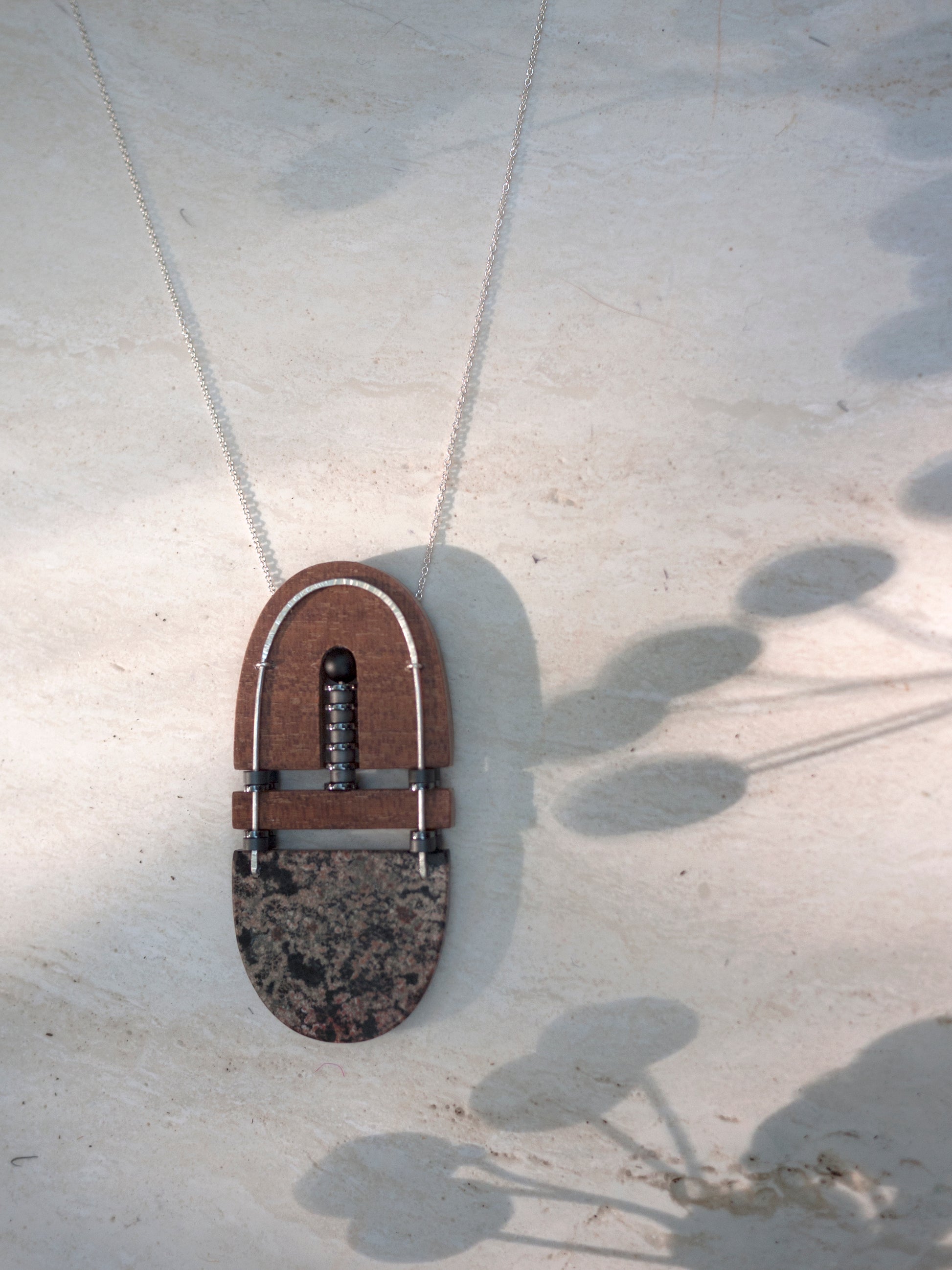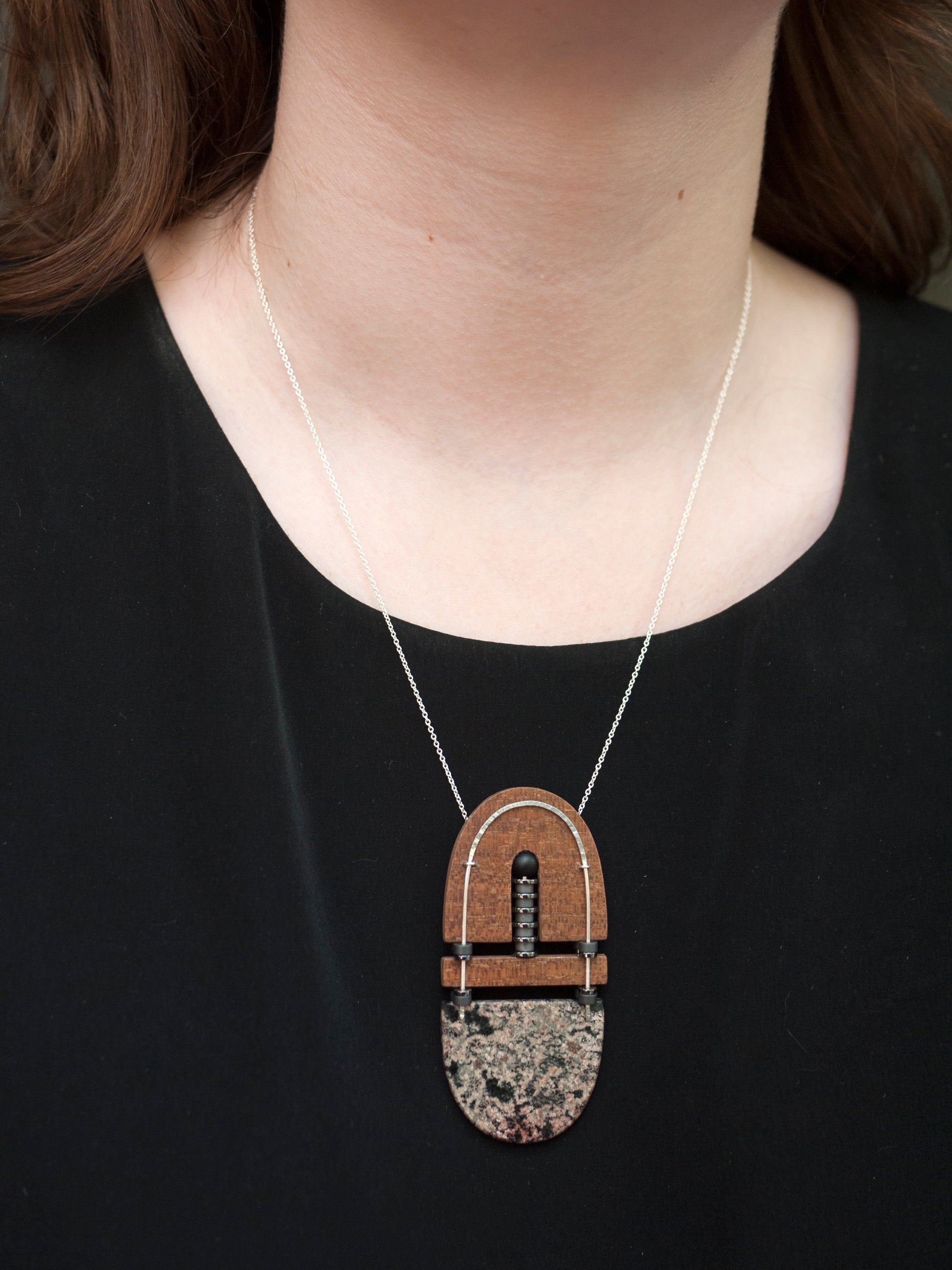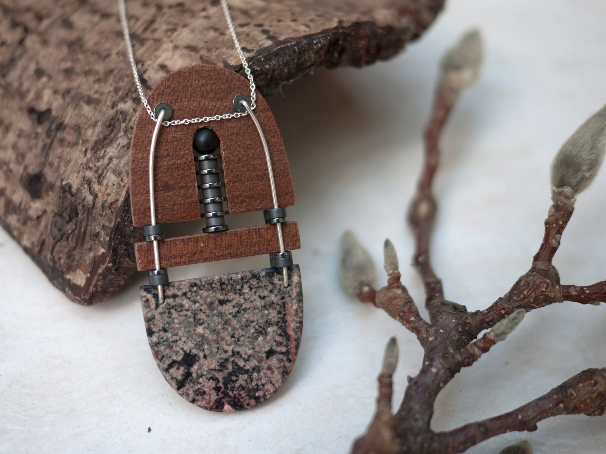 The combination of stone, metal, and wood is classic and sophisticated. My new line of geometric pendants uses this combination in unique but familiar forms.