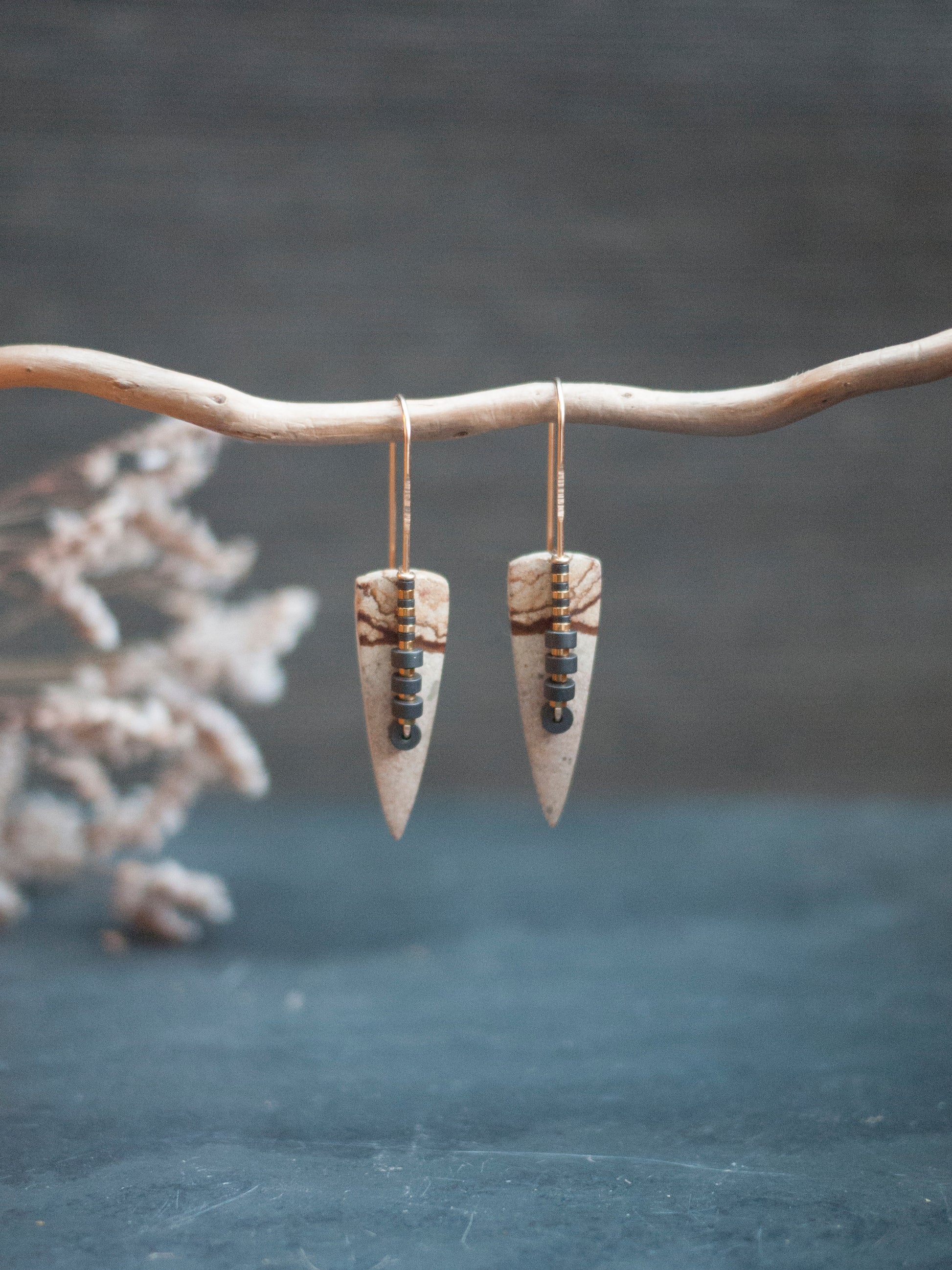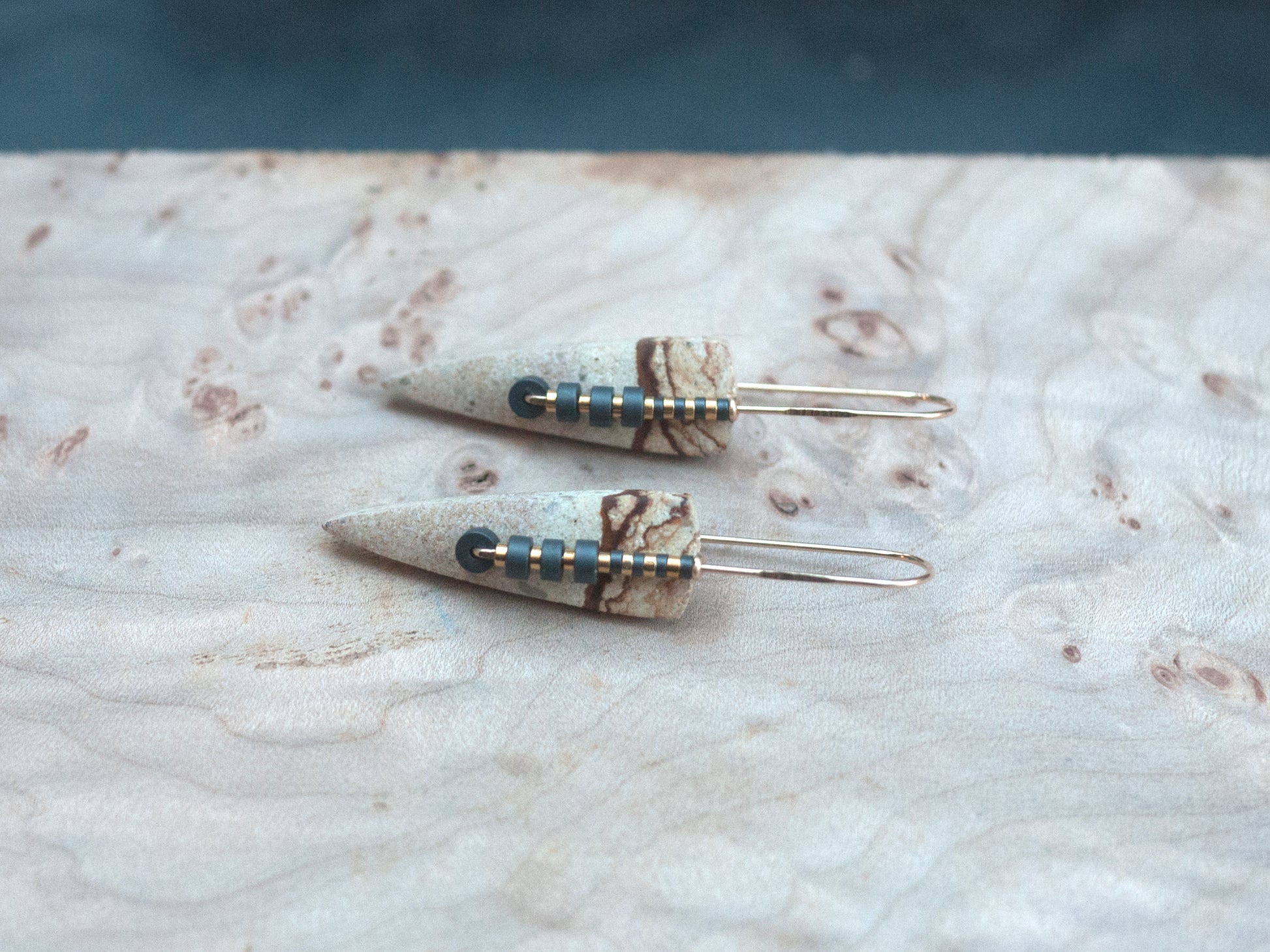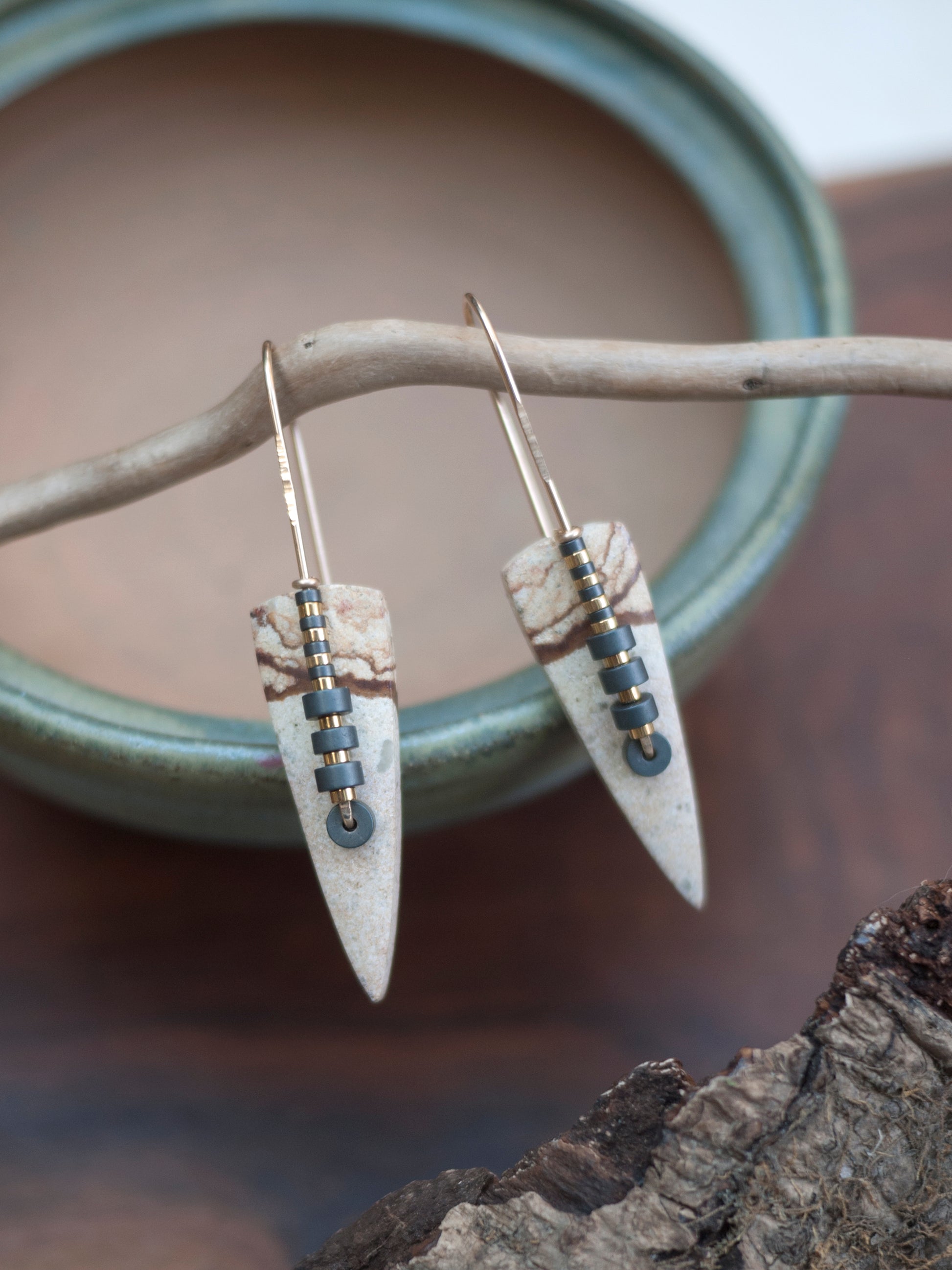These polychrome jasper stones are designed and hand cut specifically for my designs by a lapidary artist in Indonesia. The grey and gold hematite beads contrast the subtle tans and browns in the stones. The yellow gold fill wire is hammered to add sparkle. The ear wires have a slight decorative arch. Earrings come with rubber backings.