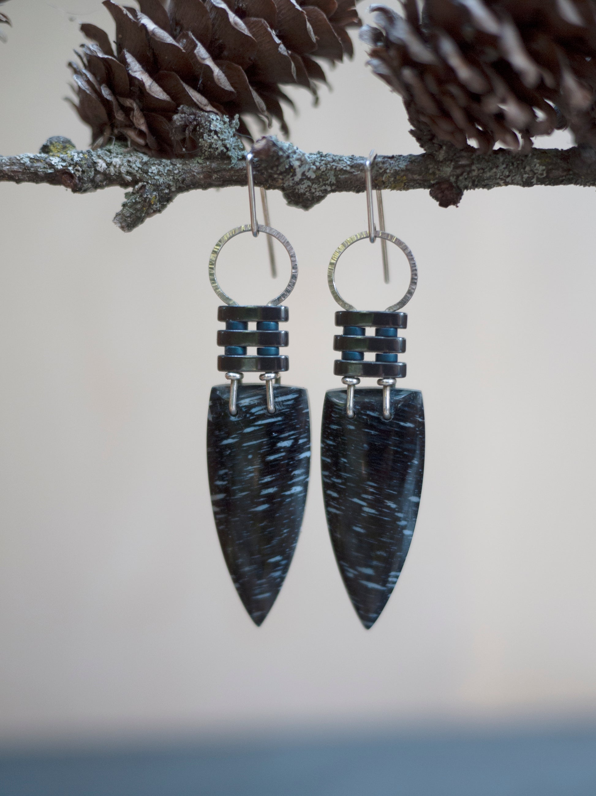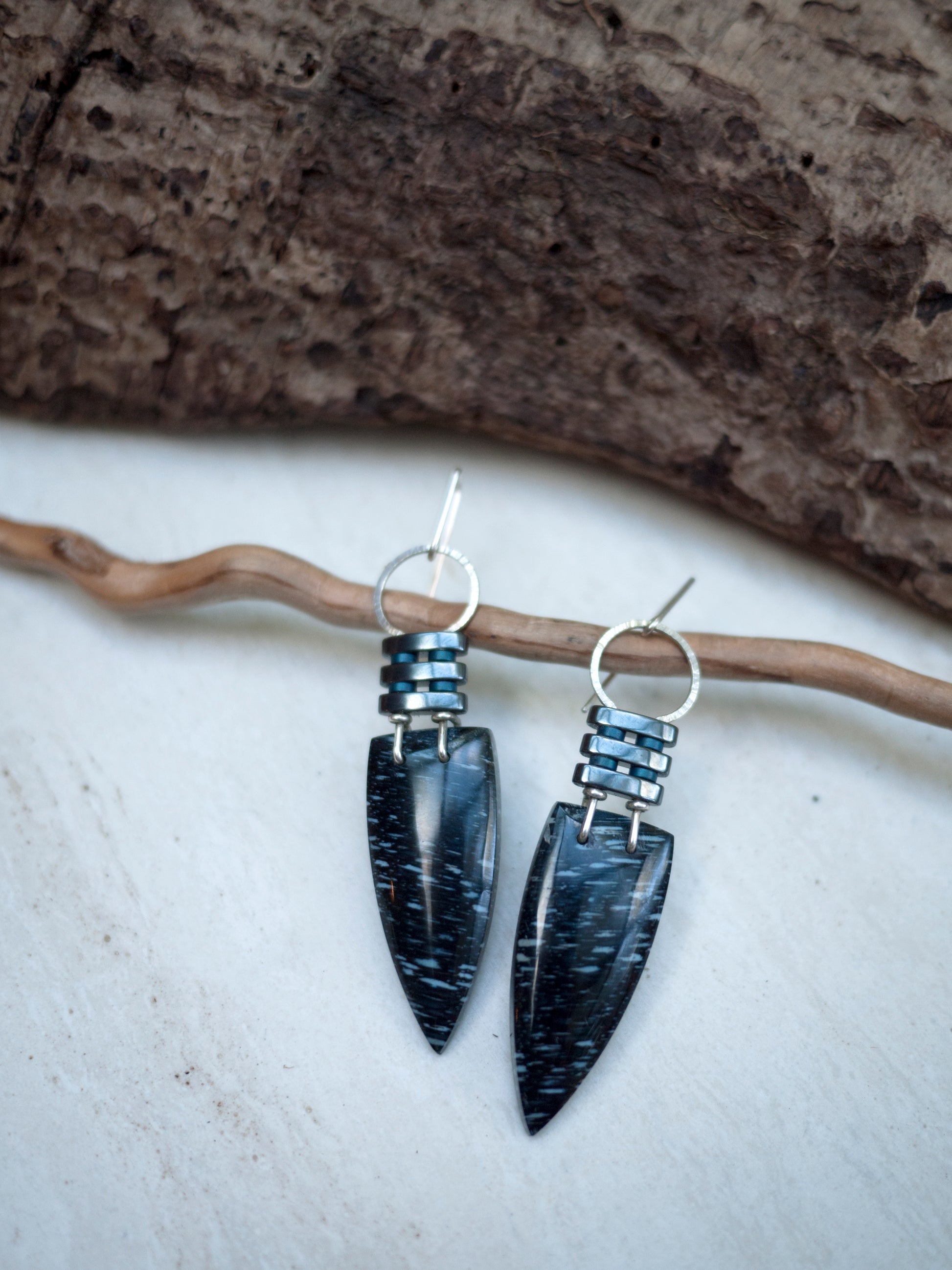 These black petrified palm wood stones have a subtle pattern of grey lines. The simplicity would make them the perfect accessory for any outfit. They dangle from solid sterling silver wire adorned with a three bar motif of hematite beads. A hammered wire circle tops off the look. They dangle from handmade ear wires and come with rubber backings.