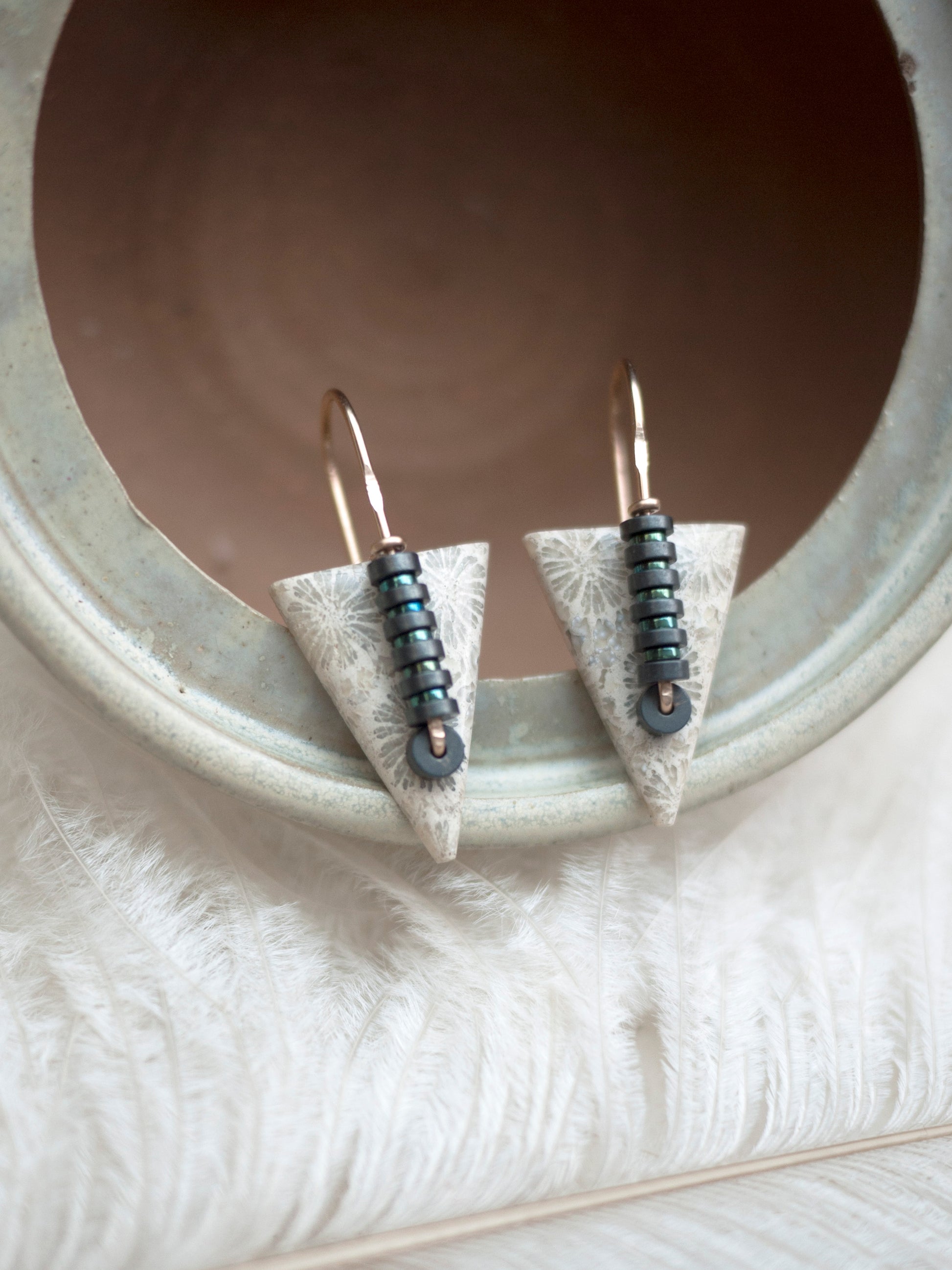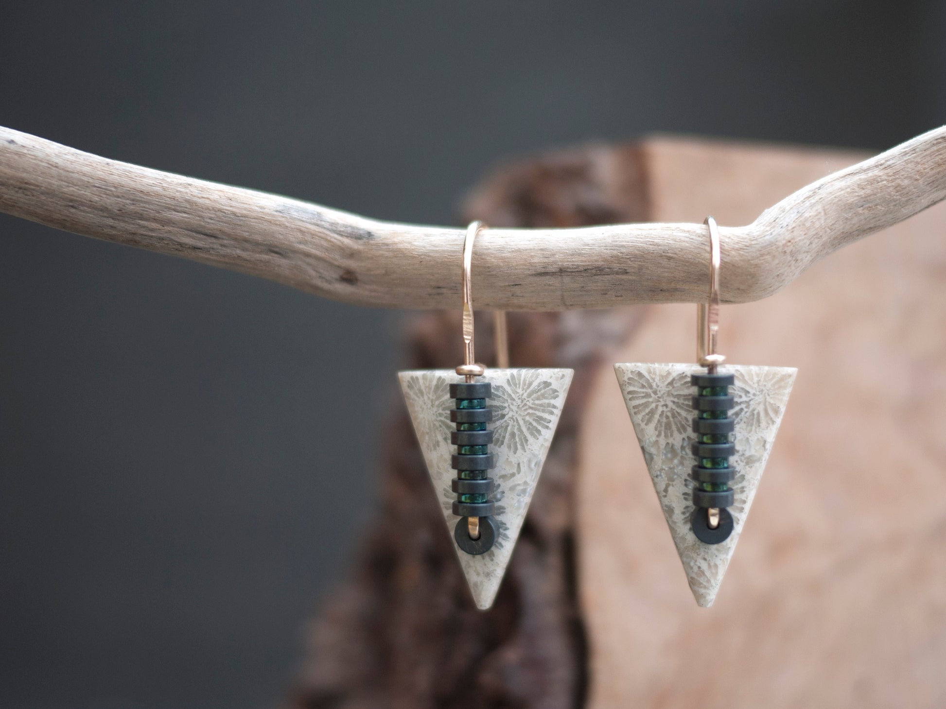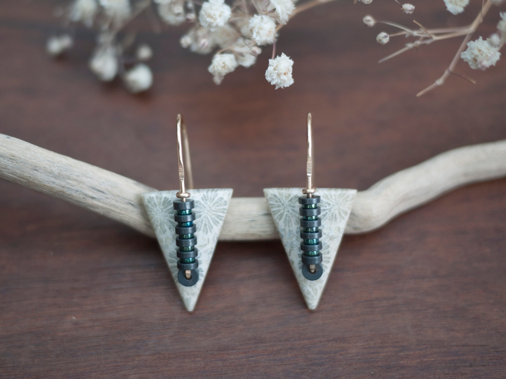 The subtle snowflake pattern on these fossilized coral beads gives them a sophisticated look. Yellow gold fill wire is adorned with a pattern of green and dark gray hematite beads.