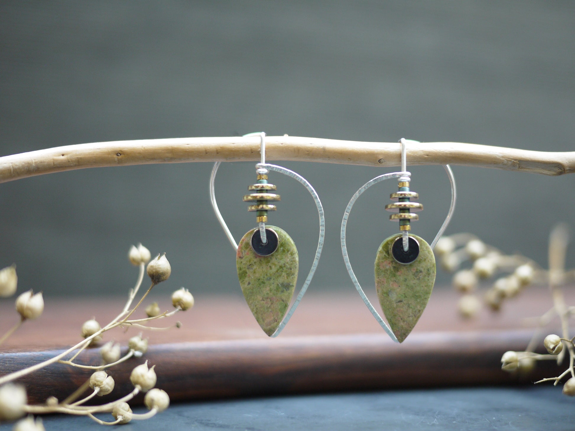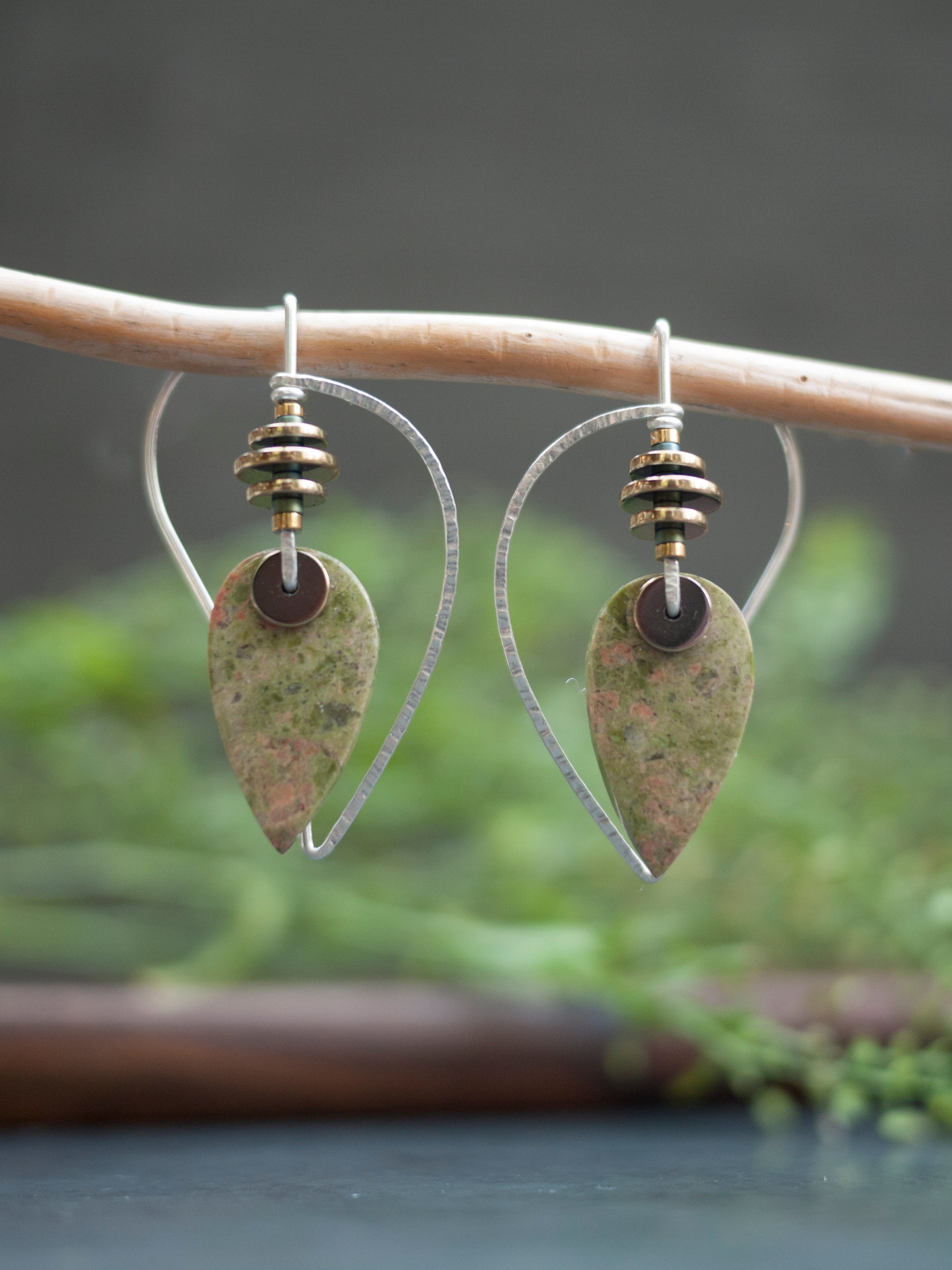 Feel like a green goddess in these unique hand cut unakite stone earrings. Solid sterling silver wire is bent, hammered and adorned with hematite beads. The wire backs are incorporated into the leaf motif. For security these earrings come with rubber backings.