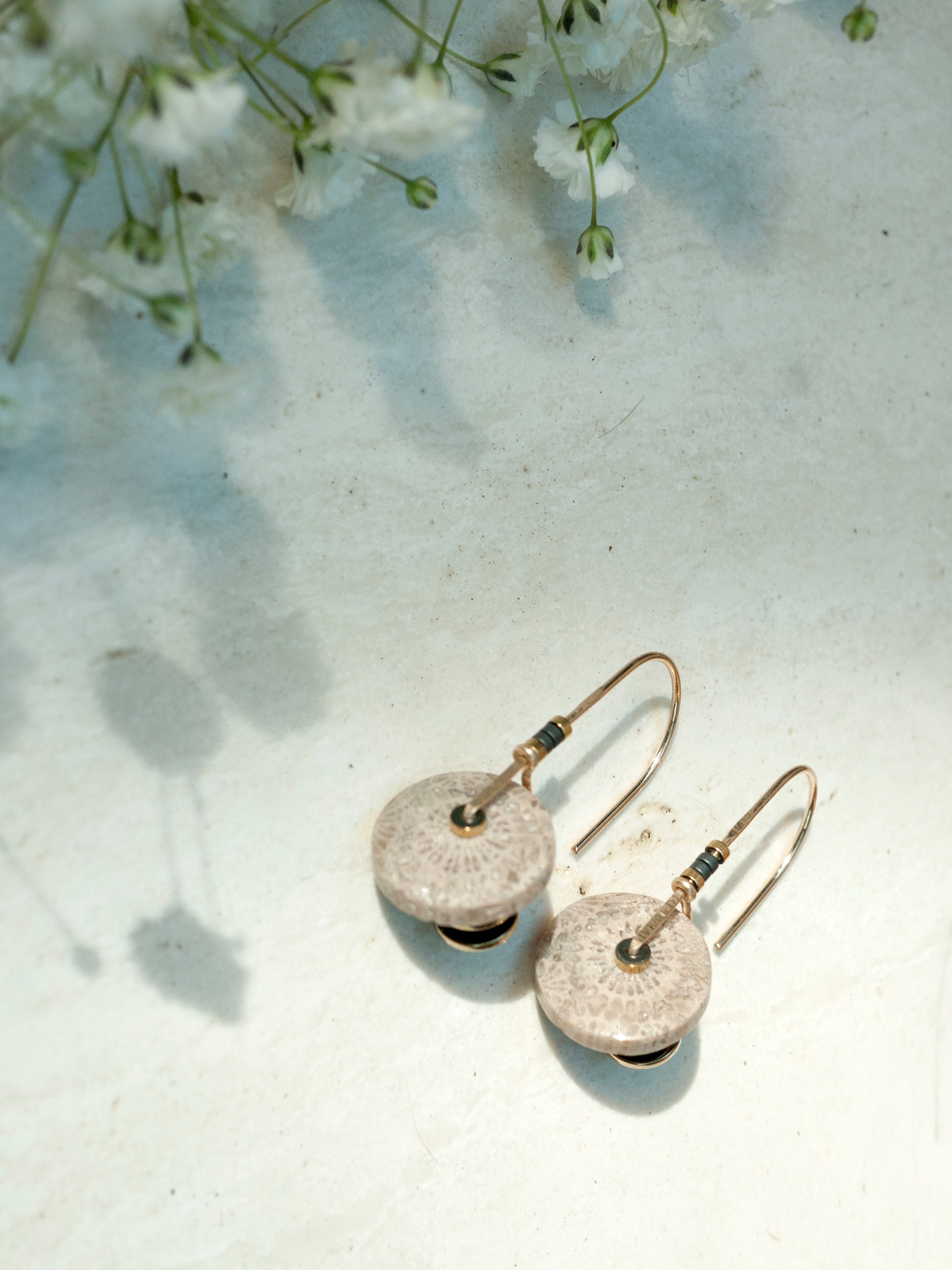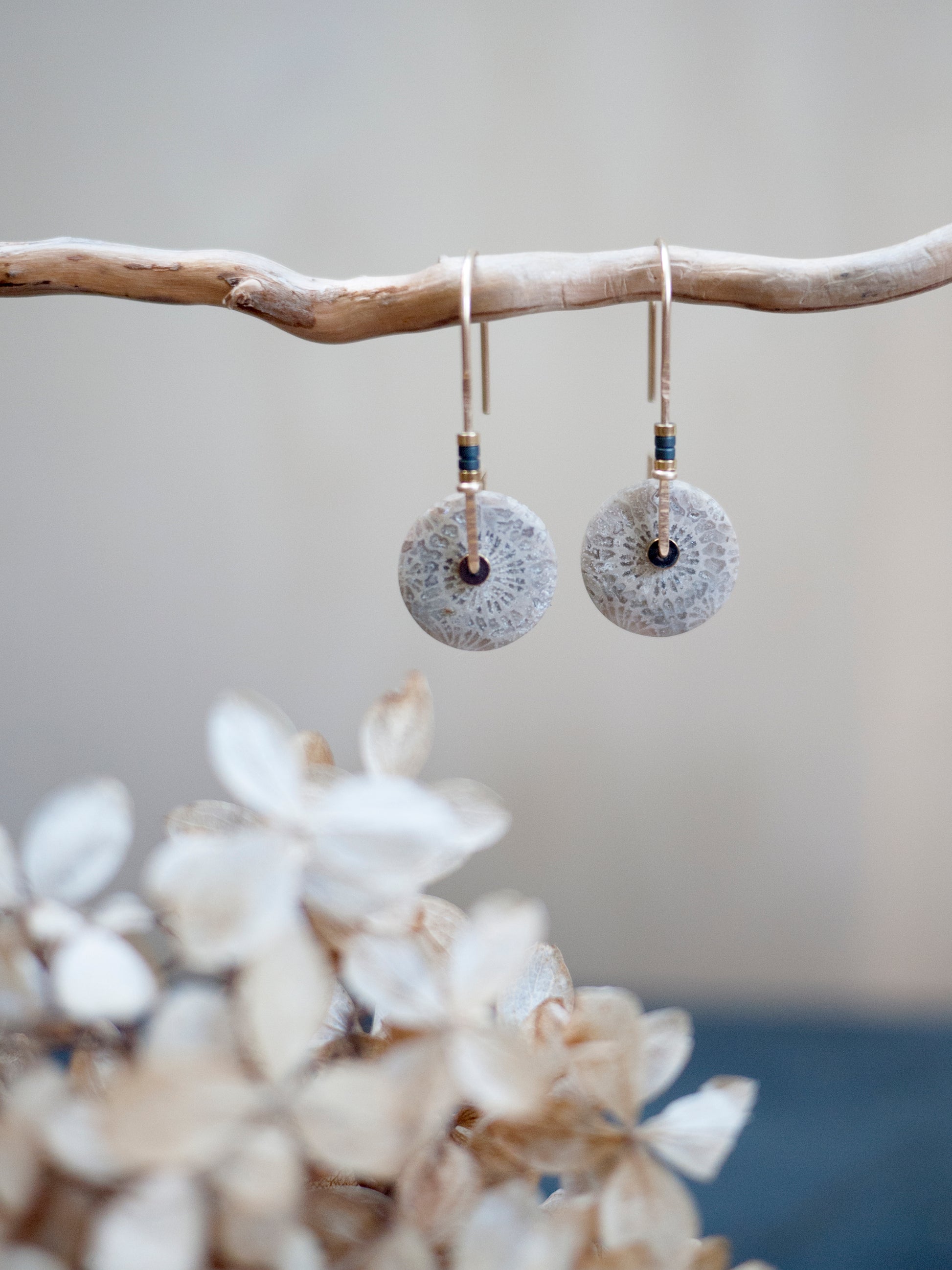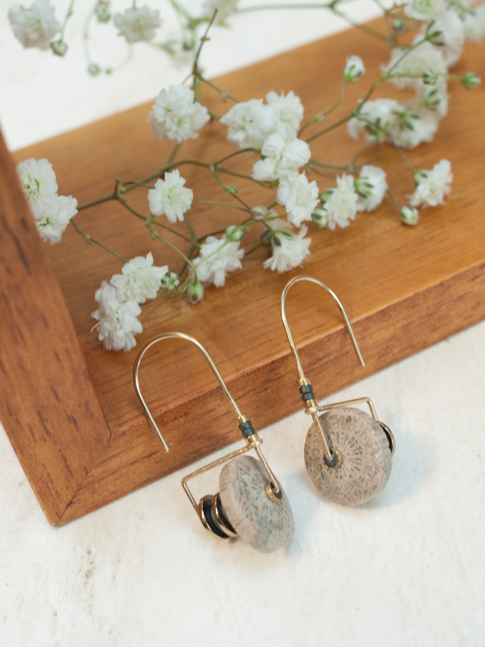 These fun earrings are simple from the front but a party in the back! The yellow gold fill wire is accented with fossil coral discs and hematite beads. In the back, a line of hematite beads make a pleasing pattern and added interest to the earrings. Earrings come with rubber backings.