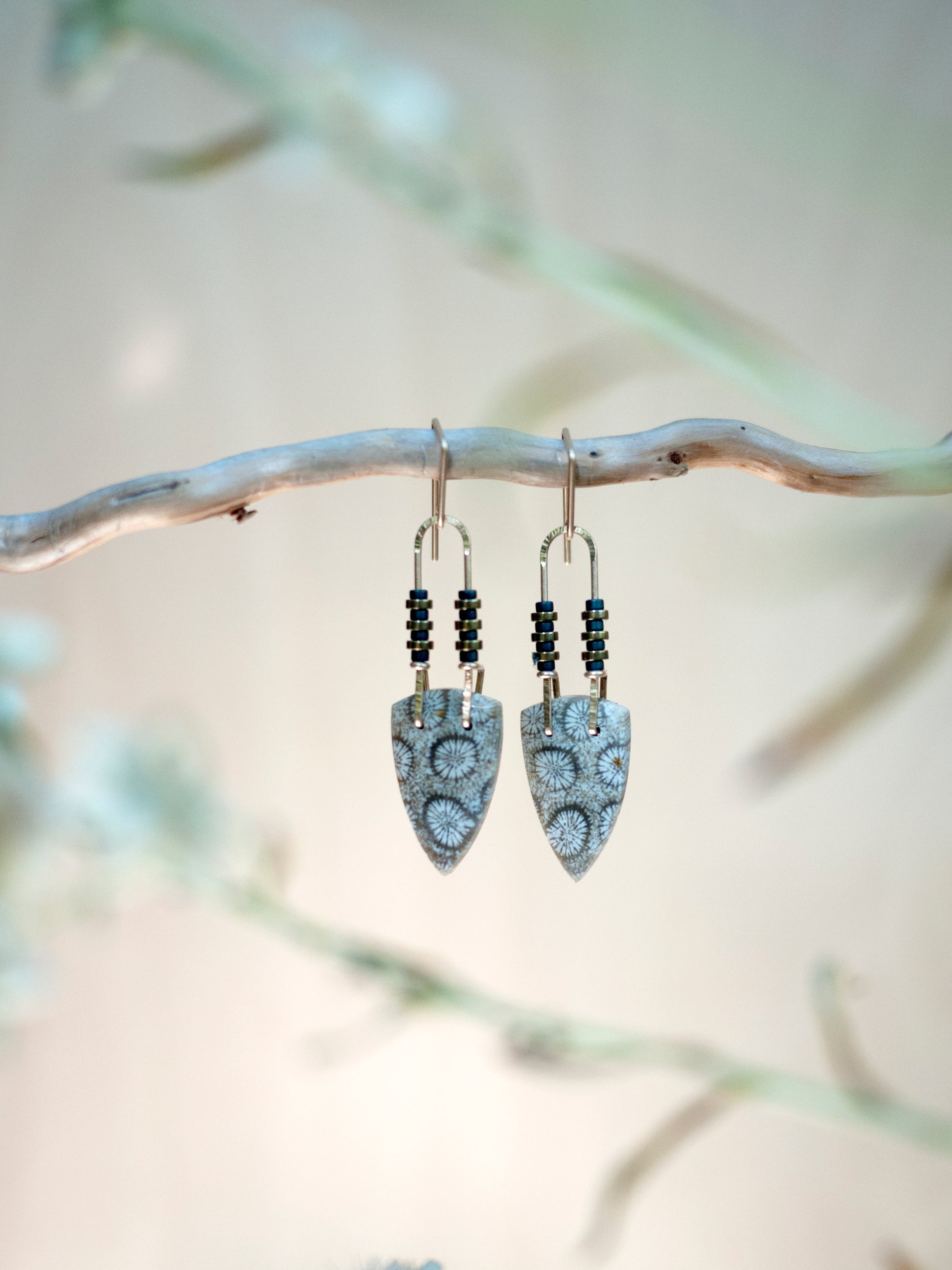 These beautiful fossil coral stones were hand cut for my designs in a collaboration with a lapidary artist from Indonesia. An arch accent of yellow gold filled wire and grey and gold hematite beads create an art deco style line pattern. Earrings dangle from hand made gold fill french hooks. Come with rubber backings