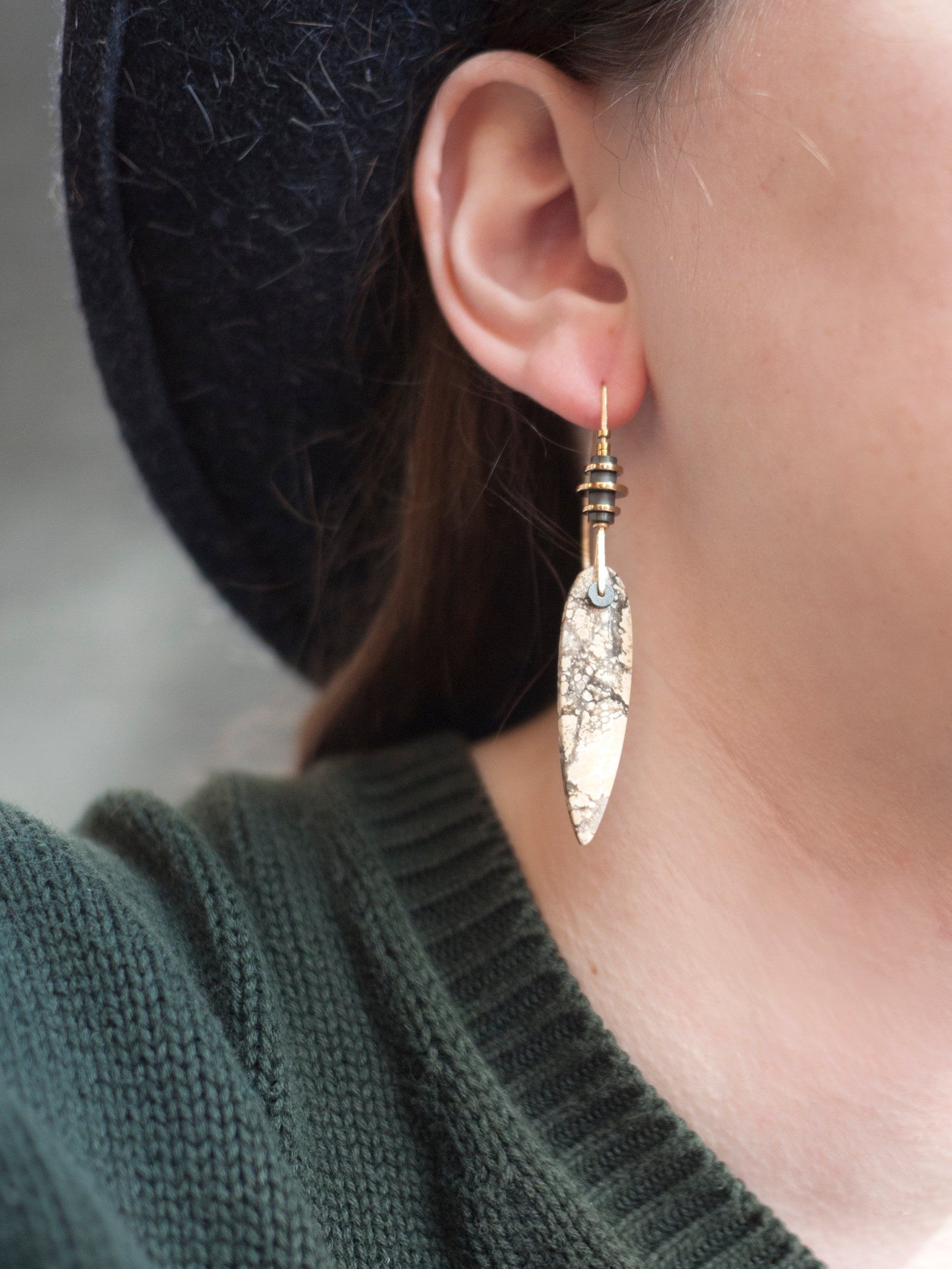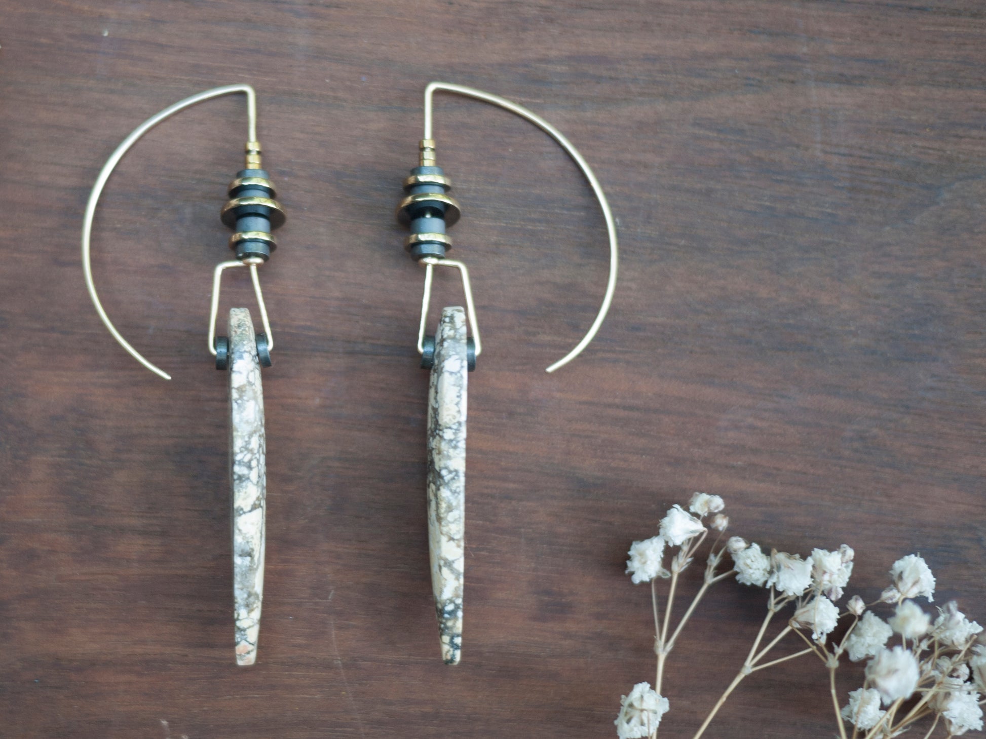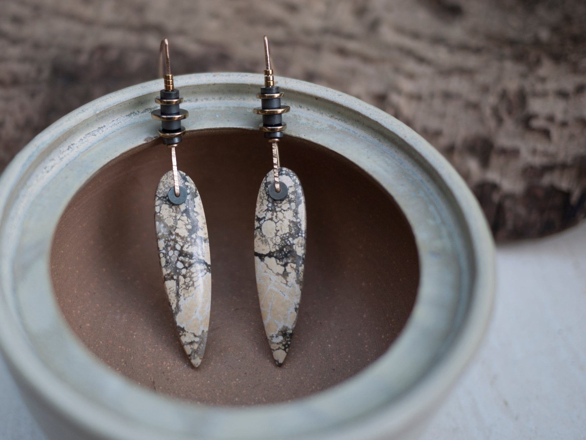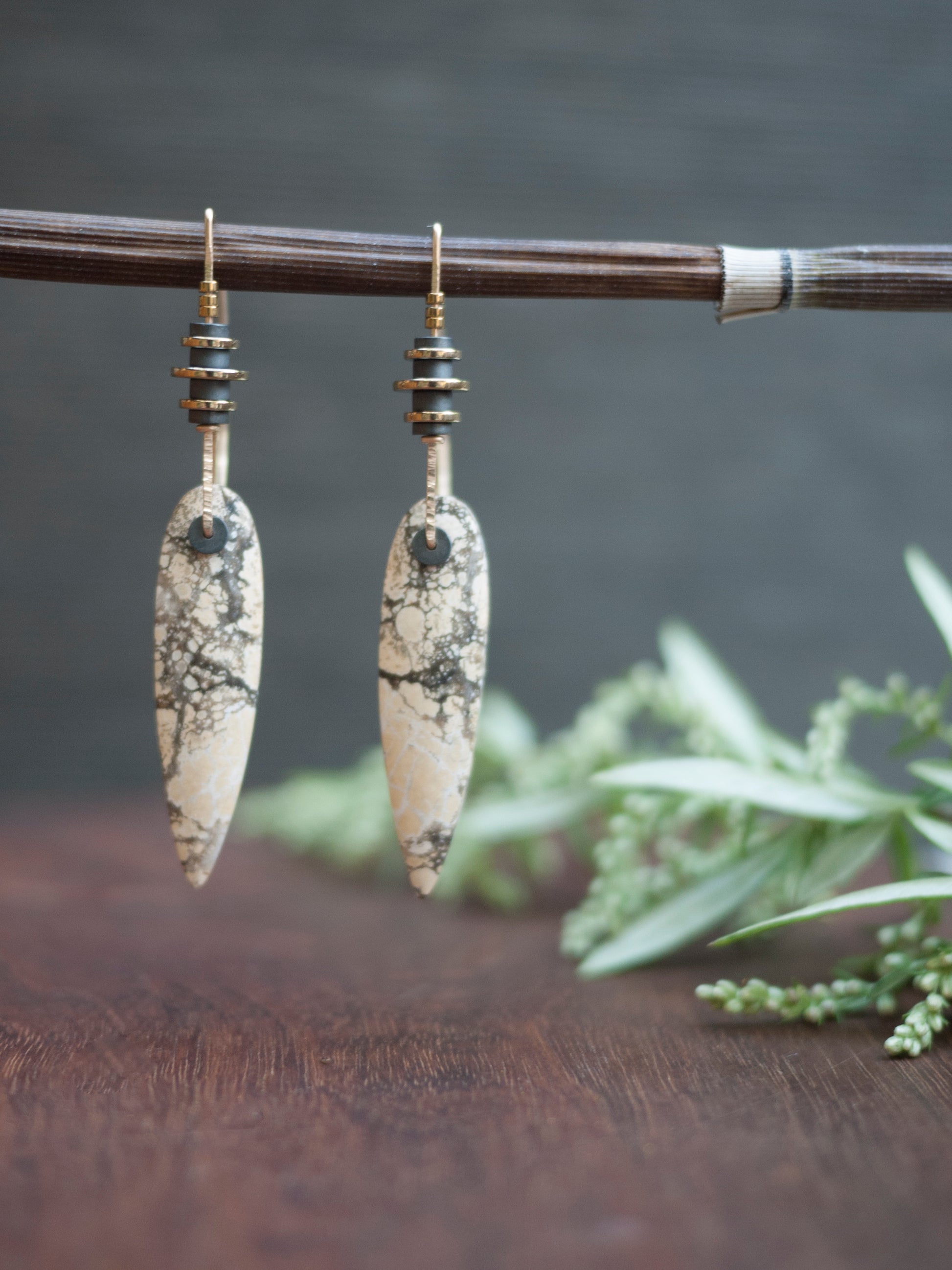 These beautiful magnesite stones were hand cut for my designs in a collaboration with a lapidary artist from Indonesia. Yellow gold fill wire creates an arched ear wire for sculptural interest. The wire is adorned with gold and grey hematite beads. These earrings come with rubber backings.