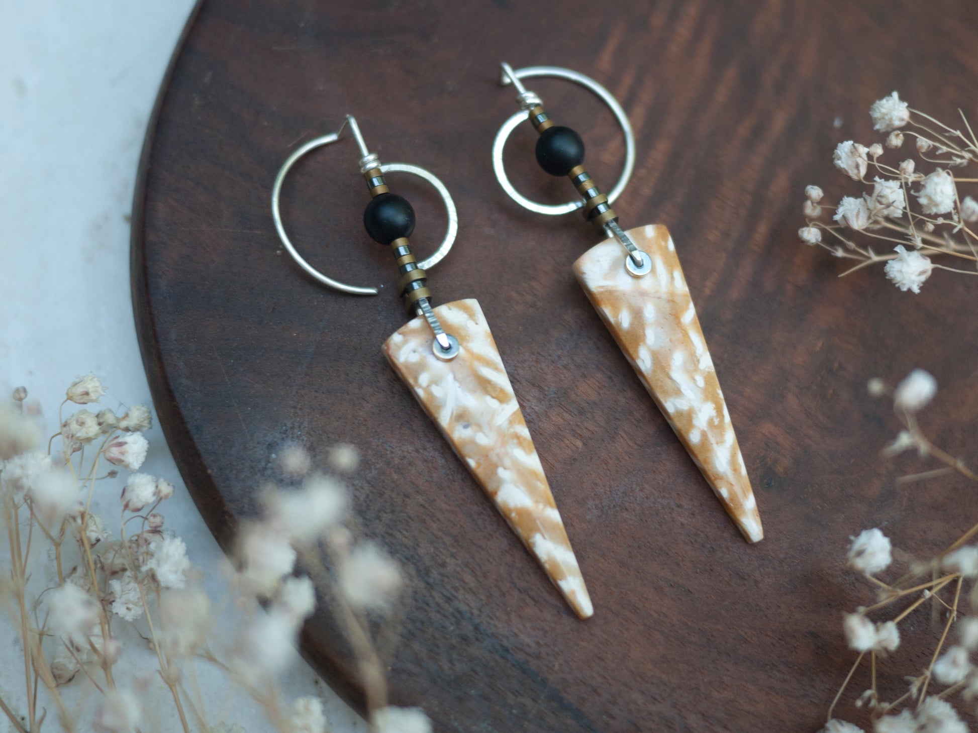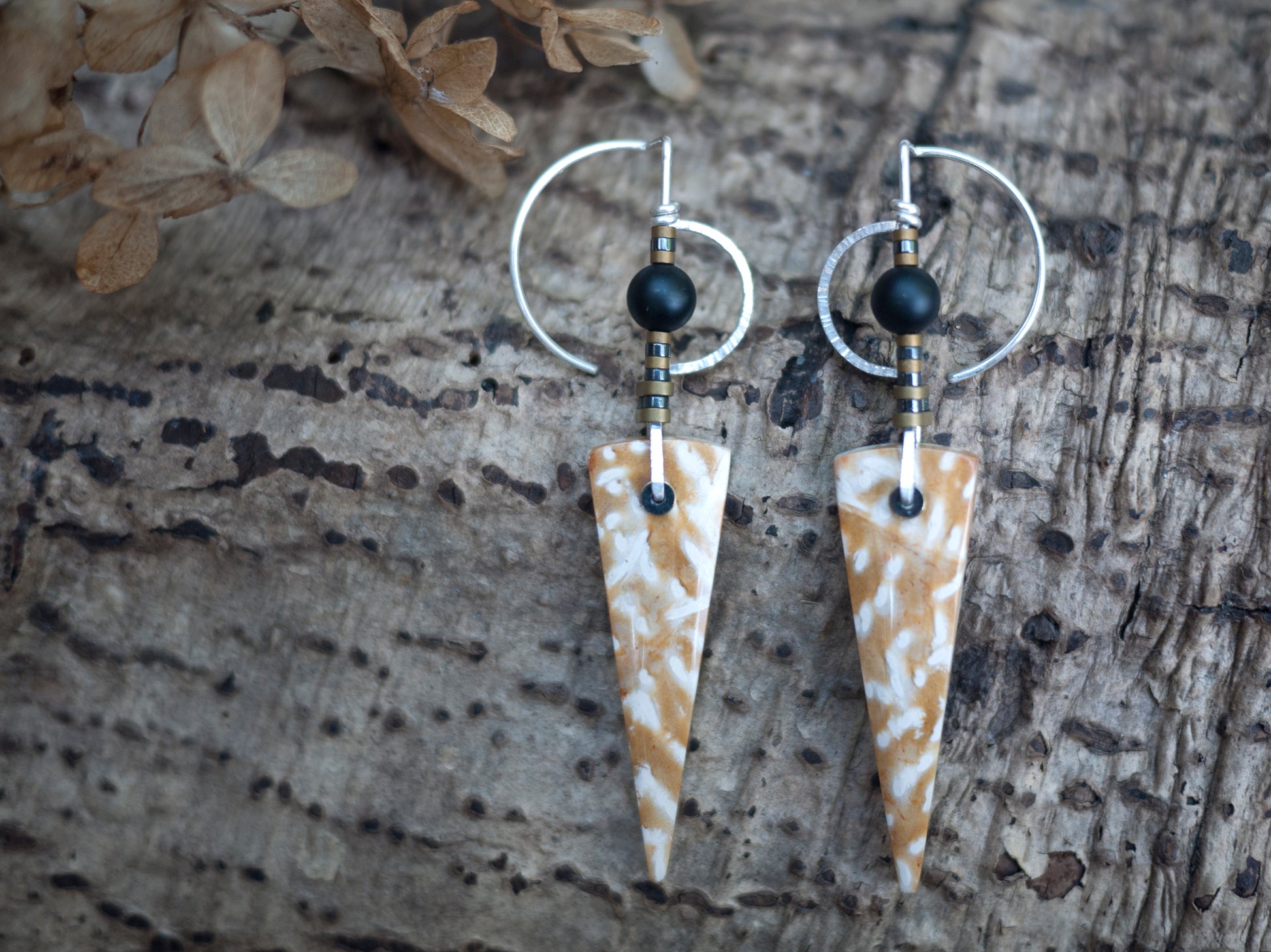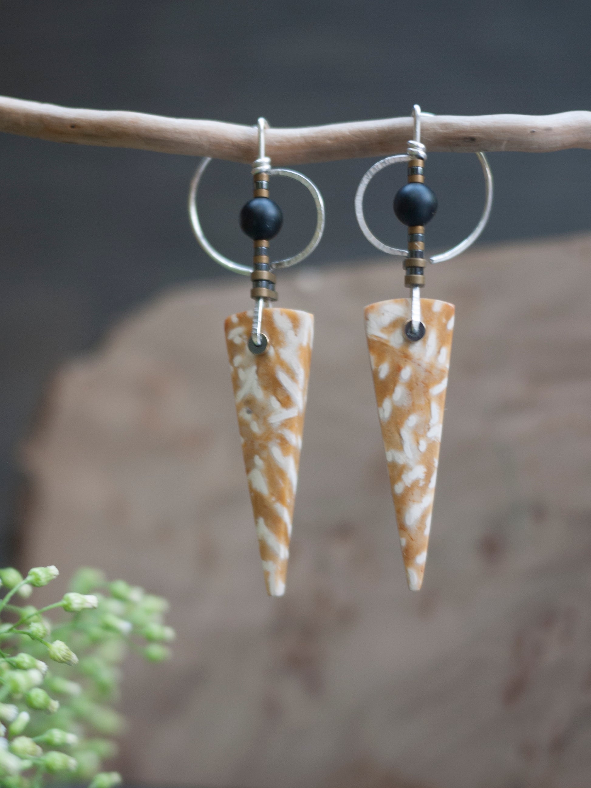 These yellow palm wood stones have a striking line yellow and white line pattern. The stones hang from solid sterling silver wire adorned in gray and gold hematite beads. These earrings have unique shaped ear wires that look beautiful when worn.