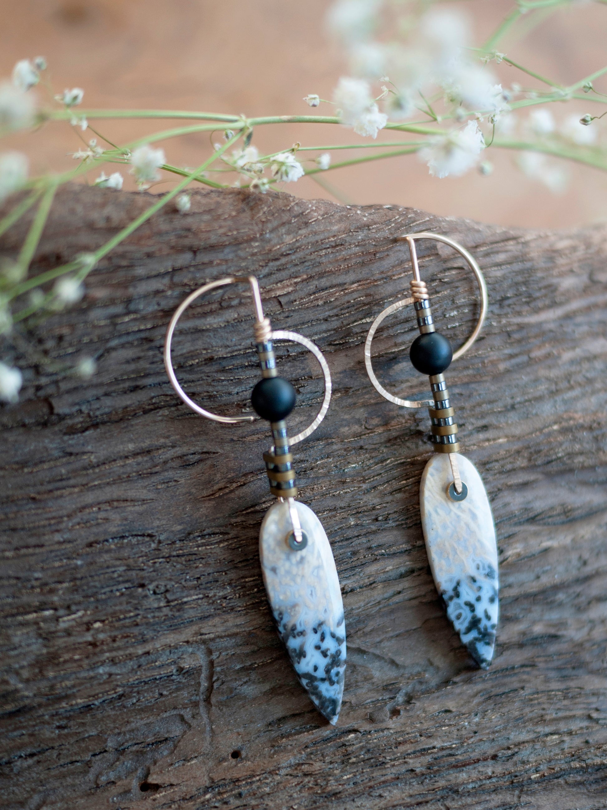 These natural yellow and cream palm wood stones have a striking dipped effect where the tips change to black. The stones hang from yellow gold fill wire adorned in gray and gold hematite beads. These earrings have unique shaped ear wires that look beautiful when worn. Earrings come with rubber backings.