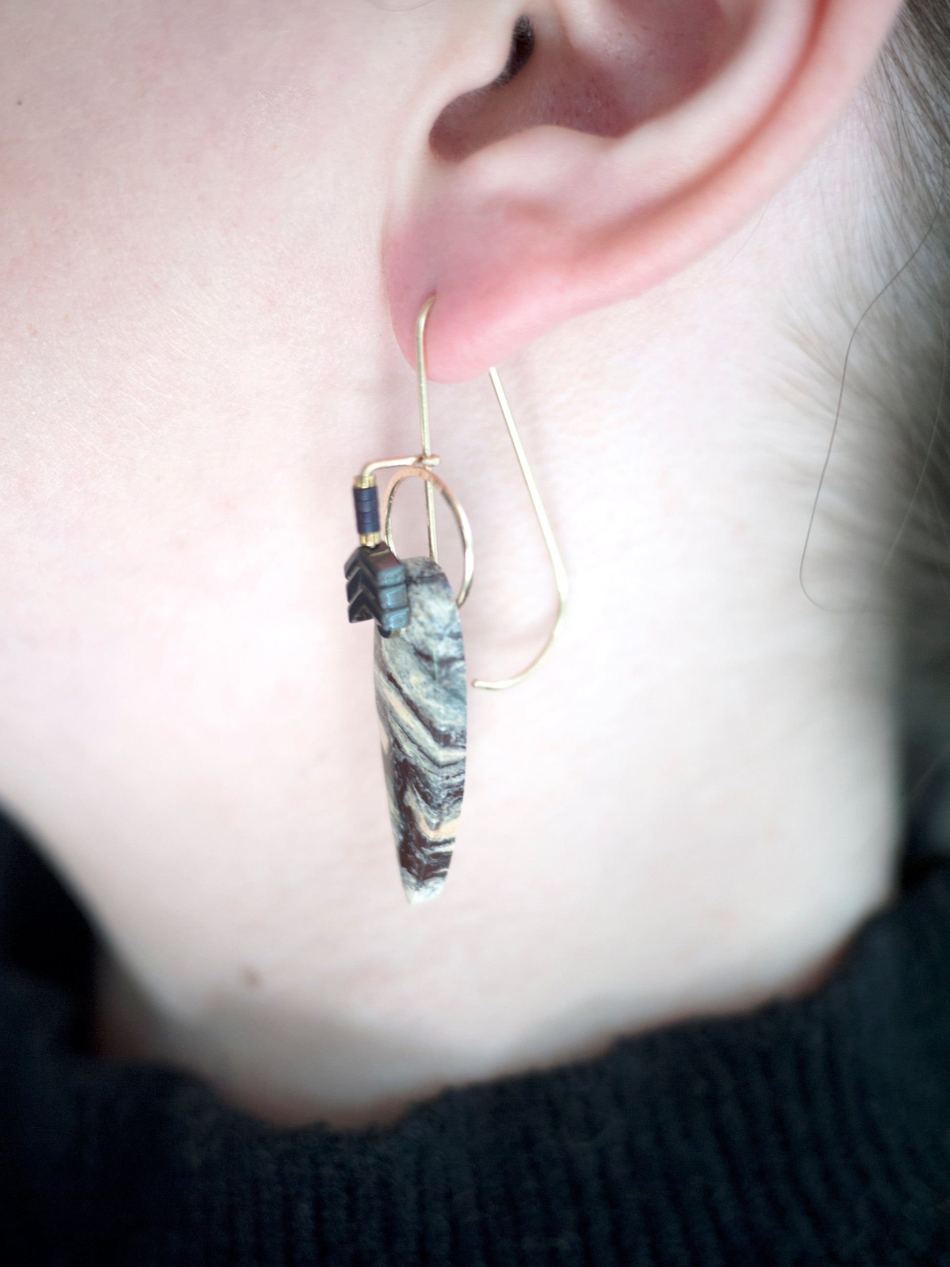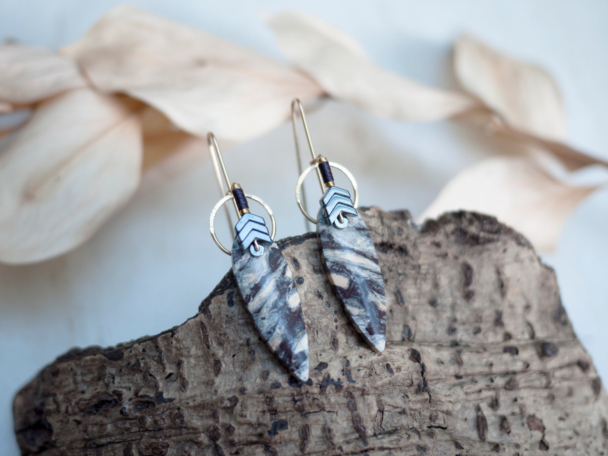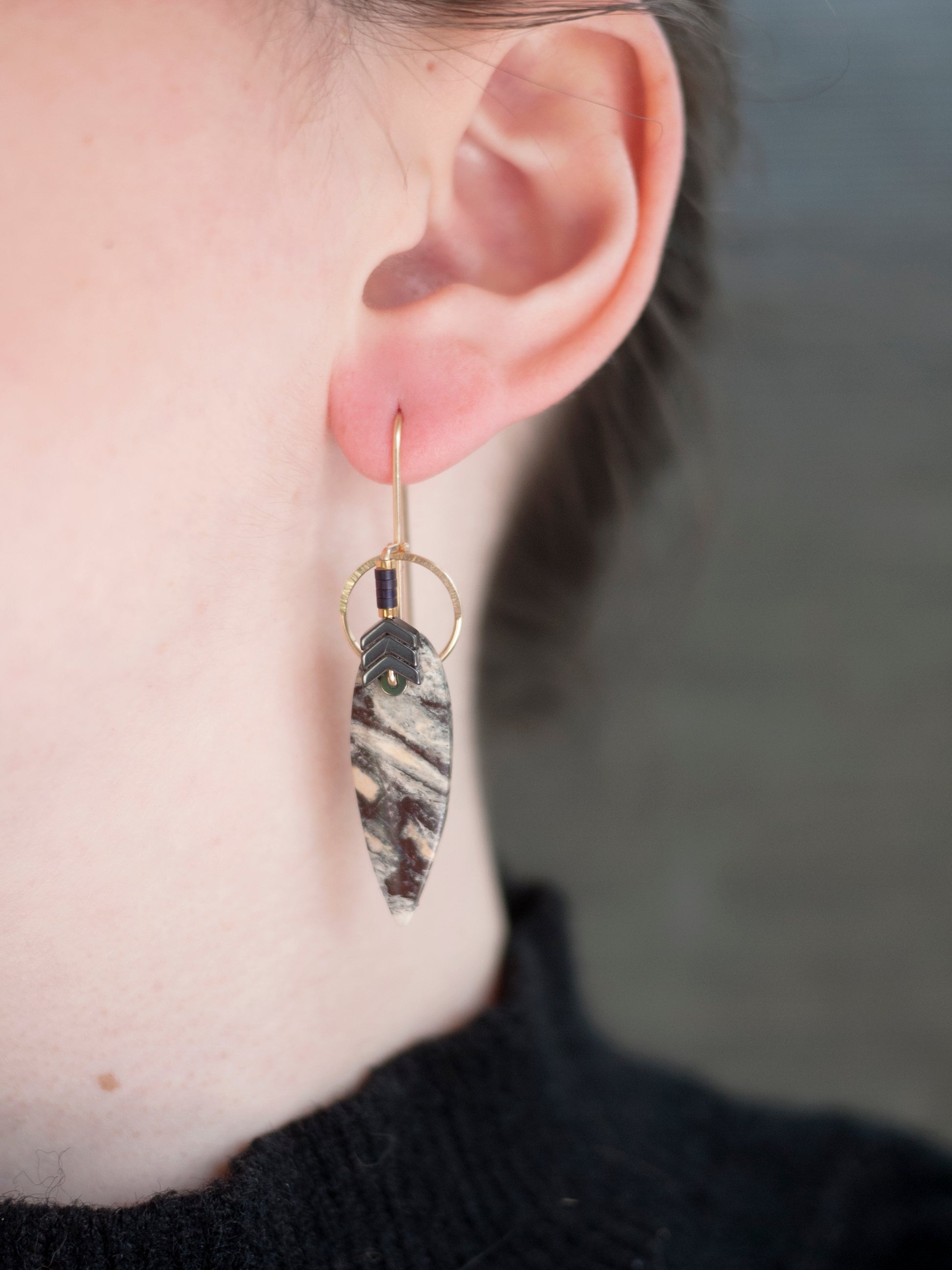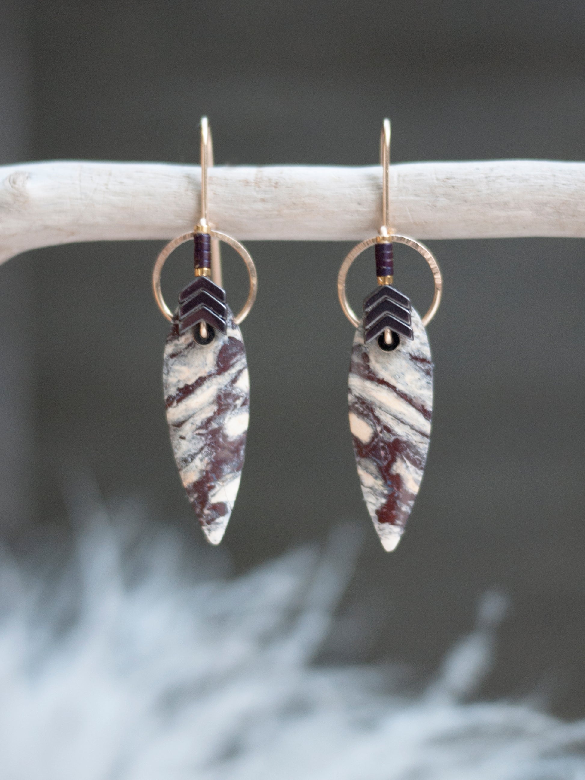 I love the subtle pattern on these hand cut zebra jasper stones. The spear shape stones are adorned with hand formed gold filled wire. Copper colored chevron shaped hematite beads adorn the wire. The wire circle is hammered to add sparkle and texture. These earrings come with rubber backings.