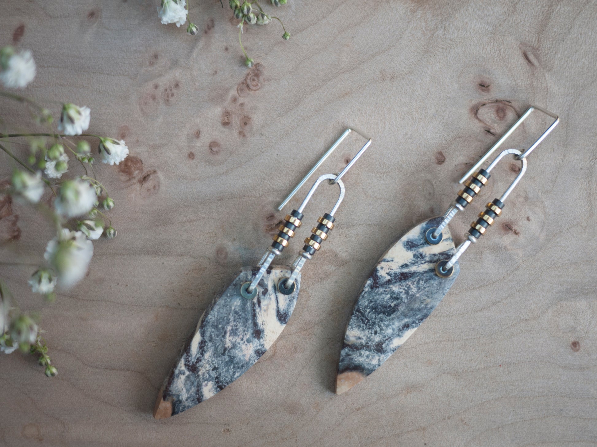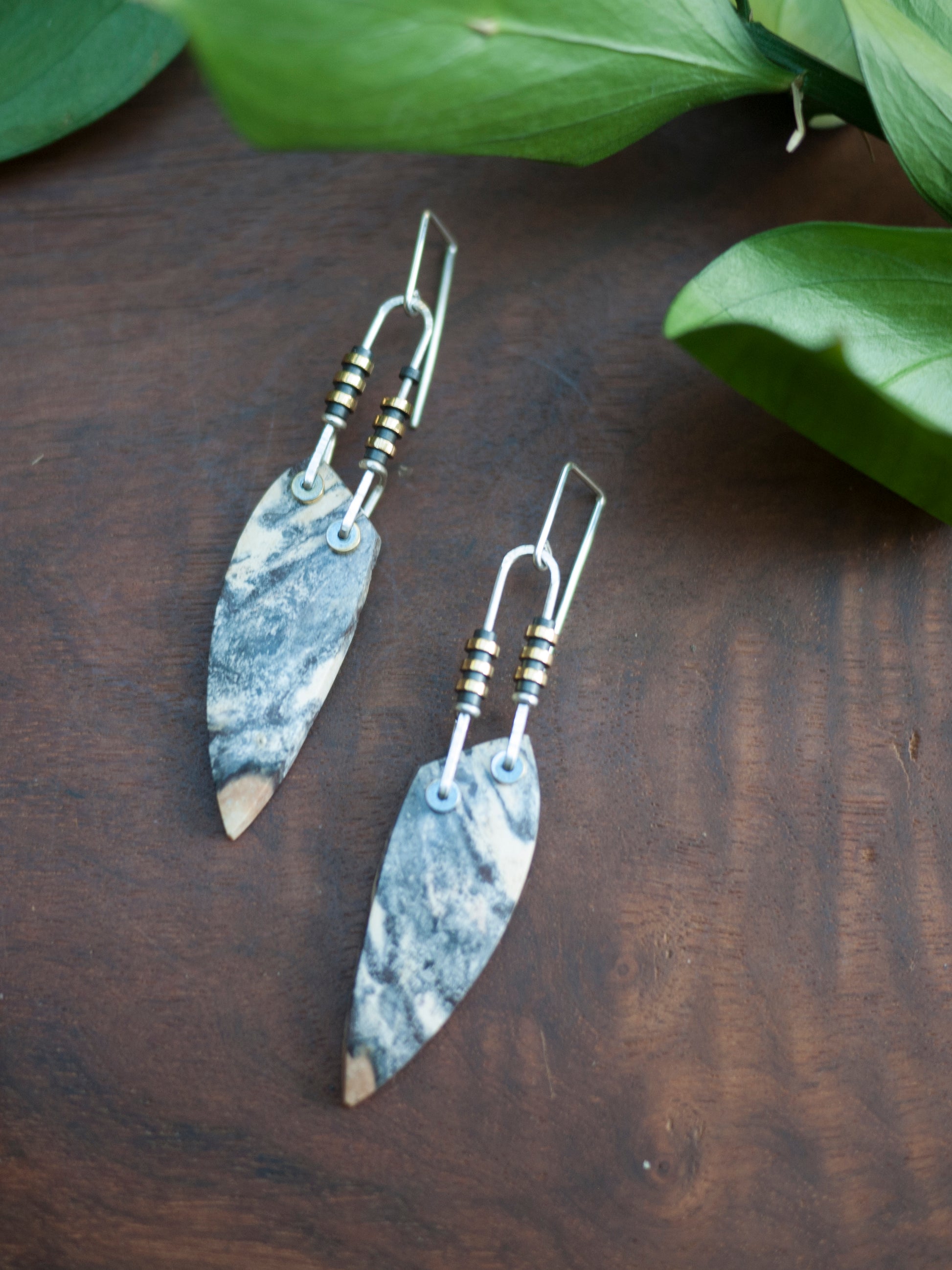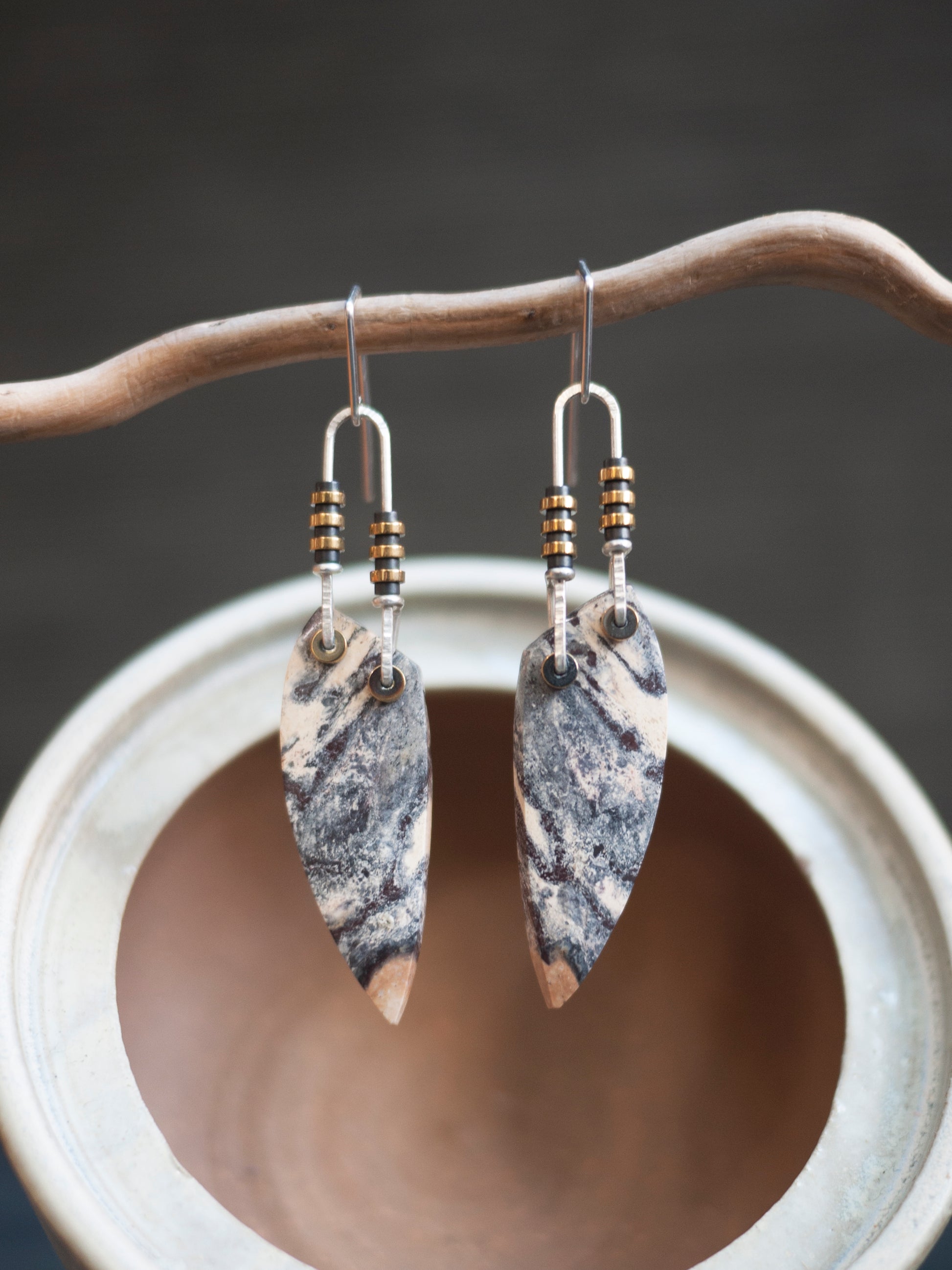 Looking for a striking jewelry accessory that will surely make a statement? These unique gray and beige zebra jasper earrings could be the perfect fit! Made in sterling silver, these earrings have a hammered arch adorned with hematite beads.